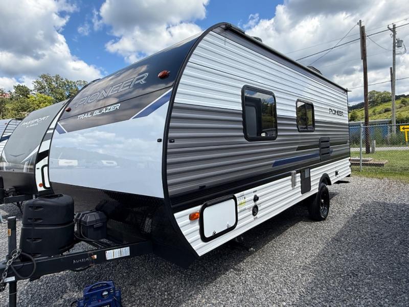 With any Pioneer single axle travel trailers by Heartland, there is 8-foot wide standard construction with aluminum exterior metal, a one-piece, seamless rubber roof, and a diamond plate stone guard to protect against road debris. Inside you will find ball bearing drawer guides, a chalkboard note station, a double bowl stainless steel sink for easy cleanup, and an innerspring mattress. Be a Pioneer, and choose your own journey with all the amenities needed with an easy to tow trailer to all the places you have been wanting to visit!