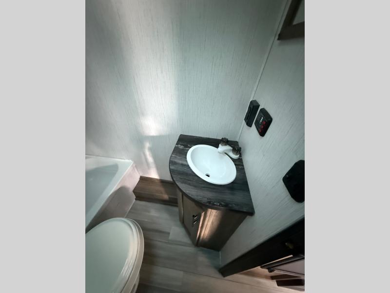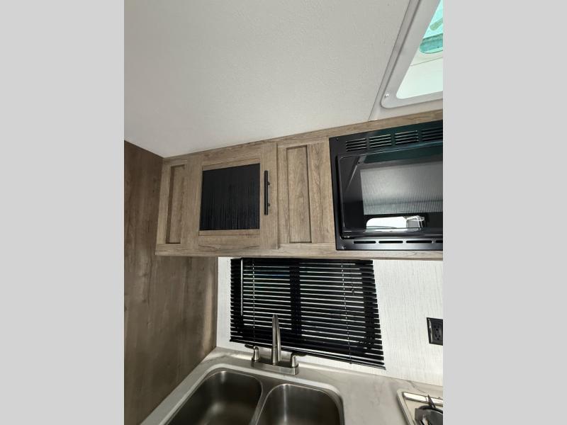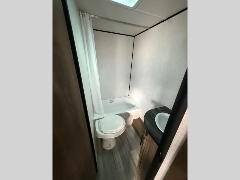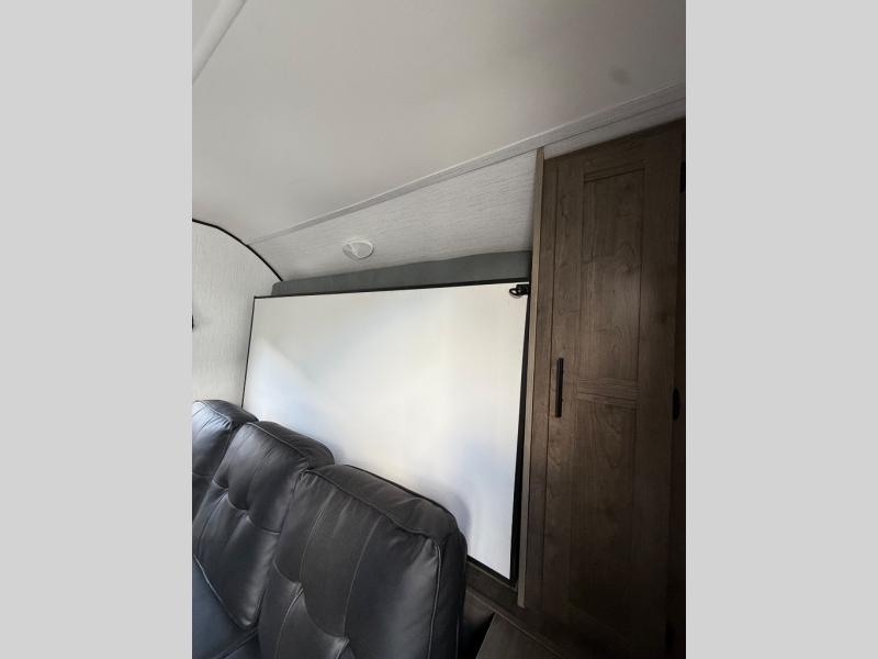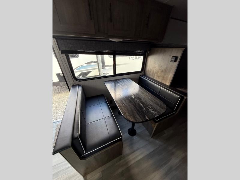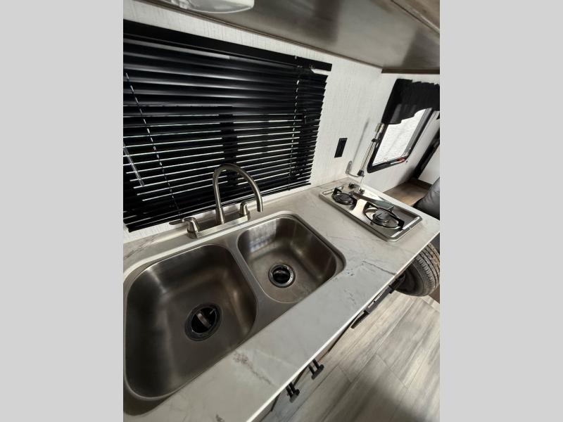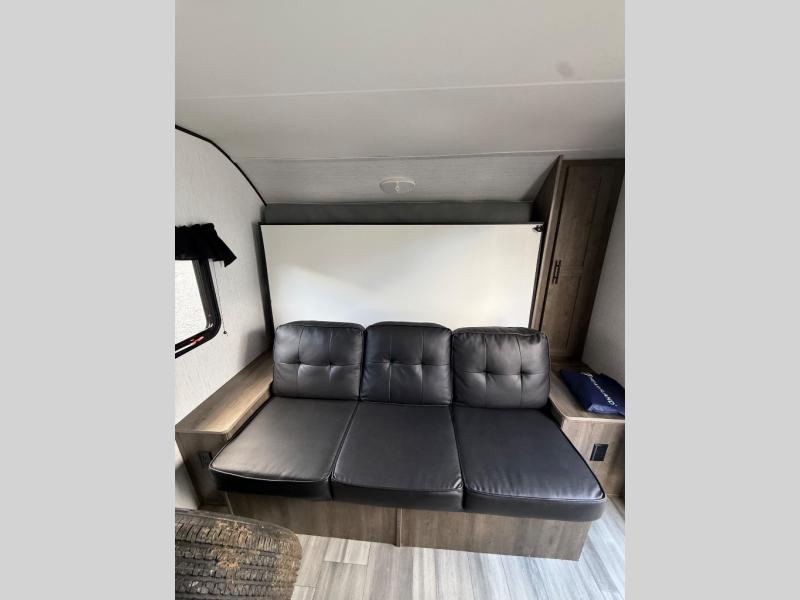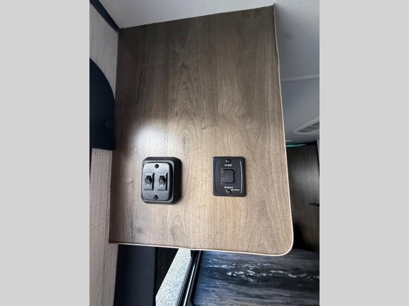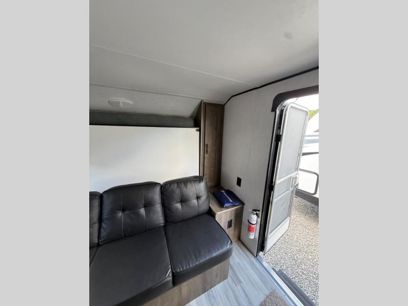 Easy to store and easy to tow, this Pioneer will allow you and your group enough sleeping space for seven with the front Murphy queen bed, the double-size bunks in the rear next to the full bathroom, and the booth dinette once setup for nighttime. You will find storage in the front shirt closet, under the bunks, and in overhead cabinets. There is a two-burner cooktop, a microwave and a 6 cu. ft. refrigerator to make meals, plus you can use the outside camp kitchen. And don't forget about the 14' power awning that creates an outdoor living area protected from the elements.
