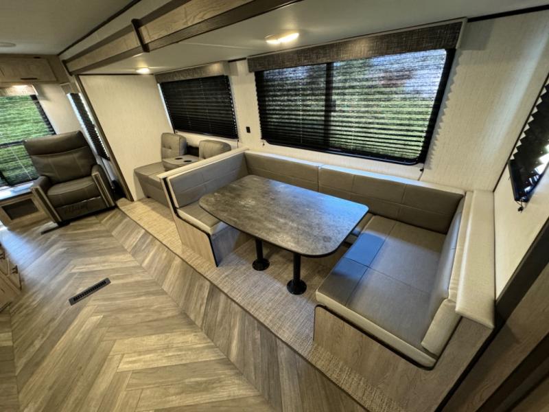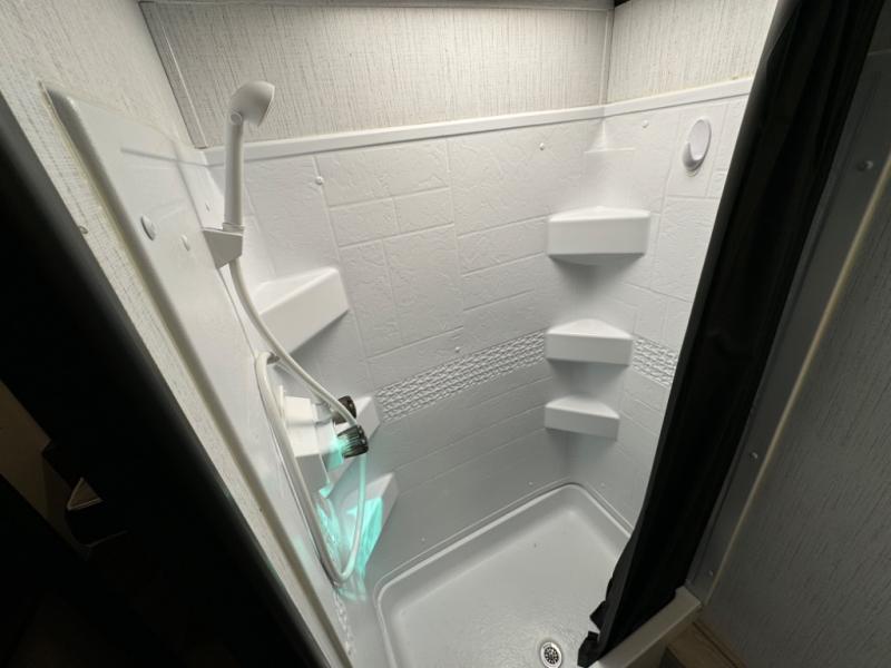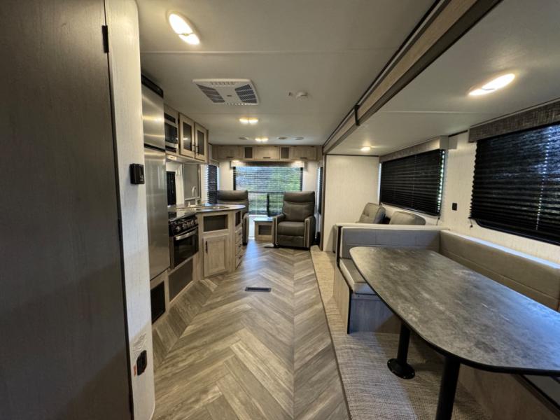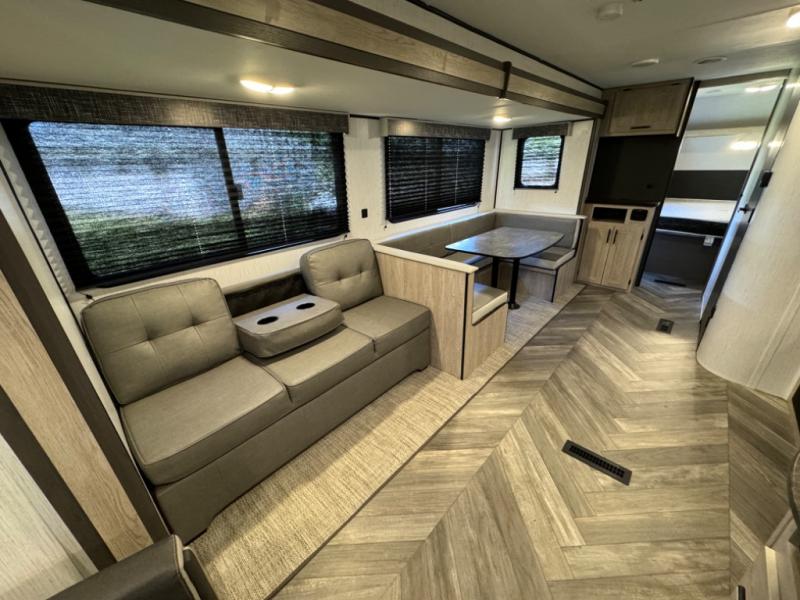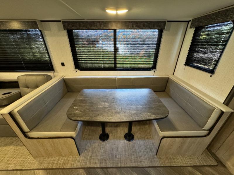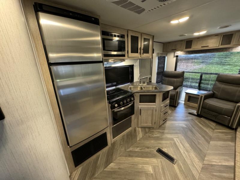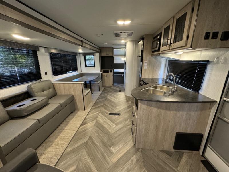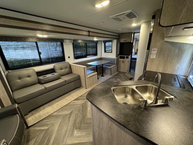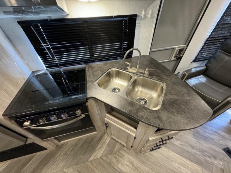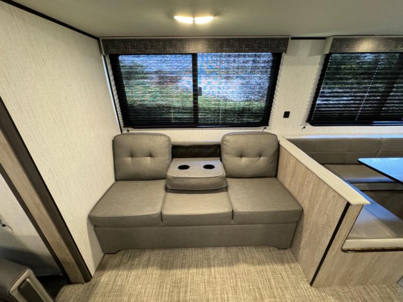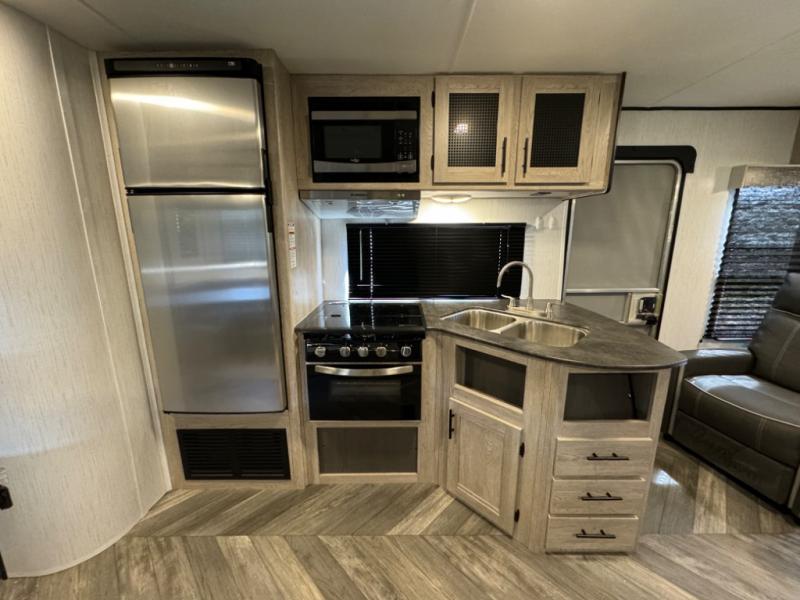 Enjoy added interior space with this travel trailer in tow. The large slide out will provide space to let the dog nap on the floor, and you can dine around the U-shaped dinette or play a game of cards. There is also a sofa and dual lounge chairs for more seating space. This model includes a three burner cooktop and a microwave oven to prepare meals each day, plus a stainless steel 12V refrigerator to store perishables.