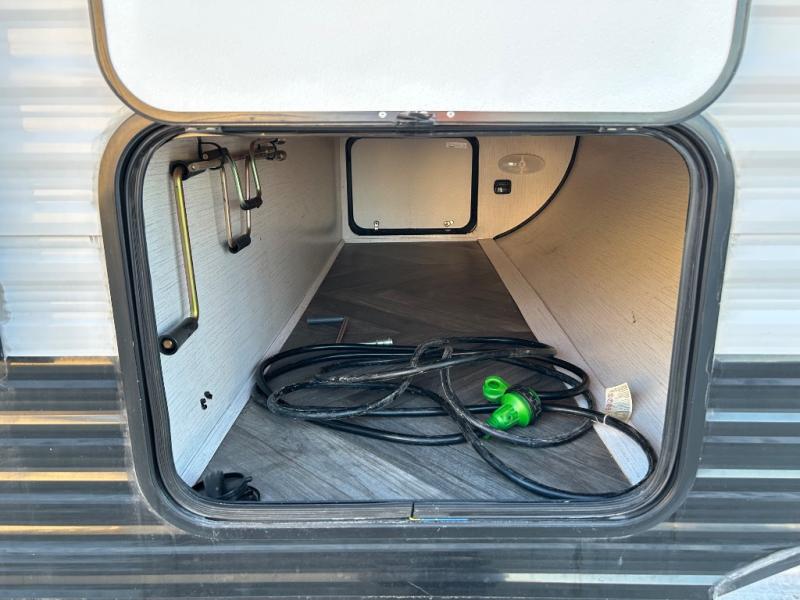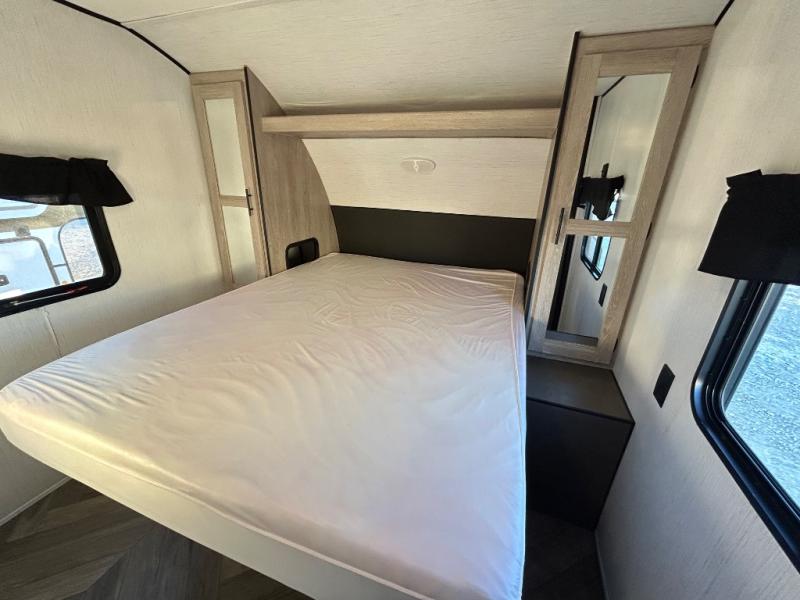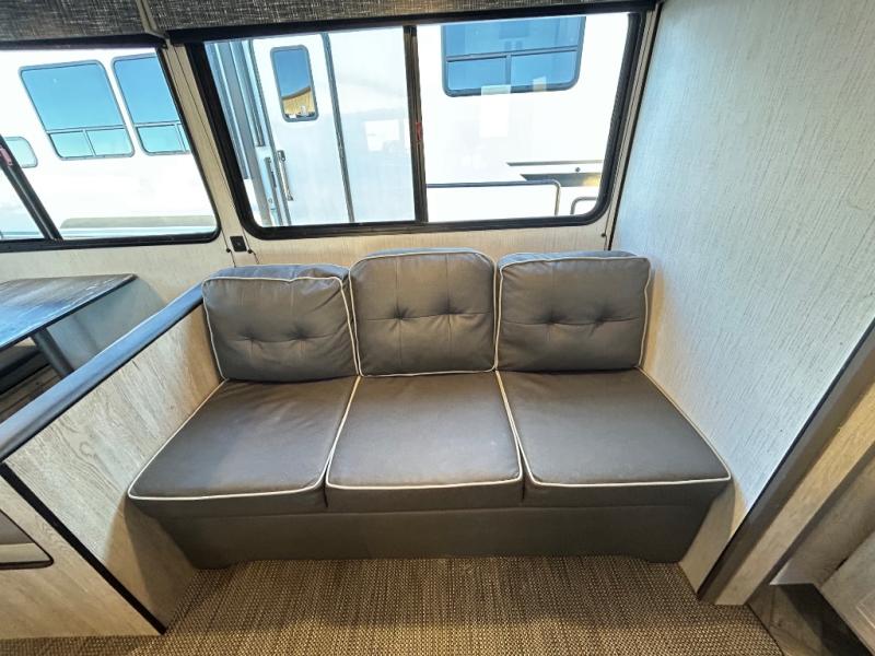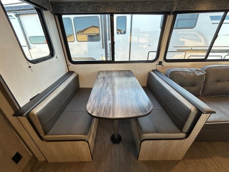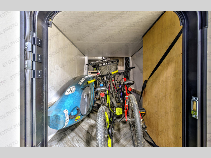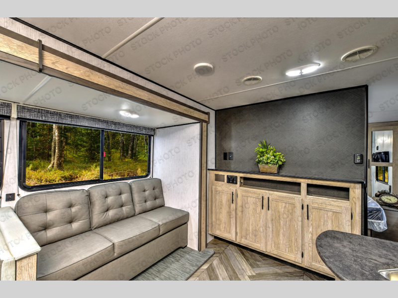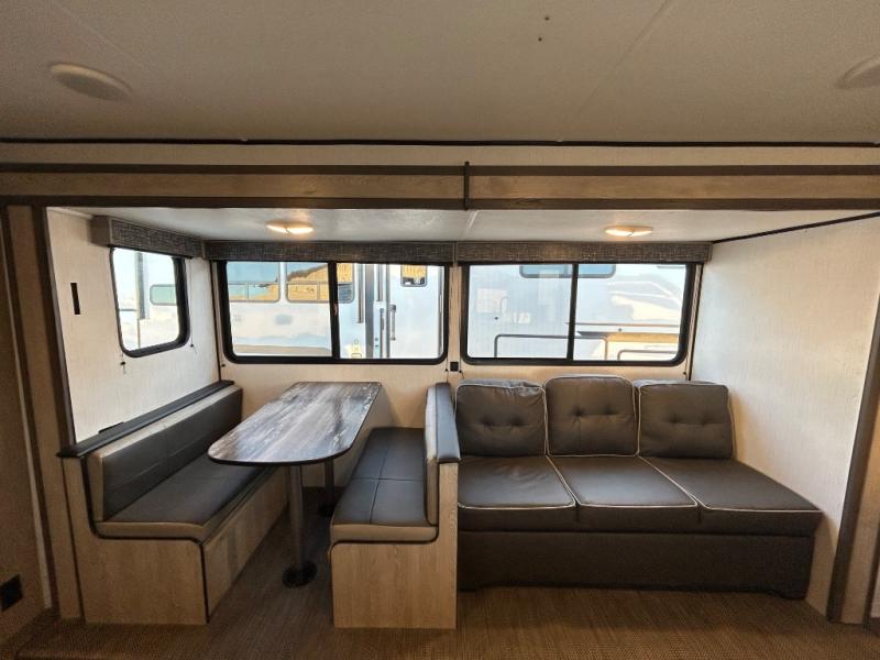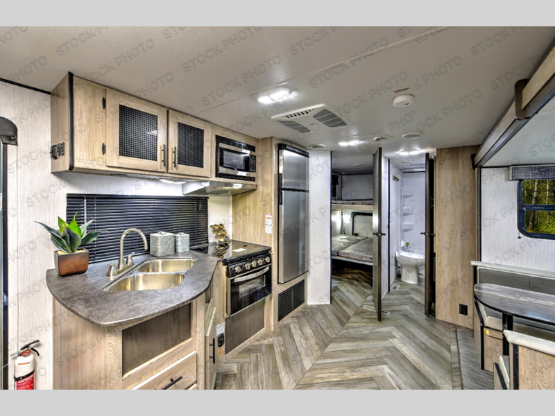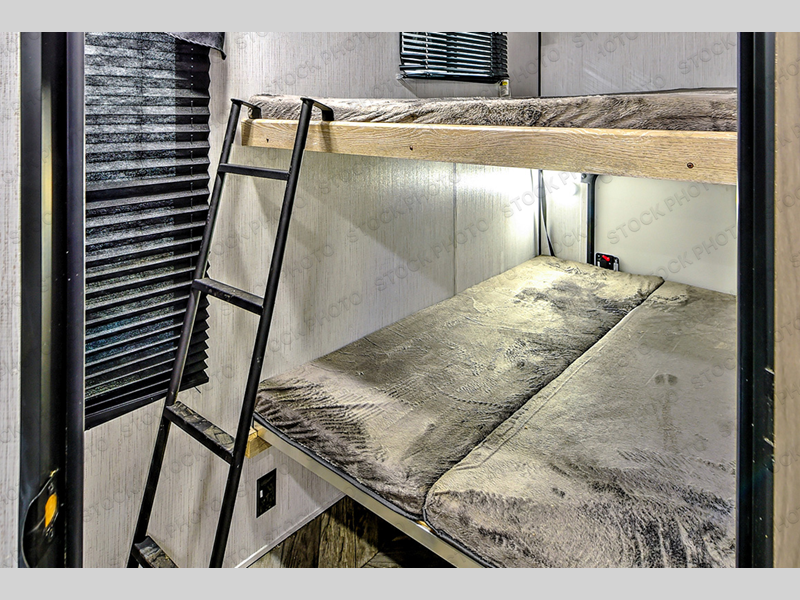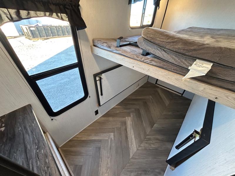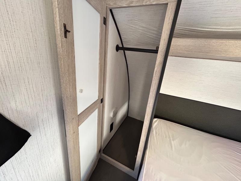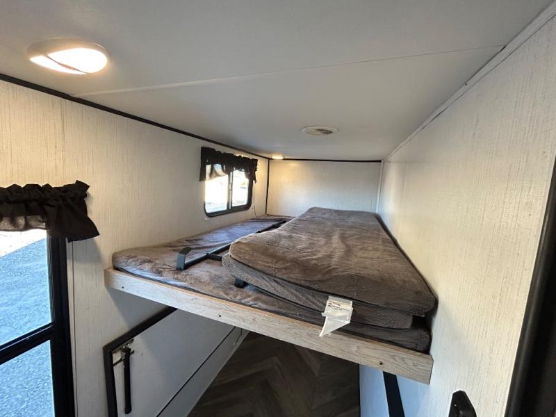 Trips to the lake are fun in this spacious travel trailer that can sleep eight people each night. The exterior storage door allows you to bring along bikes or a kayak with the under-bunk storage, and there is even a door to close off the bunks for privacy. The main living area includes a large slide out with a sofa and a booth dinette to dine, relax, and sleep more friends. Prepare a meal on the three burner cooktop before heading outdoors for the day, and when you return the full bath will be waiting for you. This model also includes a front private bedroom that will feel just like home, and you'll appreciate dual shirt closets to keep your clothes tidy!