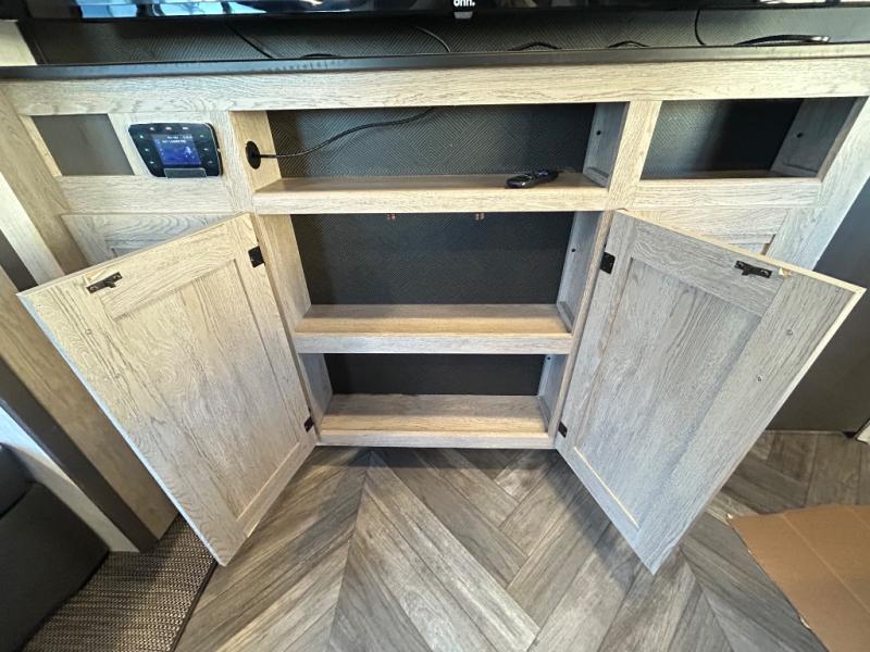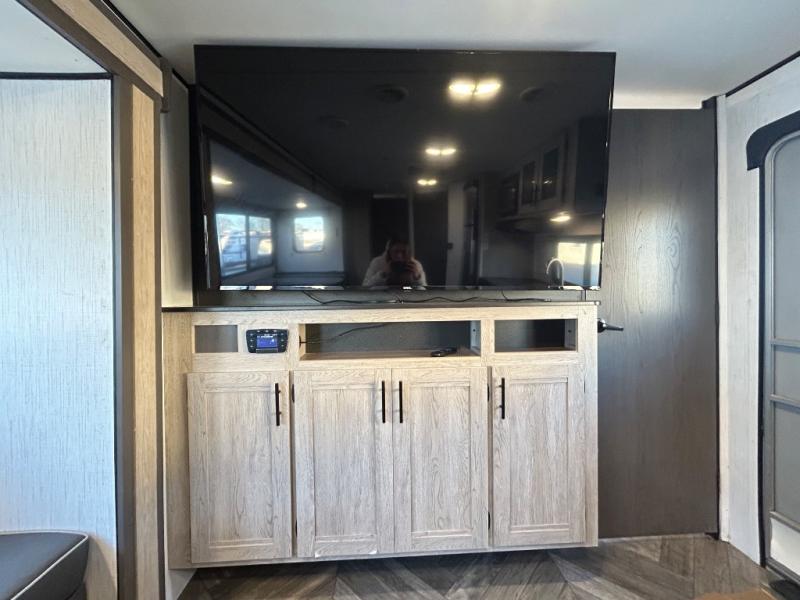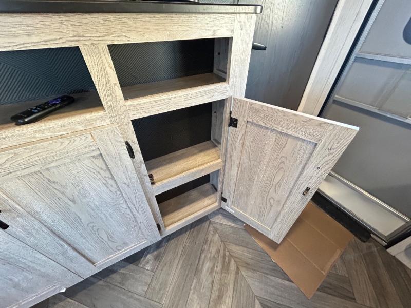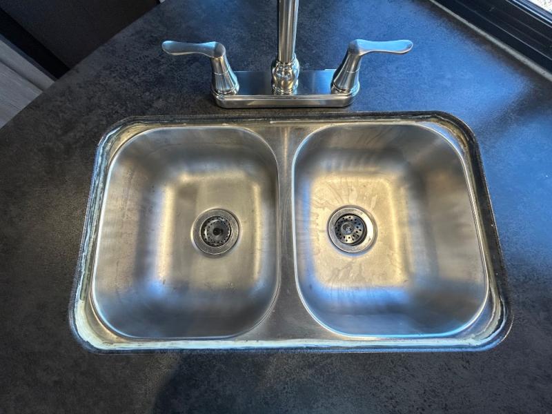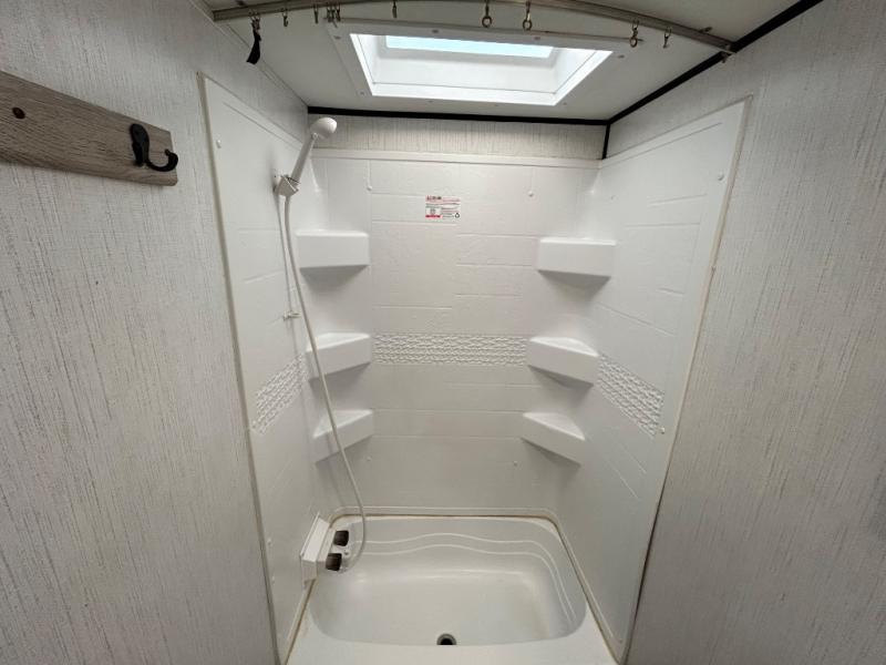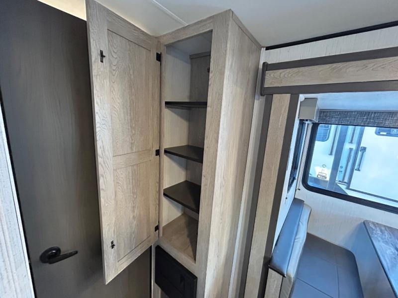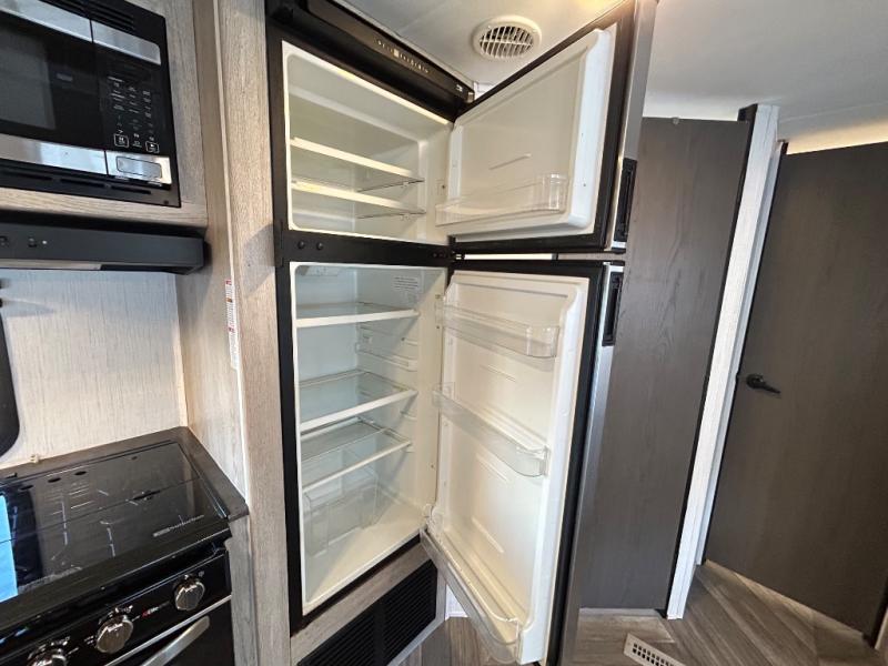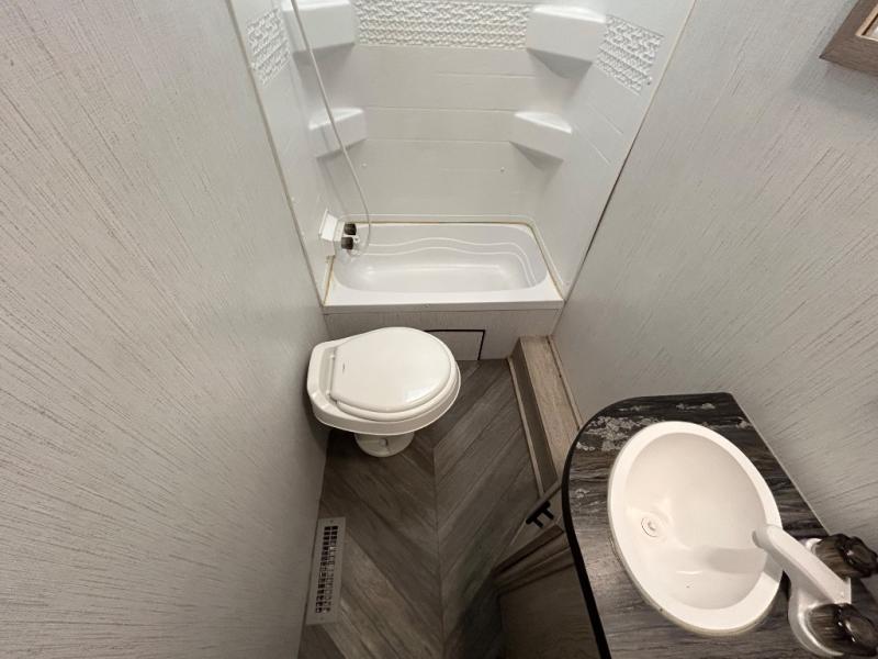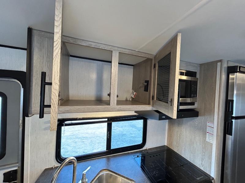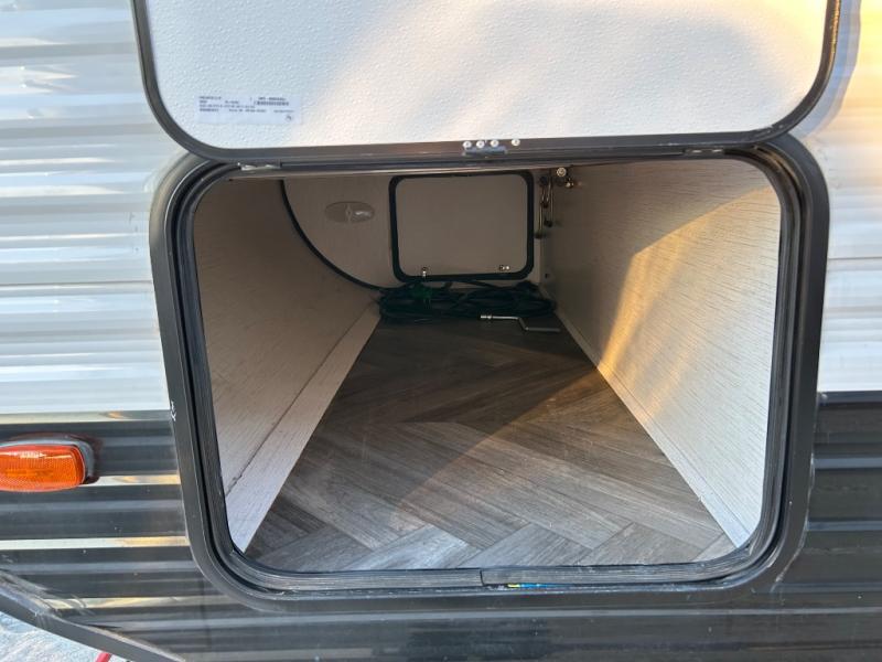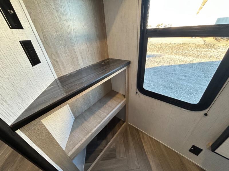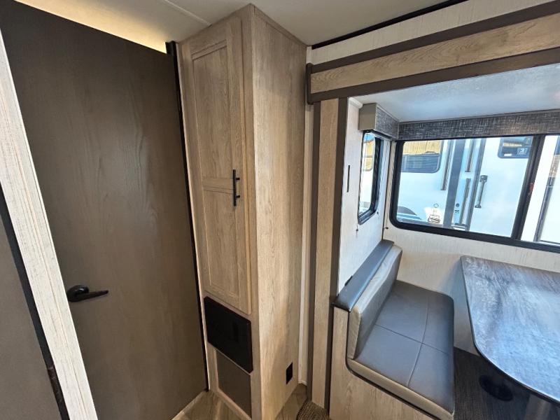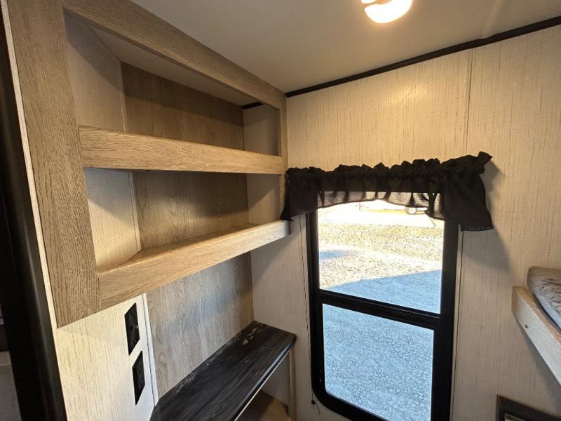 Trips to the lake are fun in this spacious travel trailer that can sleep eight people each night. The exterior storage door allows you to bring along bikes or a kayak with the under-bunk storage, and there is even a door to close off the bunks for privacy. The main living area includes a large slide out with a sofa and a booth dinette to dine, relax, and sleep more friends. Prepare a meal on the three burner cooktop before heading outdoors for the day, and when you return the full bath will be waiting for you. This model also includes a front private bedroom that will feel just like home, and you'll appreciate dual shirt closets to keep your clothes tidy!
