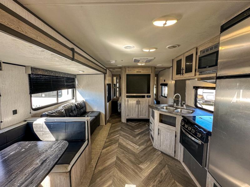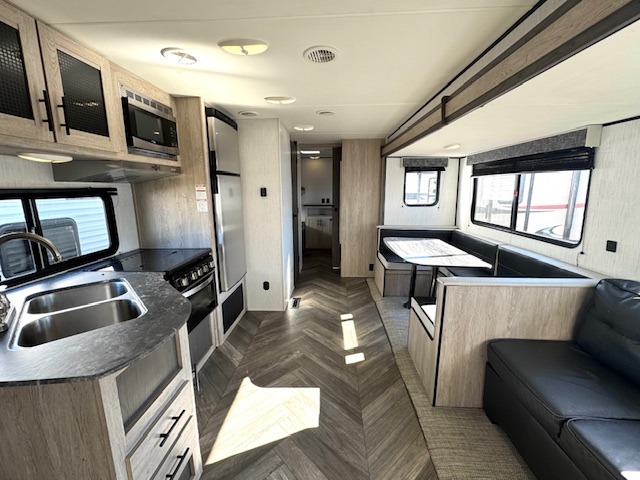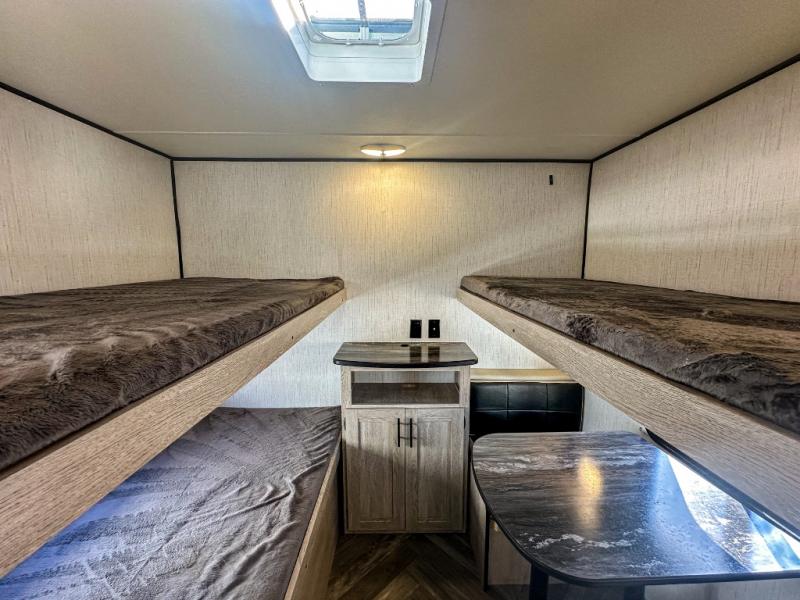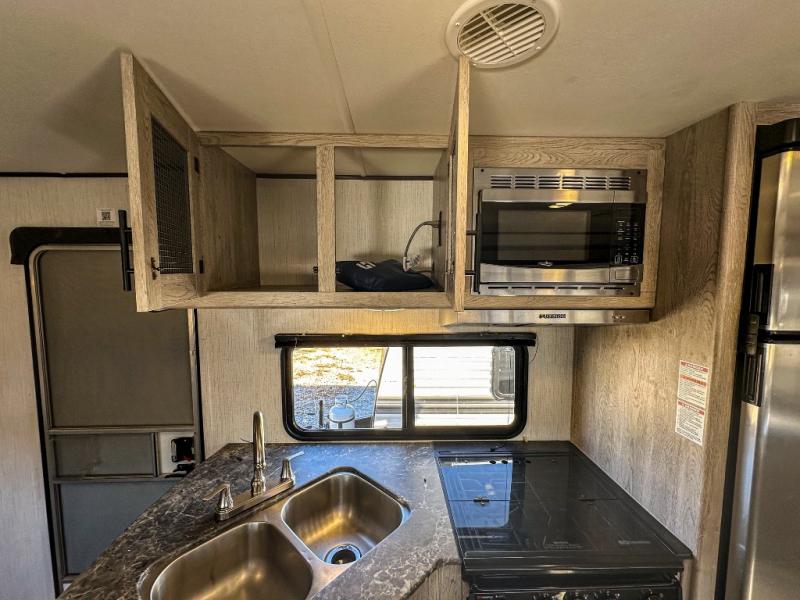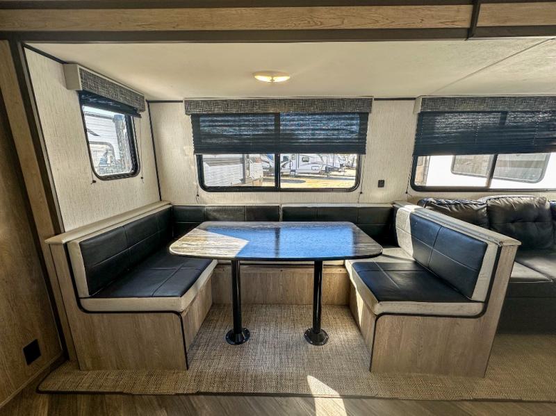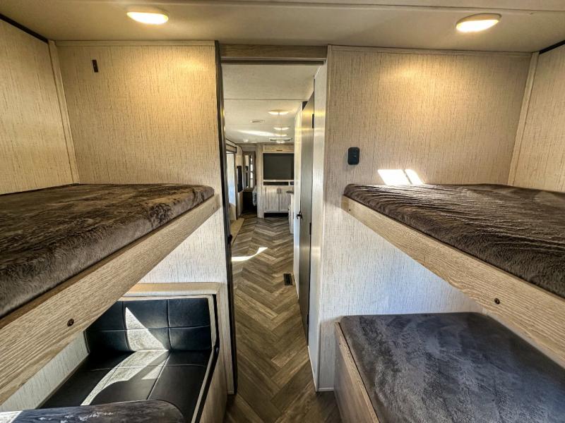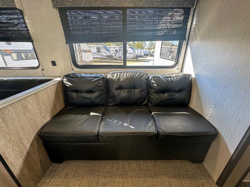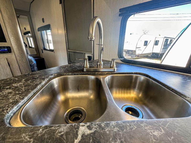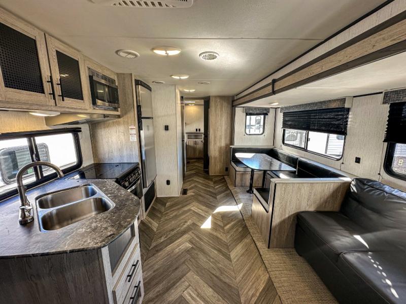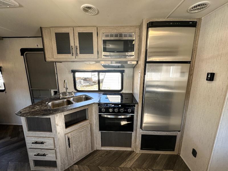 This travel trailer allows you to invite your whole crew along with a rear private bunkhouse and a front private bedroom. The bunkhouse includes three bunks, plus a dinette where the little ones can draw or play a game together. The U-shaped dinette and sofa within the large slide out will provide space to relax, dine, and sleep more guests. This model includes a three burner cooktop, a microwave oven, plus a 10 cu. ft. stainless steel refrigerator for your perishables.