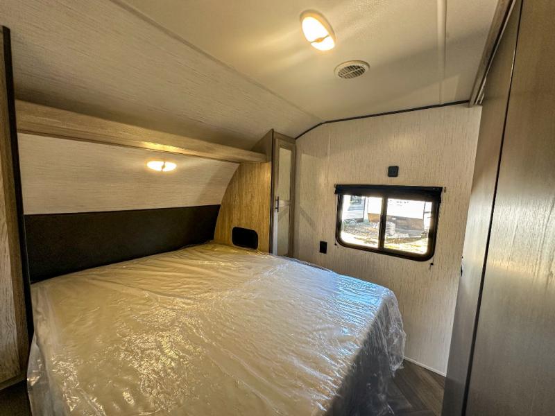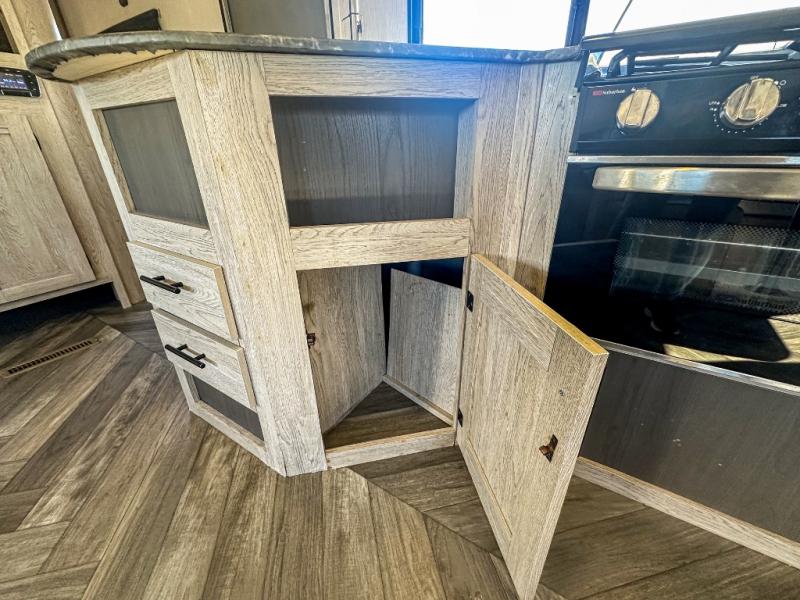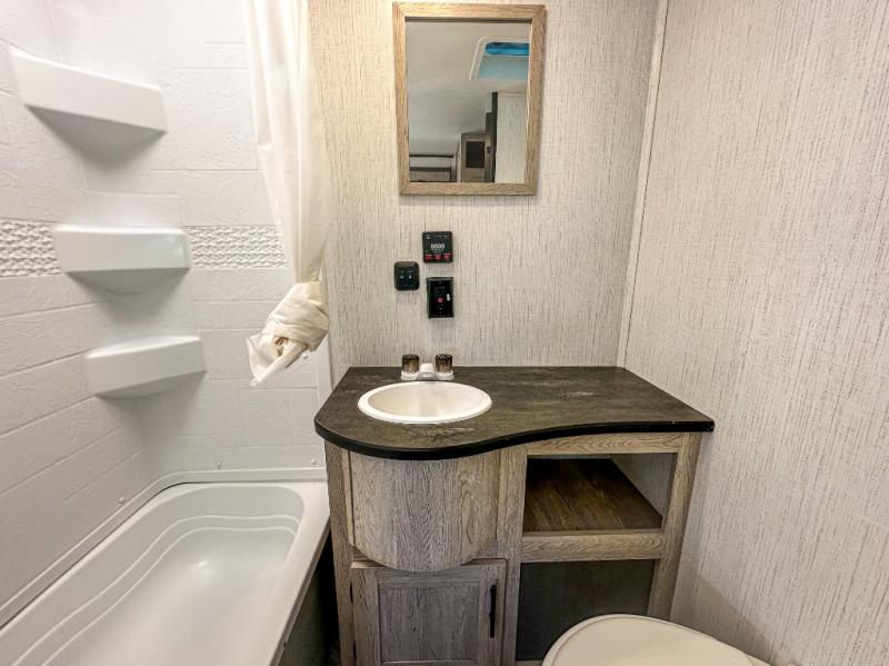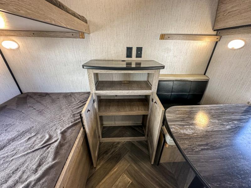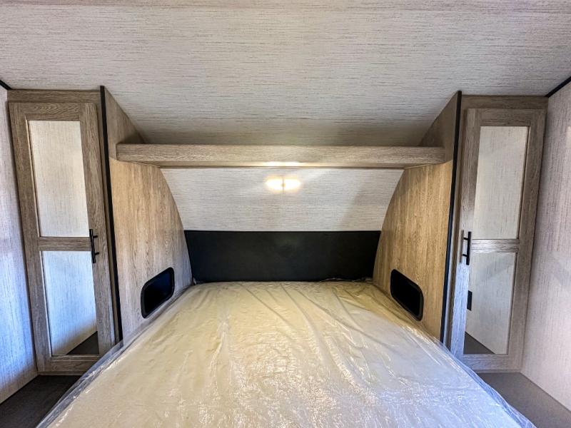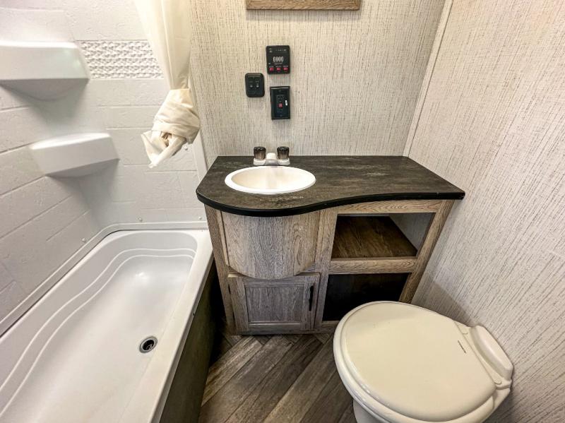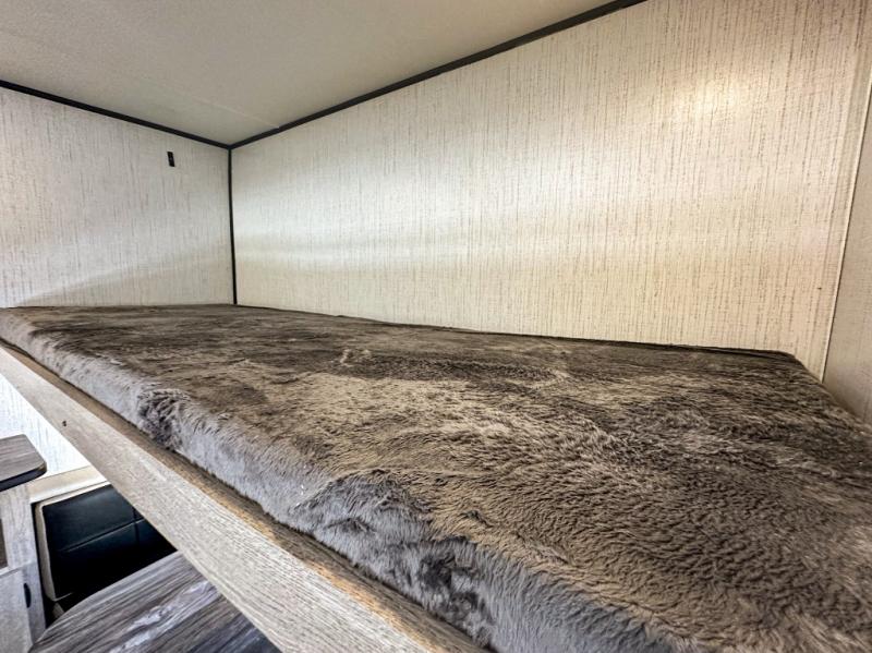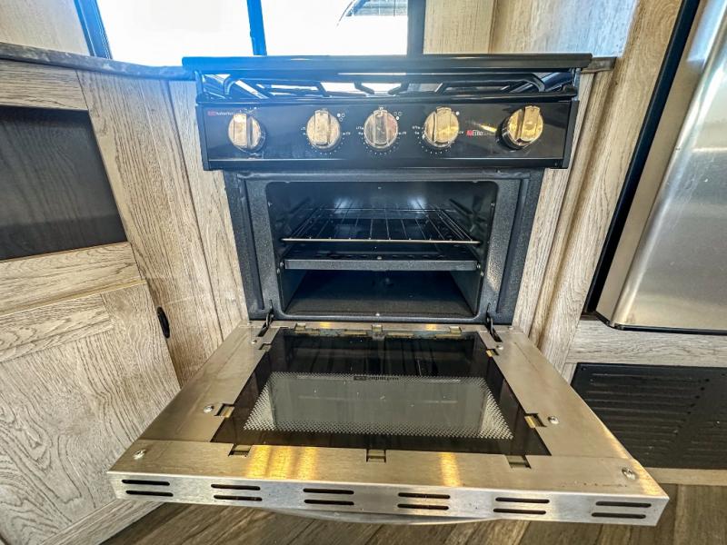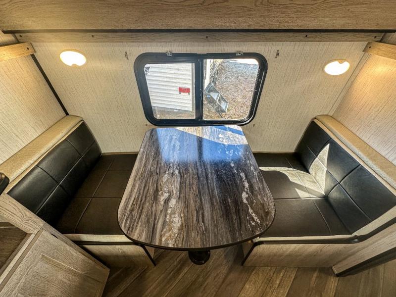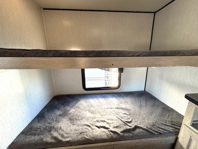 This travel trailer allows you to invite your whole crew along with a rear private bunkhouse and a front private bedroom. The bunkhouse includes three bunks, plus a dinette where the little ones can draw or play a game together. The U-shaped dinette and sofa within the large slide out will provide space to relax, dine, and sleep more guests. This model includes a three burner cooktop, a microwave oven, plus a 10 cu. ft. stainless steel refrigerator for your perishables.