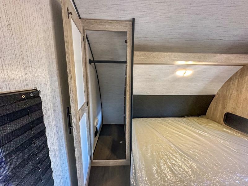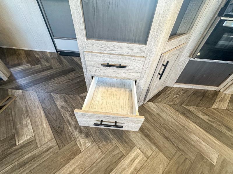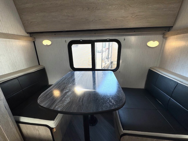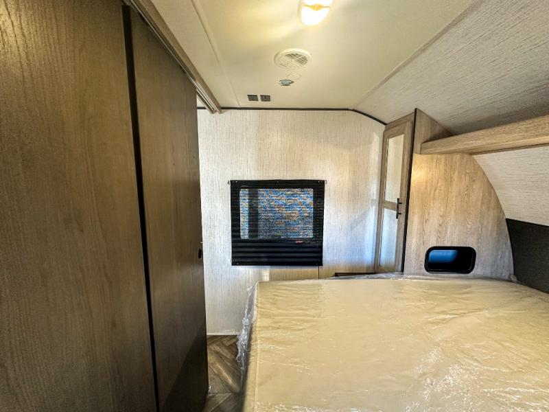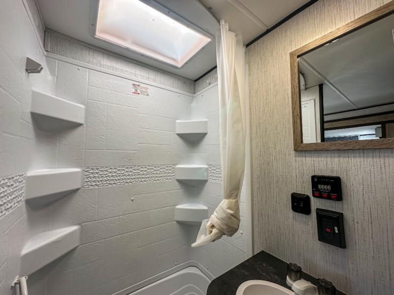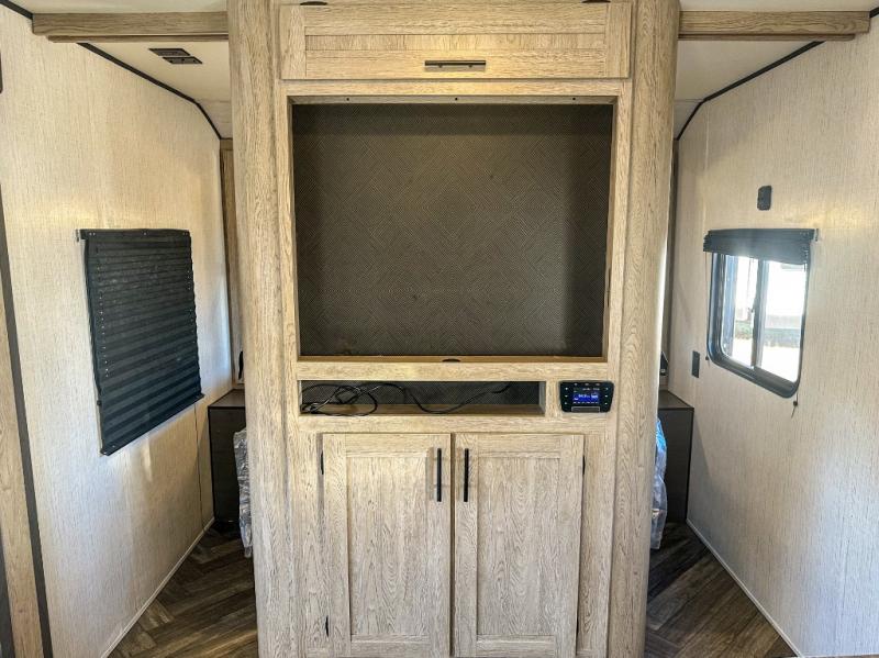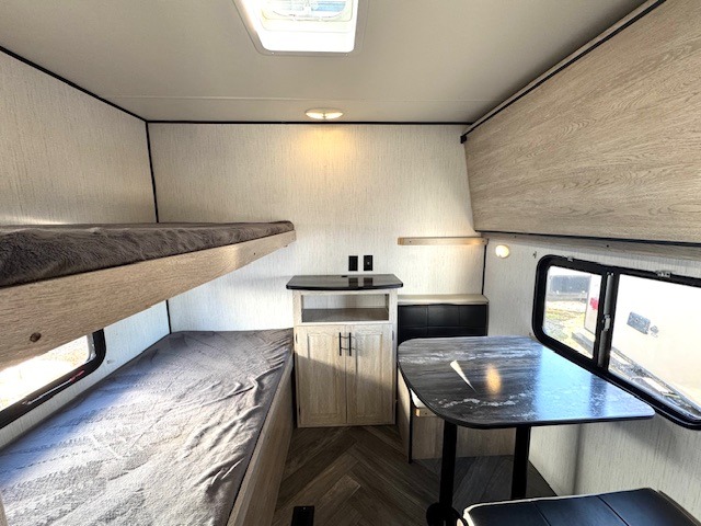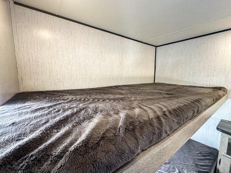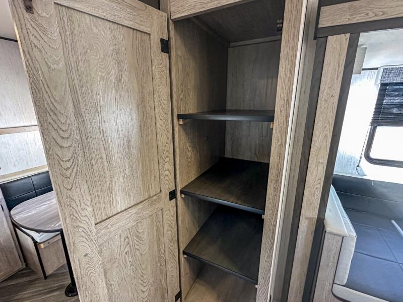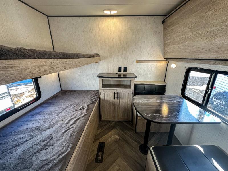 This travel trailer allows you to invite your whole crew along with a rear private bunkhouse and a front private bedroom. The bunkhouse includes three bunks, plus a dinette where the little ones can draw or play a game together. The U-shaped dinette and sofa within the large slide out will provide space to relax, dine, and sleep more guests. This model includes a three burner cooktop, a microwave oven, plus a 10 cu. ft. stainless steel refrigerator for your perishables.