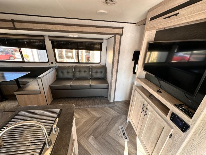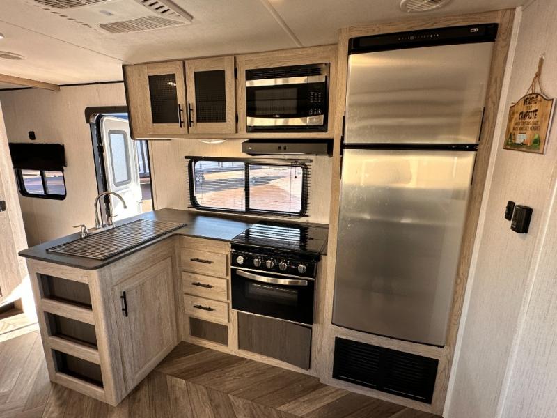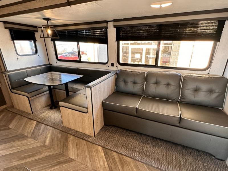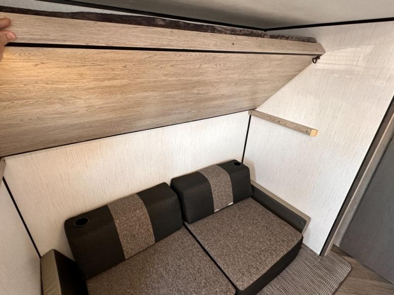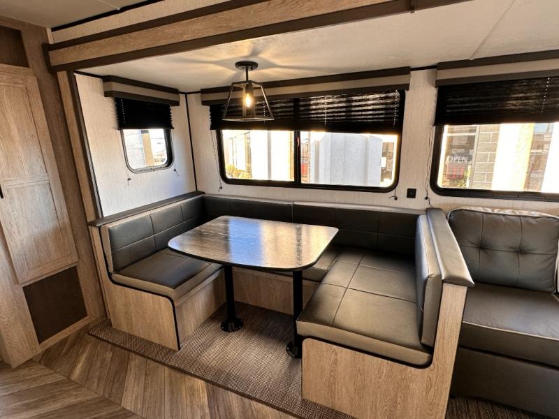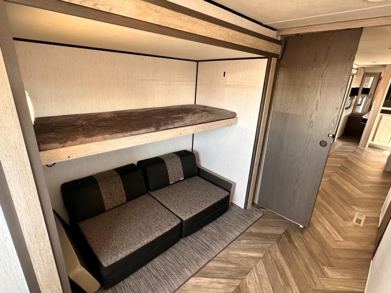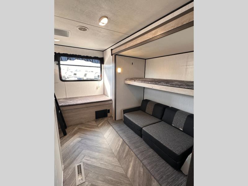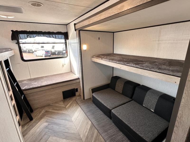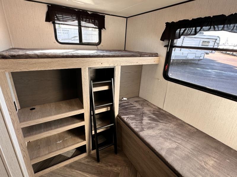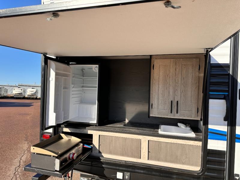 You can't go wrong with this double slide travel trailer in tow! The chef of your group can prepare lunch on the outdoor kitchen with a griddle before you all head off on a trail. The full bath includes its own exterior entry door for convenience, and you'll find a second entry door leading into the main living area. The bunkhouse includes a slide out for more space, three bunks, plus game chairs below one bunk the little ones are sure to love. You'll find a sofa and U-shaped dinette within the living area, and all the kitchen appliances needed to prepare at-home meals. This model also includes a front private bedroom with a queen bed for all-around comfort!