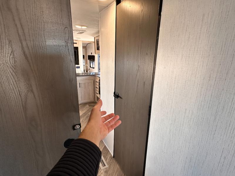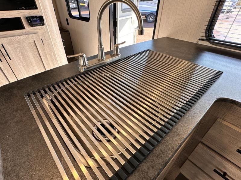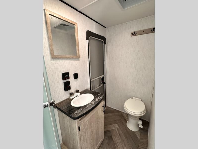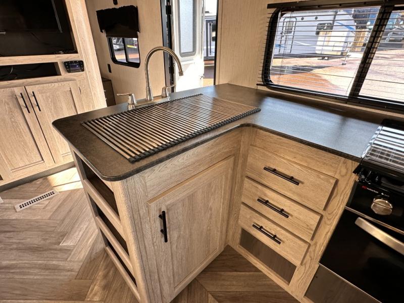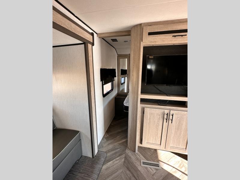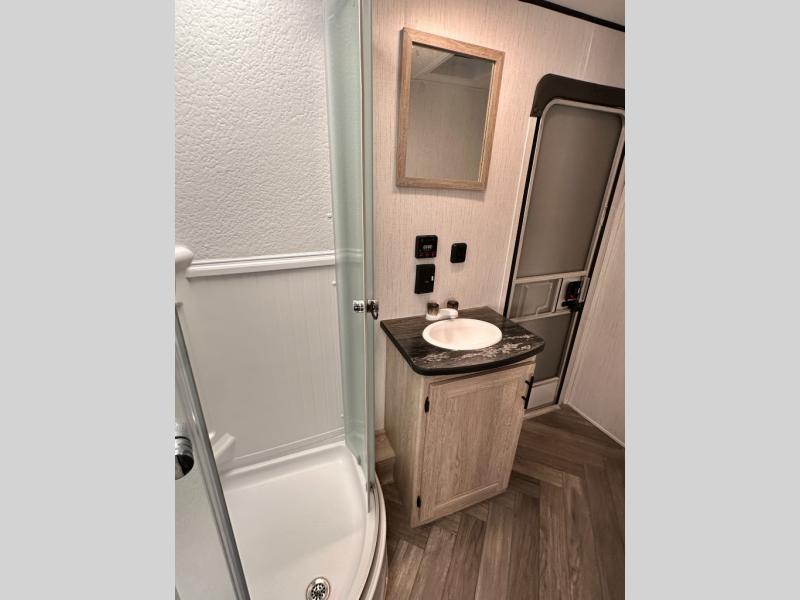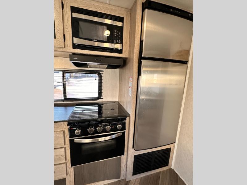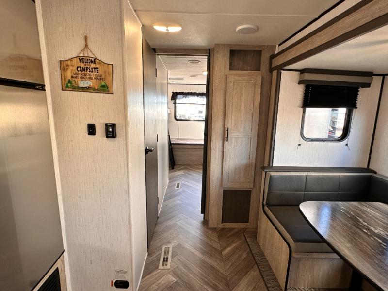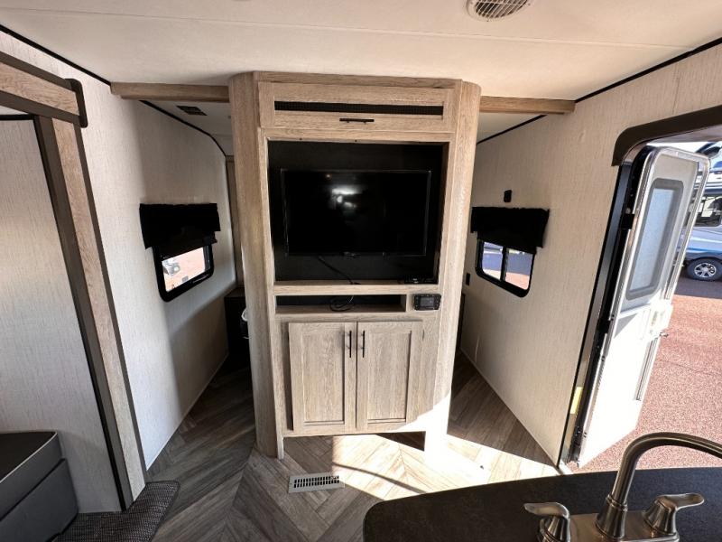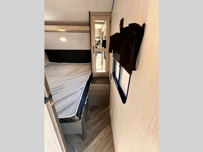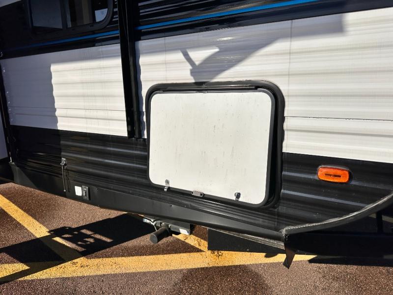 You can't go wrong with this double slide travel trailer in tow! The chef of your group can prepare lunch on the outdoor kitchen with a griddle before you all head off on a trail. The full bath includes its own exterior entry door for convenience, and you'll find a second entry door leading into the main living area. The bunkhouse includes a slide out for more space, three bunks, plus game chairs below one bunk the little ones are sure to love. You'll find a sofa and U-shaped dinette within the living area, and all the kitchen appliances needed to prepare at-home meals. This model also includes a front private bedroom with a queen bed for all-around comfort!