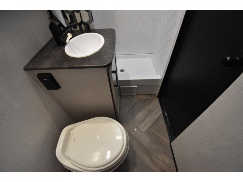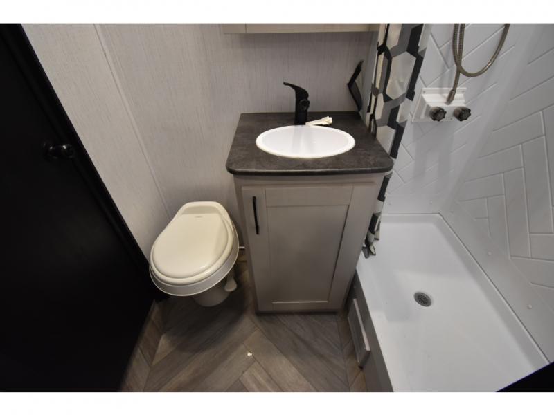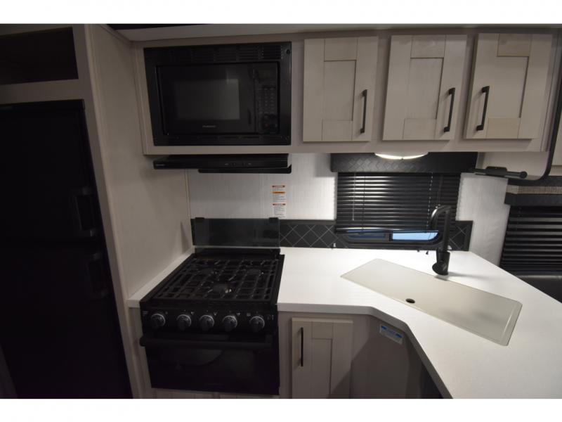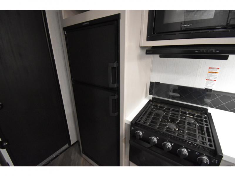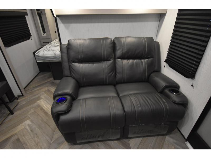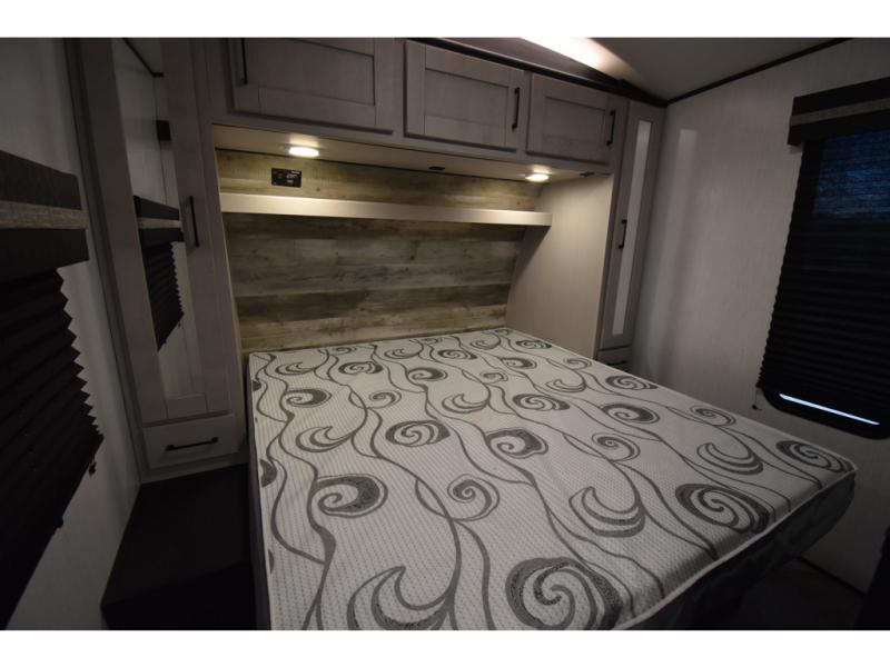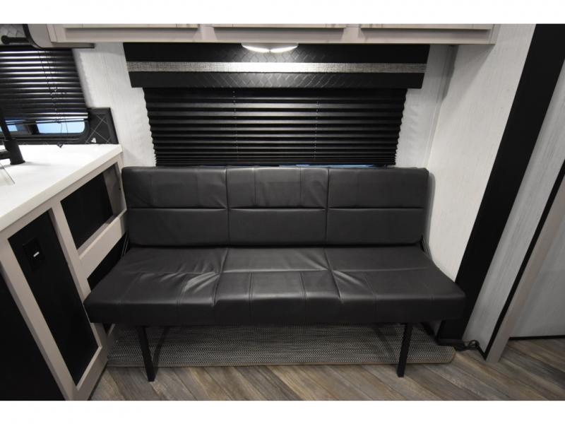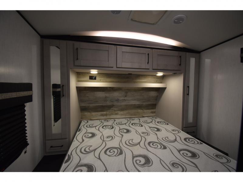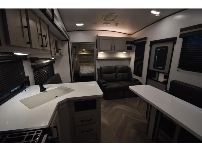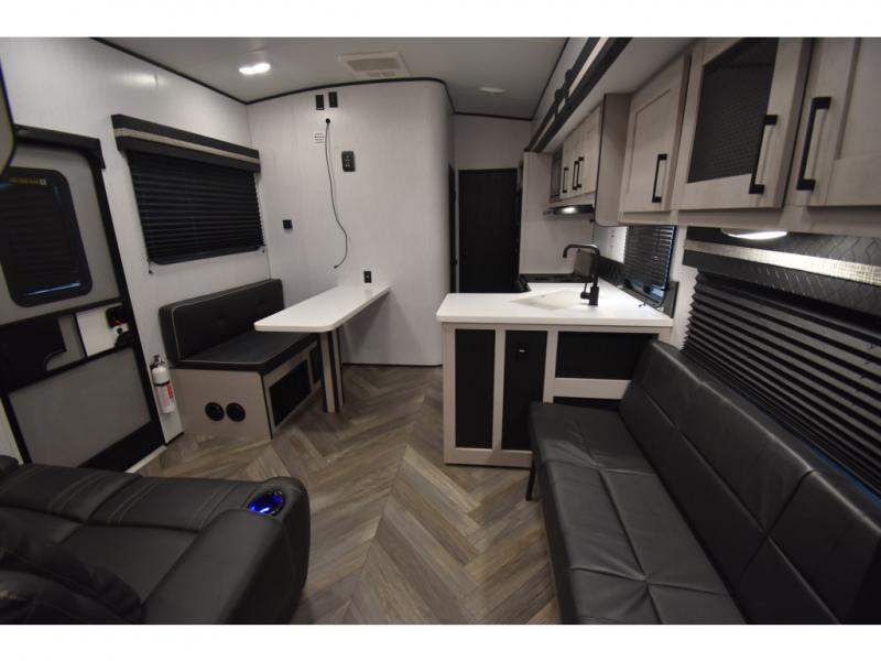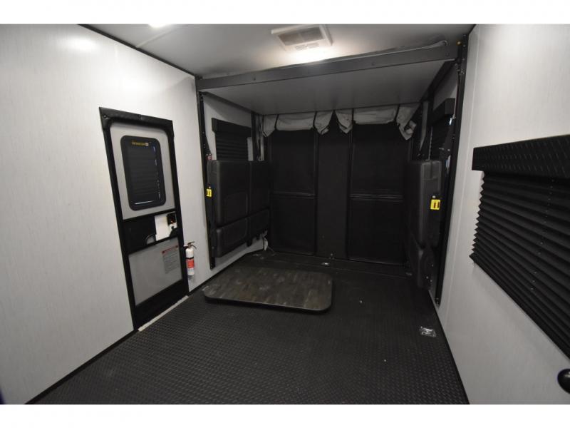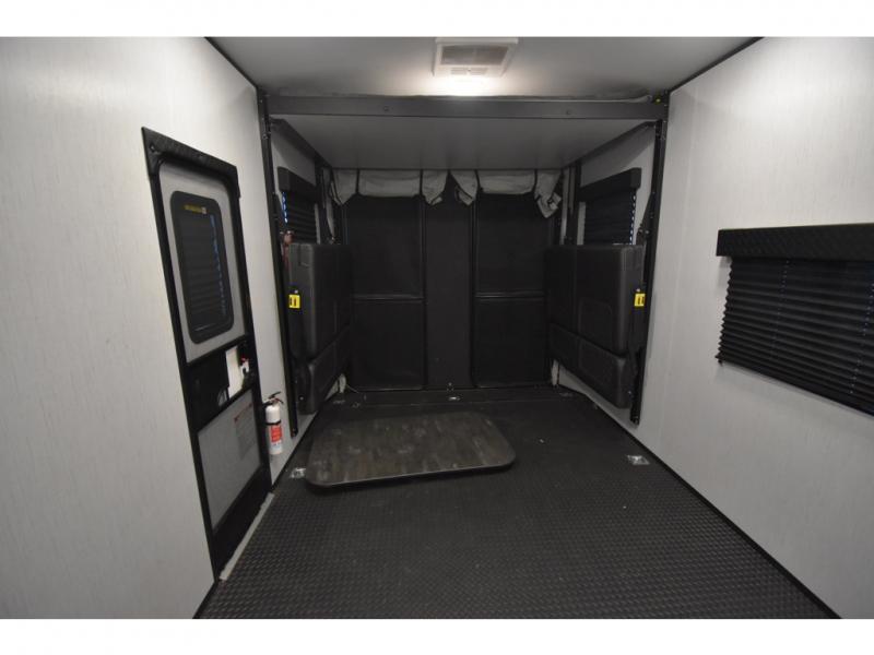 Bring the whole gang with you and your off-road toys in this toy hauler with a 13' garage area! Once your toys are unloaded, you can set up the power queen bed above the sofa with dinette, plus there is one of the dual entry doors to the unit. You can prepare home cooked meals with the three burner cooktop and then eat them either in the garage dinette or the one sided booth dinette seating with table across from the kitchen. After stuffing yourself full, let your stomach settle on either the sofa or the theater seating then freshen up in the dual entry bathroom with the shower that has a skylight above it for added natural lighting. Enjoy a good night's rest each night on the king bed in the front private bedroom!