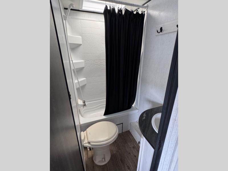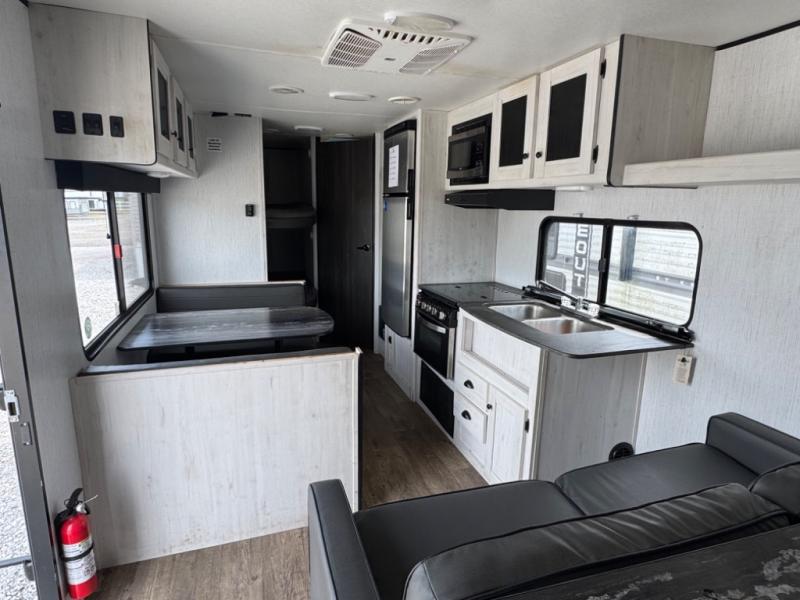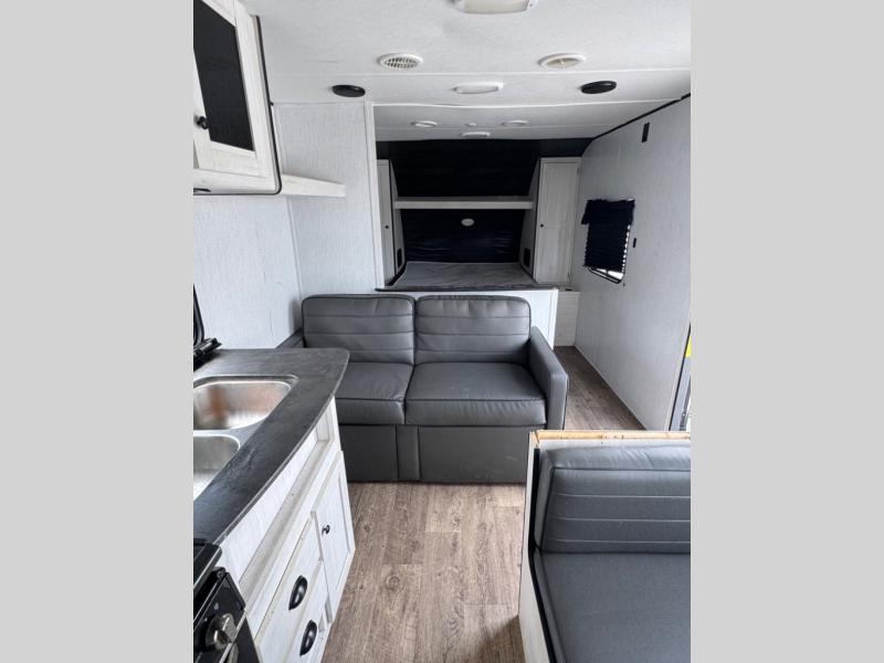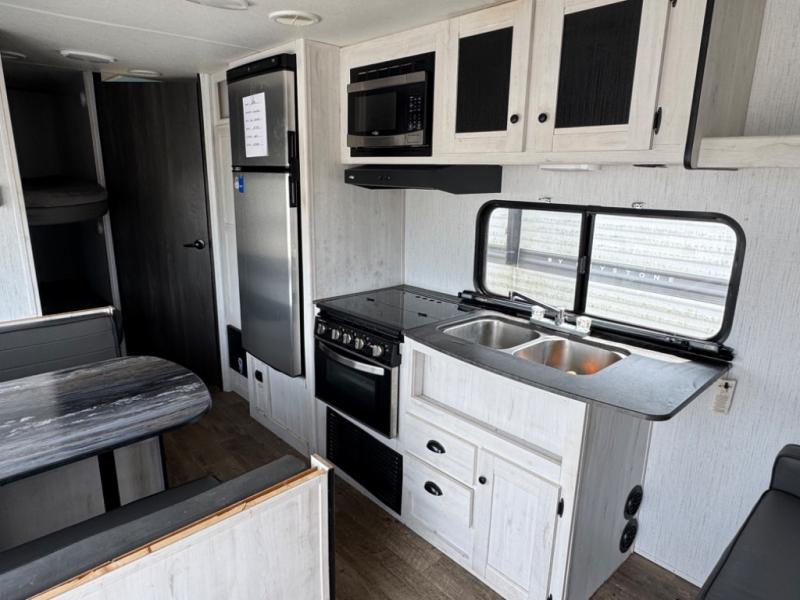 The whole family will love camping in this travel trailer! It has everything you need from a set of double bunk beds to a 14' power awning with LED light strip and outside shower. The front queen bed has under-bed storage to keep extra blankets or suitcases out of the way. After getting a good night's rest, head to the rear corner bathroom to freshen up in the ABS tub/shower surround with skylight above and then fry some eggs up on the three burner cooktop. You can enjoy your meals at the booth dinette and even convert it into an extra sleeping space, plus there is a sofa to take an afternoon nap!