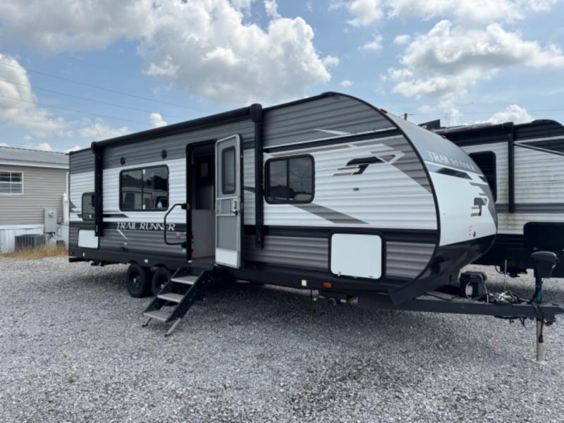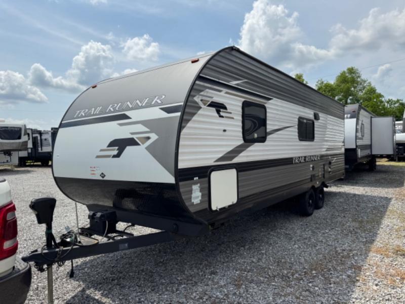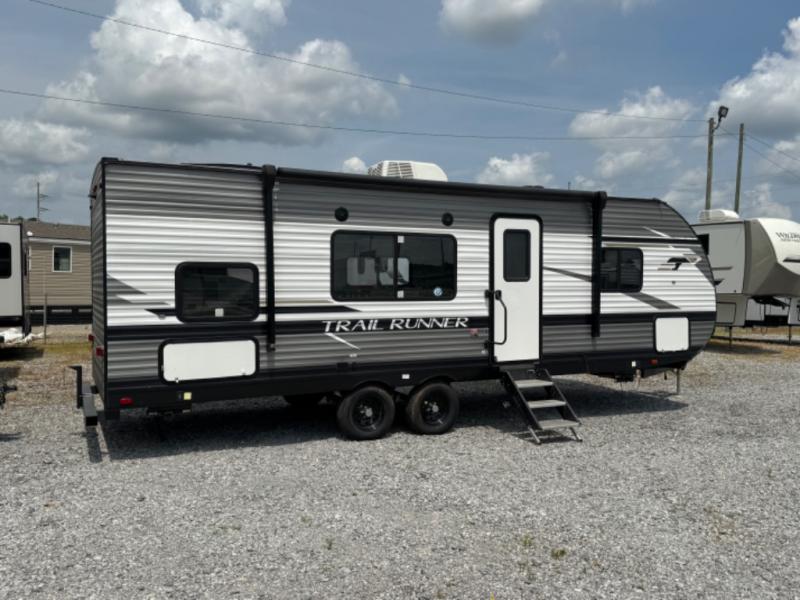 Paradise awaits at the end of the trail with one of these Heartland Trail Runner travel trailers! Experience better wind and water deflection, added strength, and a reduction of tongue weight with the hybrid aluminum front profile that has an aerodynamic radius front cage. A cambered structural steel I-beam frame holds them together and a heated enclosed underbelly protects the units vitals. There is an industry leading mammoth storage space of 57 cu. ft. pass-through storage so you can bring all of your outdoor gear with you. Roller shades in the main living area, woven flooring in all slide rooms, master suites with CPAP storage, and upgraded pressed counters give you the at-home feel you desire. Come find the perfect model for you today!