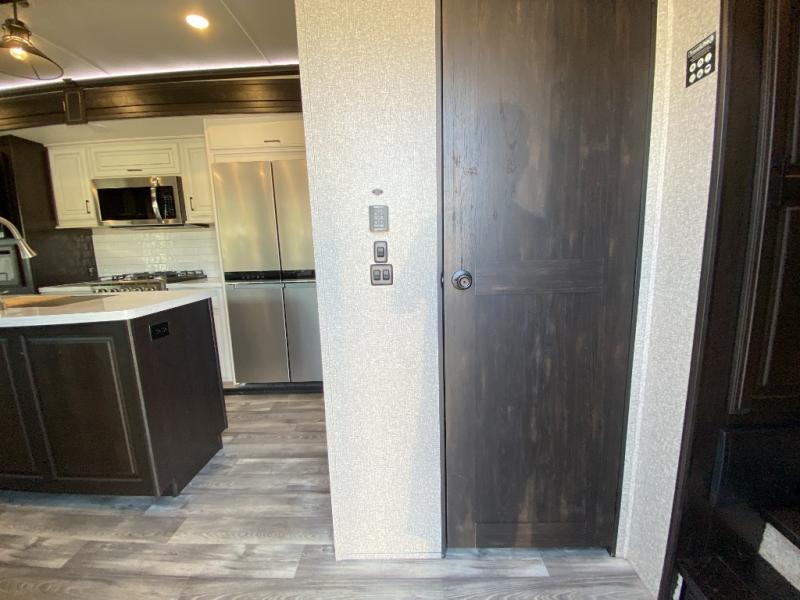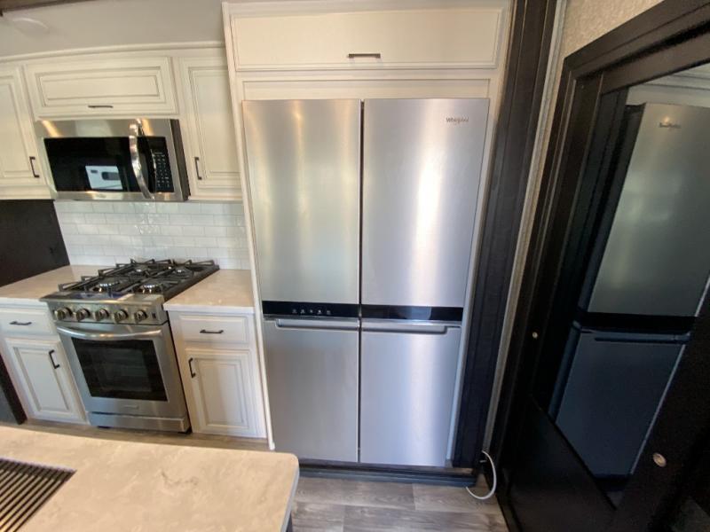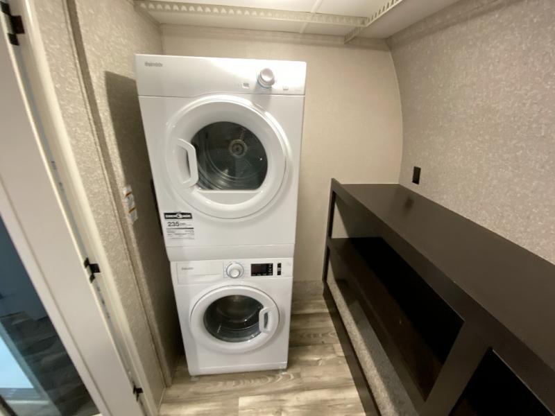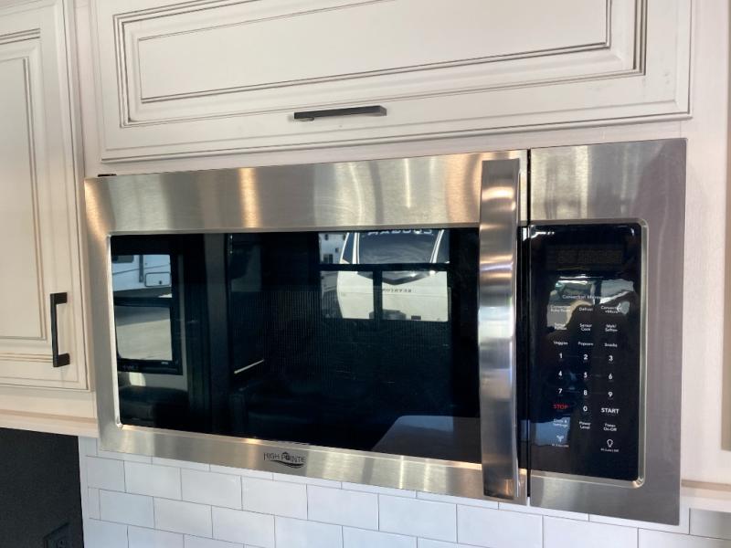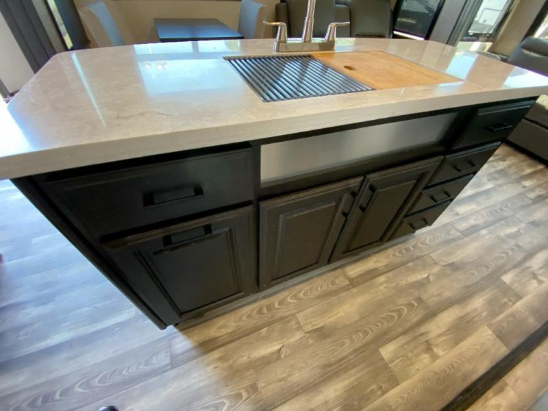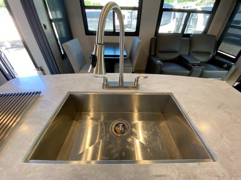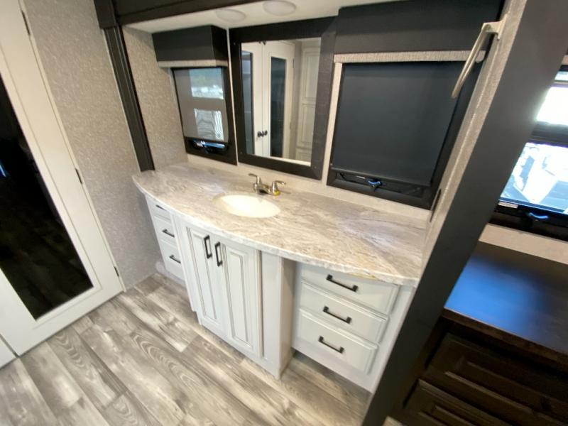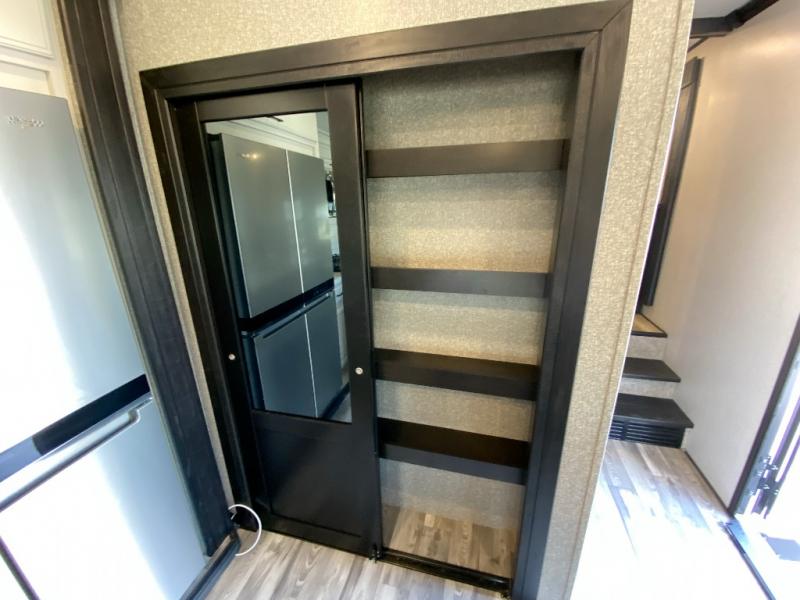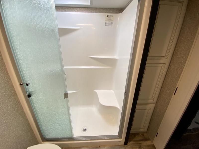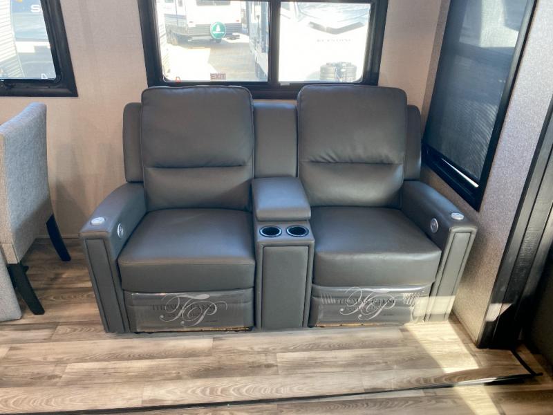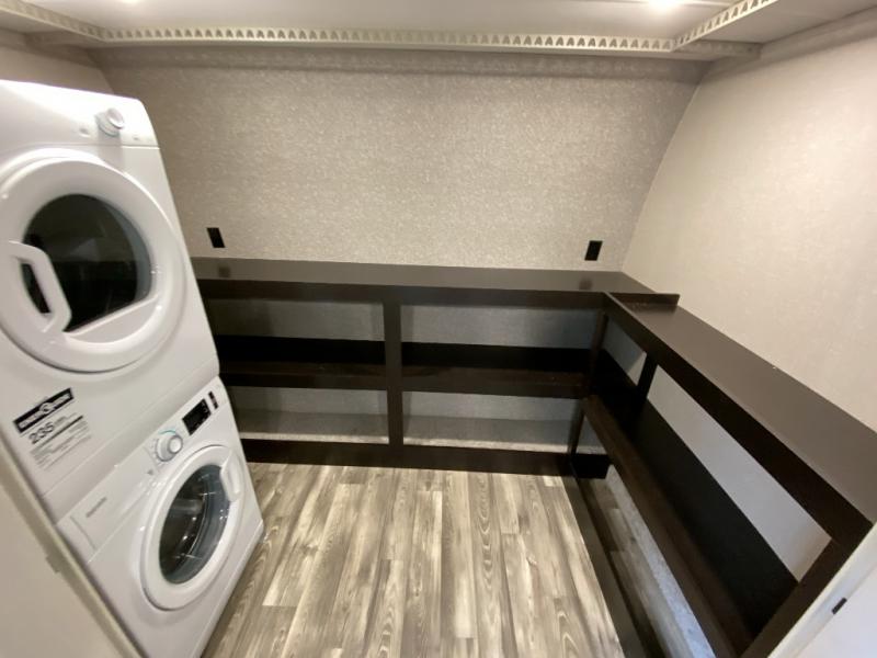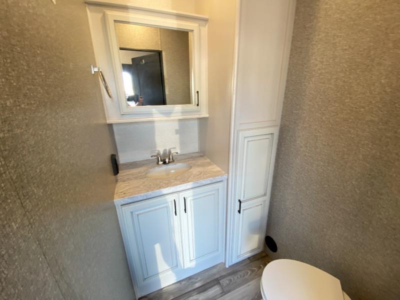 Traveling with comfort and conveniences such as a front full bathroom for yourselves and a half bath for guests, plus a bedroom pull-out desk that allows you to work from any destination, just makes sense! Other great features include a walk-in closet with a prepped space for a washer/dryer option in the full bathroom, a slide out queen bed with king bed option, a sliding door between the bedroom and bathroom giving you more space, and a half bath just a few steps away from the entry for easy access when outside. The rear living area provides a tri-fold sofa with adjustable headrests, theater seating with heat and massage function for ultimate comfort, and a free standing table with chairs to dine at. The cook will love all the kitchen amenities including the residential convection microwave, and the large pantry.