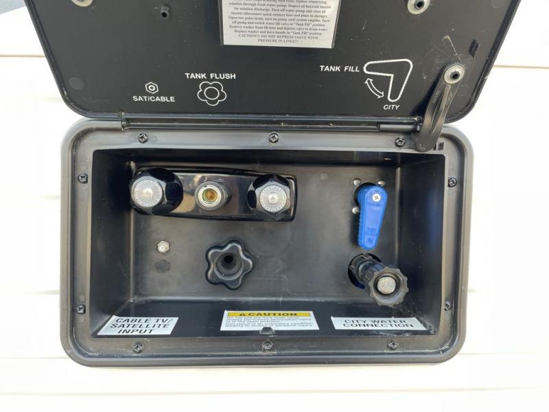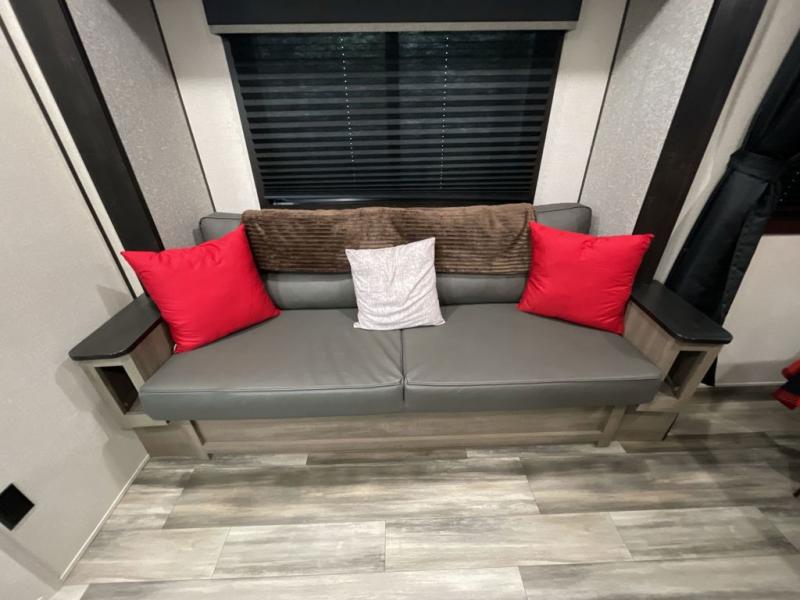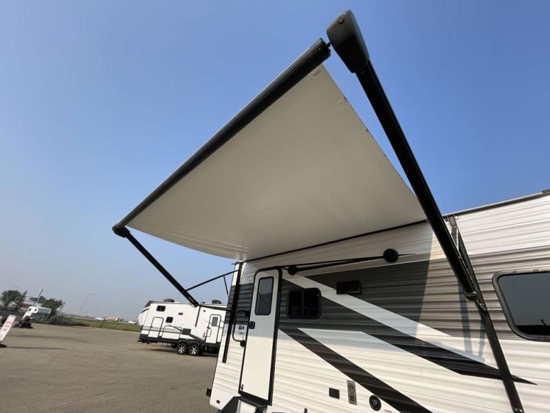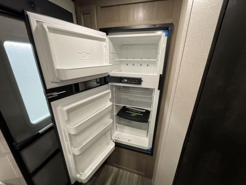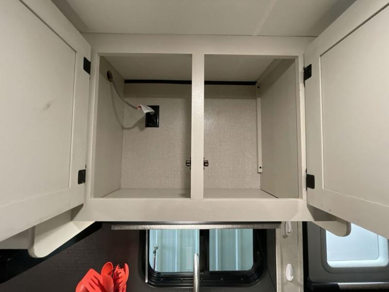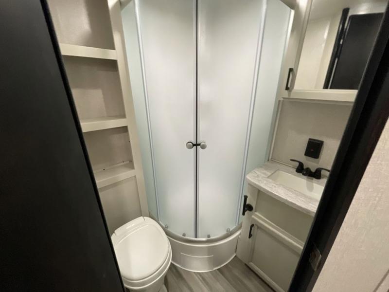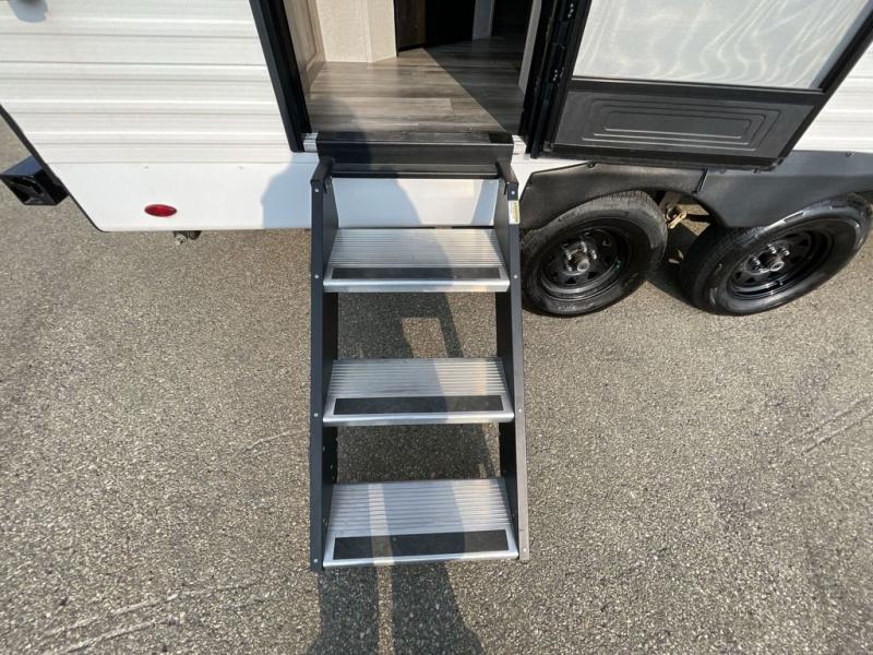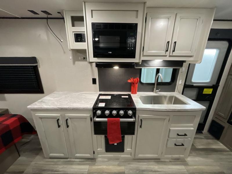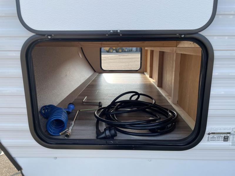 This is the perfect couple's trailer for room for an overnight guest on the jack-knife sofa. You'll appreciate a table in front of the sofa where you can enjoy eating together, and the slide out provides more space to move about. This model includes a front bedroom with a privacy curtain and dual wardrobes to store your clothes for the week, plus there is a full bath towards the back of the unit to say clean each day. Snacks and paper goods can go in the entryway pantry, and camp gear can be kept in the outdoor storage!