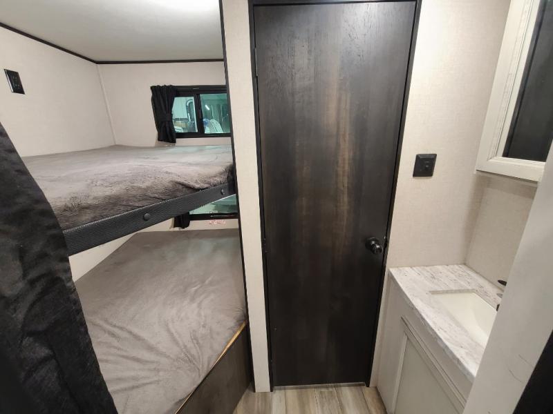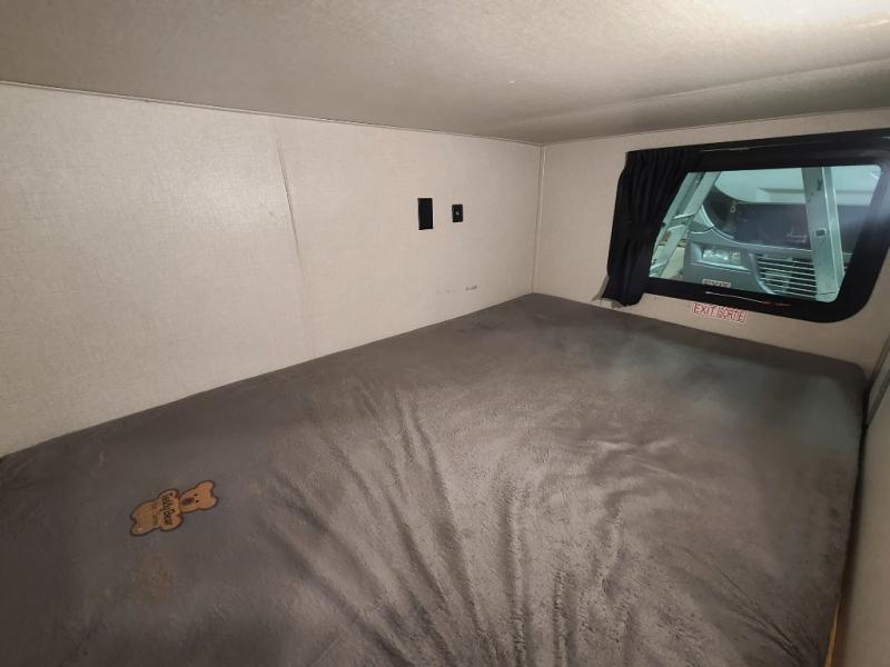 This dual-axle travel trailer can sleep eight people each night, so invite your family or friends along. You will enjoy the front private bedroom up front with dual wardrobes to keep your clothes tidy, and an easy lift bed with storage. While the chef of your group is preparing lunch on the three burner cooktop, everyone else can visit on the jack-knife sofa or play a game at the booth dinette. You will also find a large 19' power awning with LED lights outdoors which is where you may usually find everyone. The private tub/shower and toilet is right next to the double-size bunks for convenience, and the sink is just outside of this room so two people can freshen up at once.