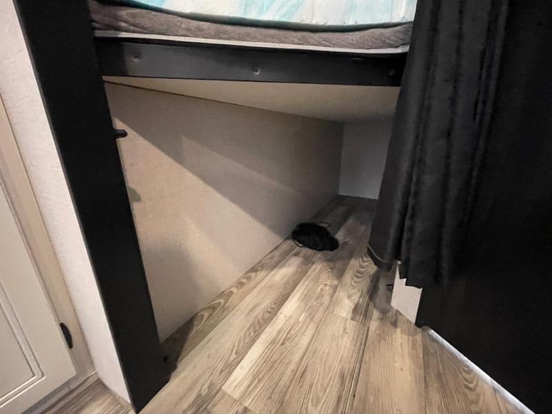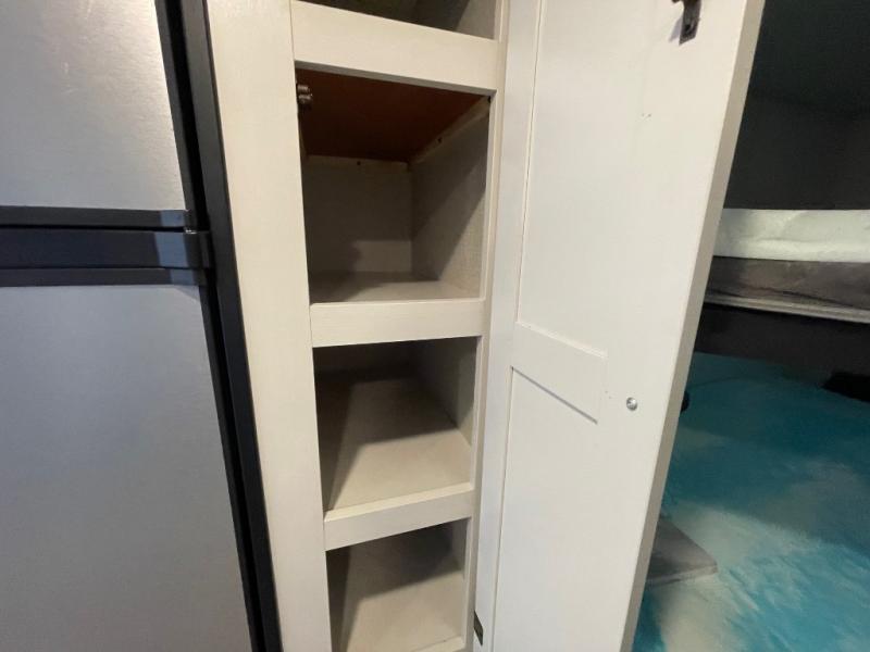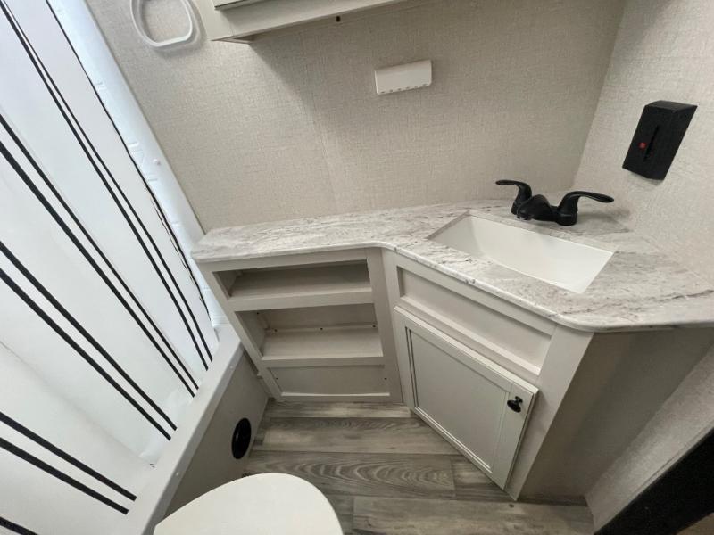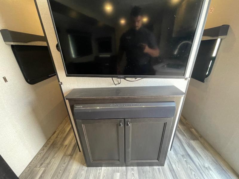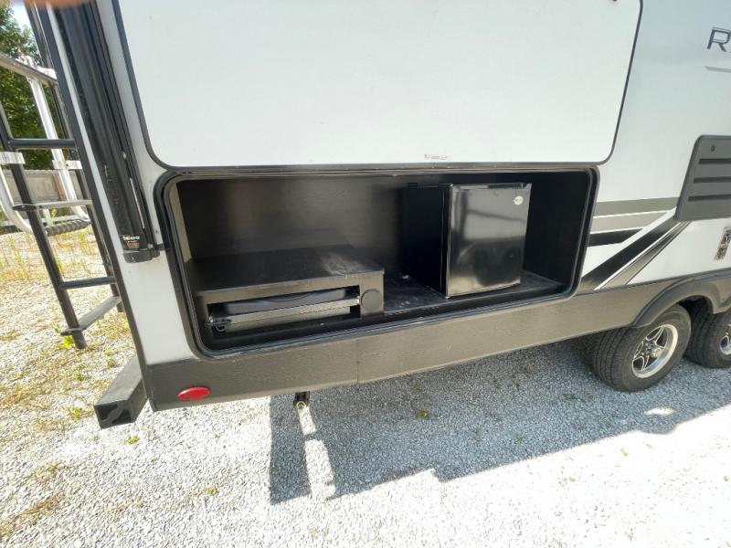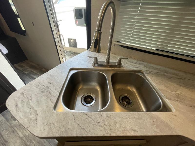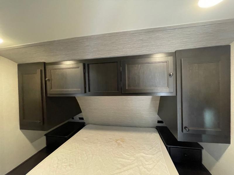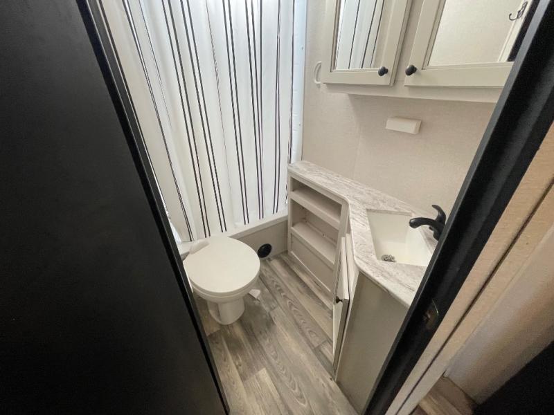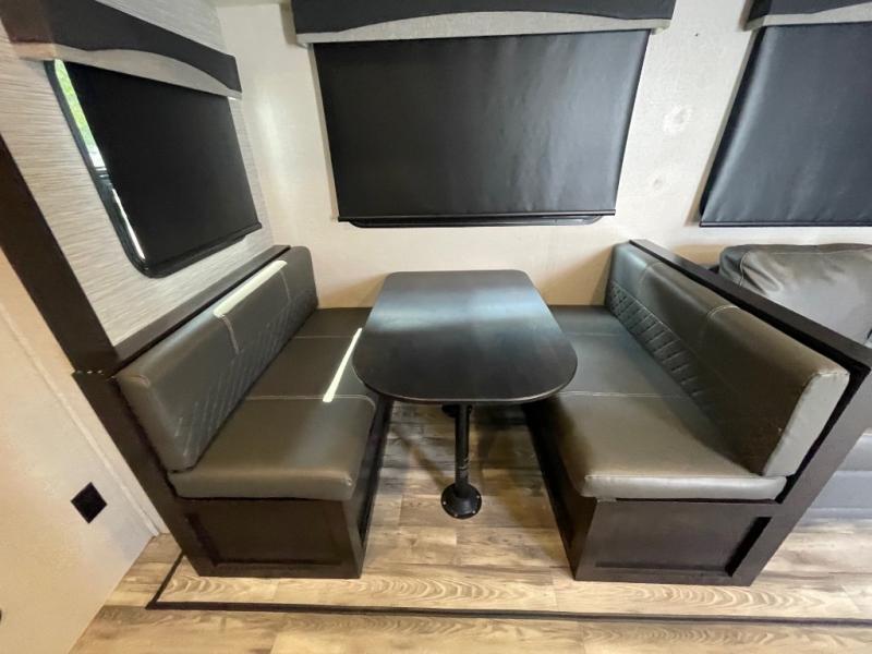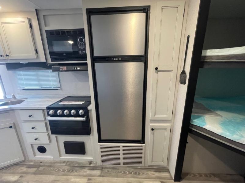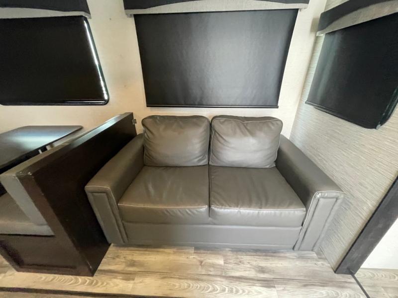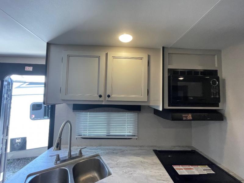 You're going to love every minute spent in this spacious travel trailer. The booth dinette and jack-knife sofa within the large slide out will be perfect for meal times, relaxing, and additional sleeping space. Add the optional LED TV to the entertainment center and you're set up for movie night! This model includes an outside kitchen with a griddle and a refrigerator for cold drinks, plus indoor appliances if the rain has ruined your plans for the day. You will enjoy your own bedroom up front with space-saving sliding doors and two wardrobes for your clothes.