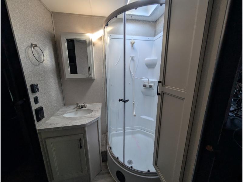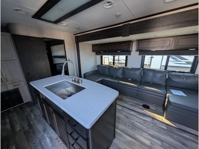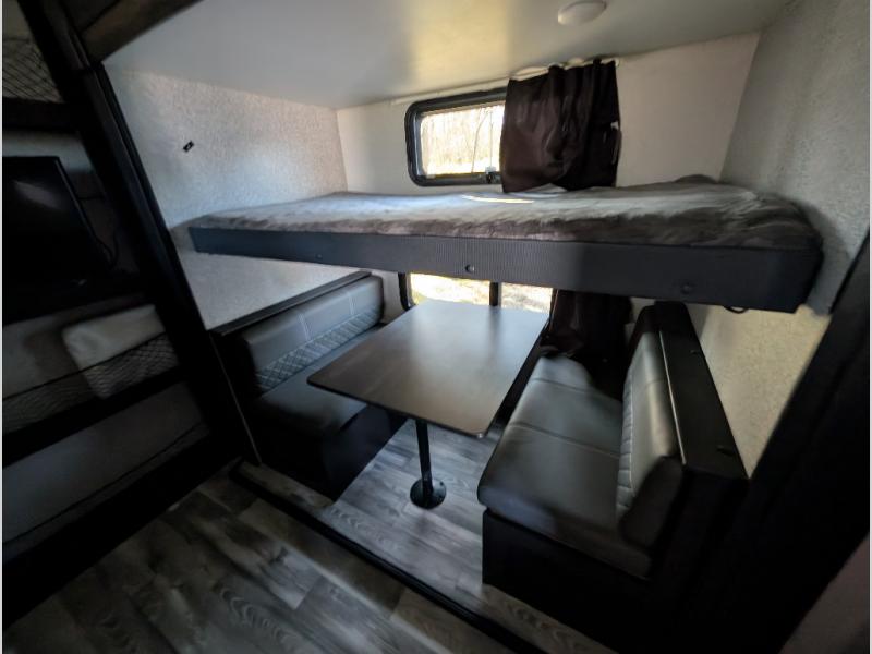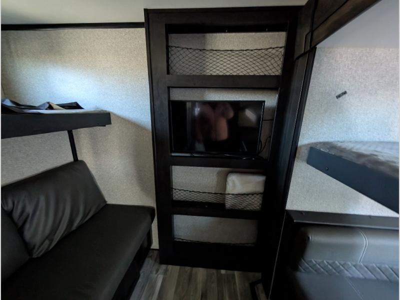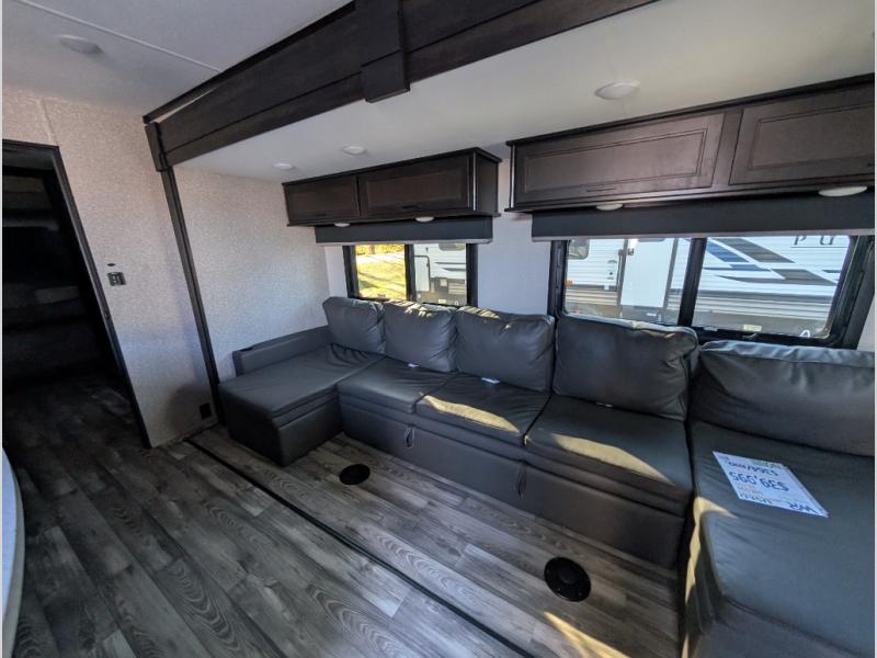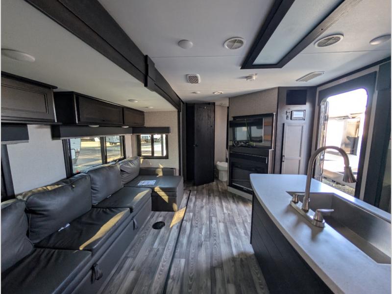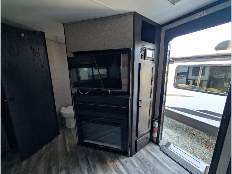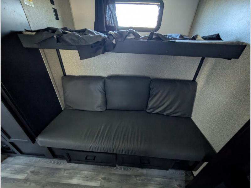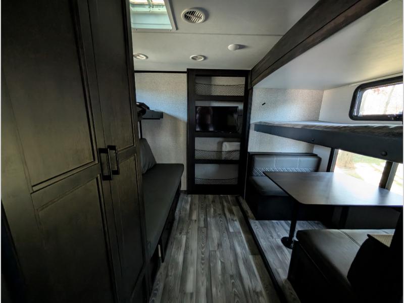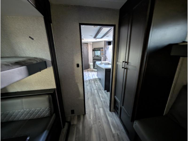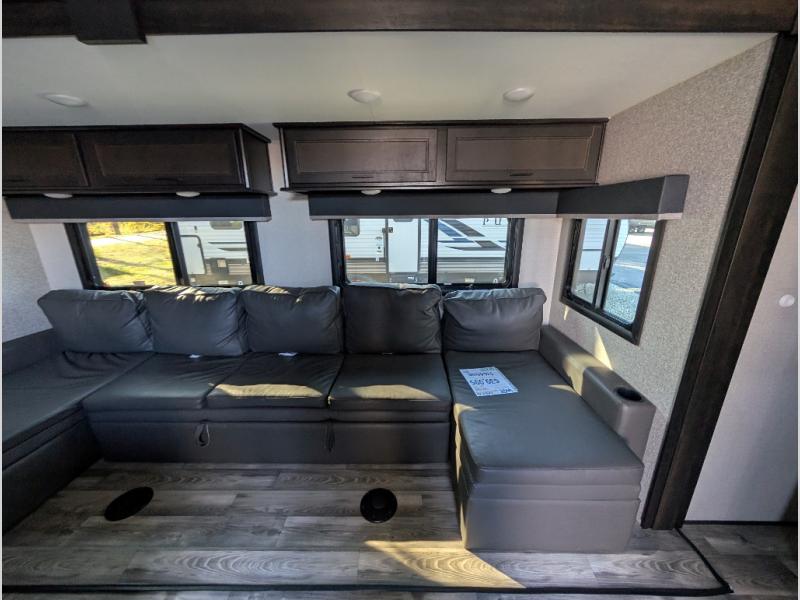 Invite your friends to join you on a road trip thanks to the private bunkhouse with two bunks, a dinette and a bench seat as well as a hutch and wardrobe for their things. You will have your own privacy in the front bedroom with a queen bed slide, a dresser with window above, a mirrored wardrobe for your clothes and a wardrobe prepped for a washer/dryer option. You will also appreciate easy access to the double entry bath which includes a radius shower and linen storage. The cook can make meals with full amenities including a kitchen island and pantry, and everyone can eat at the U-Lounge with two tables or choose the theater seats and table with chairs option in its place while eating and watching a show on the 39" LED HDTV with fireplace below. And the outside kitchen, shower and storage will all come in handy as well.