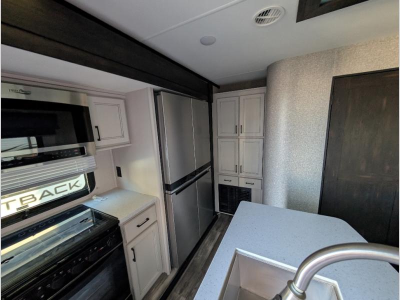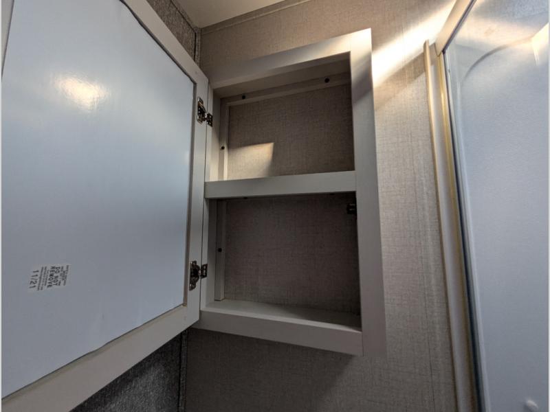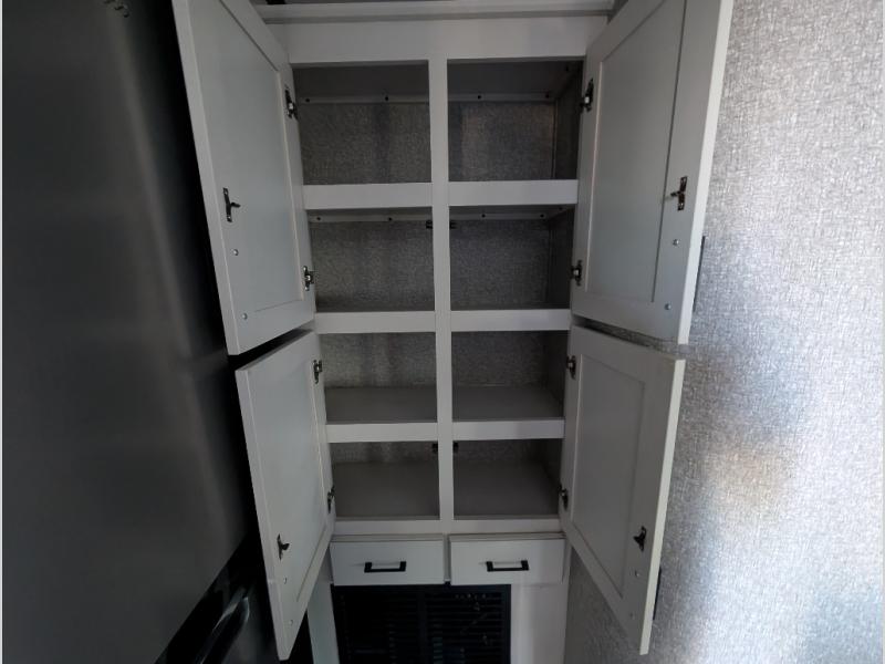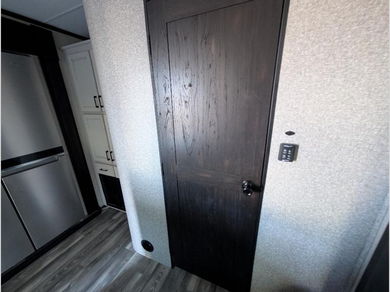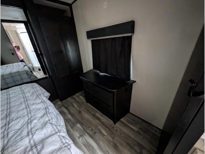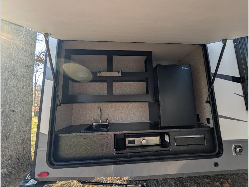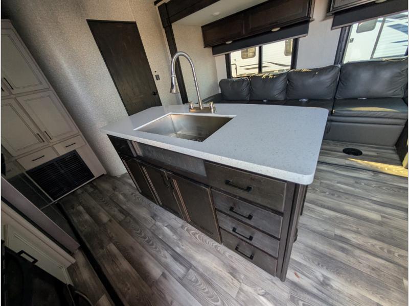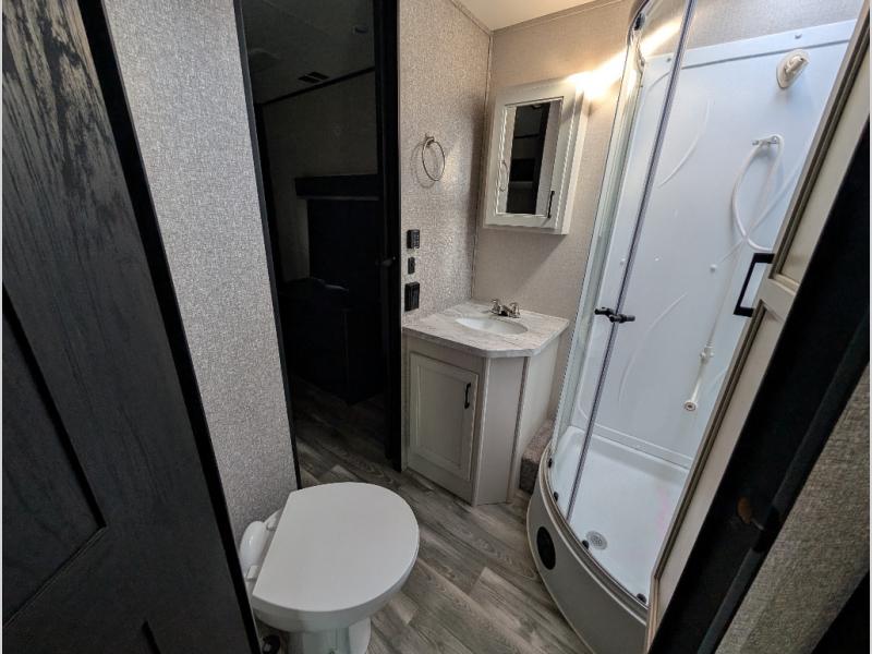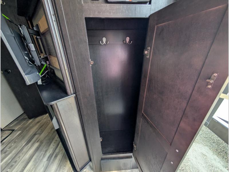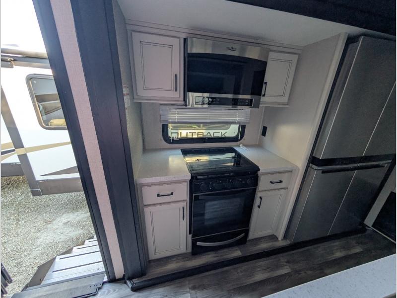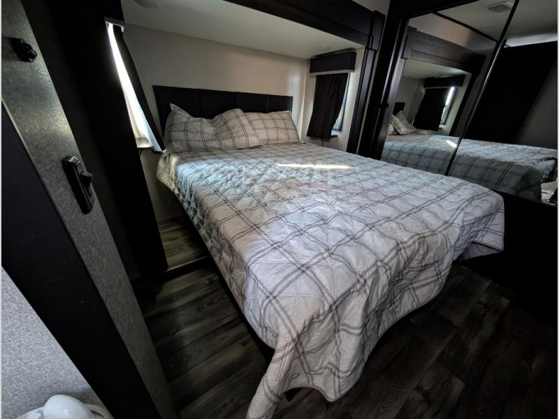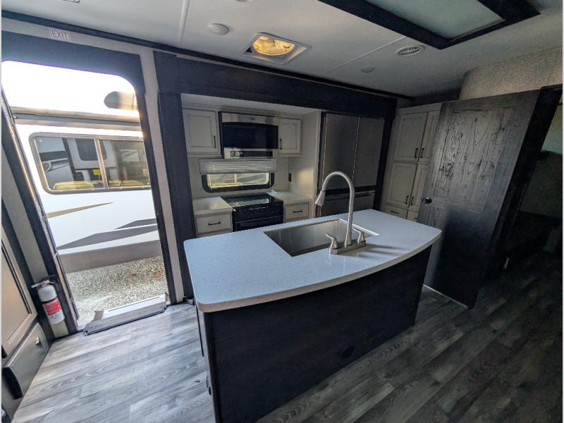 Invite your friends to join you on a road trip thanks to the private bunkhouse with two bunks, a dinette and a bench seat as well as a hutch and wardrobe for their things. You will have your own privacy in the front bedroom with a queen bed slide, a dresser with window above, a mirrored wardrobe for your clothes and a wardrobe prepped for a washer/dryer option. You will also appreciate easy access to the double entry bath which includes a radius shower and linen storage. The cook can make meals with full amenities including a kitchen island and pantry, and everyone can eat at the U-Lounge with two tables or choose the theater seats and table with chairs option in its place while eating and watching a show on the 39" LED HDTV with fireplace below. And the outside kitchen, shower and storage will all come in handy as well.