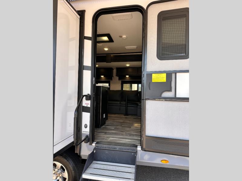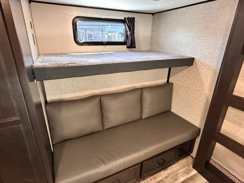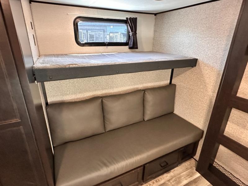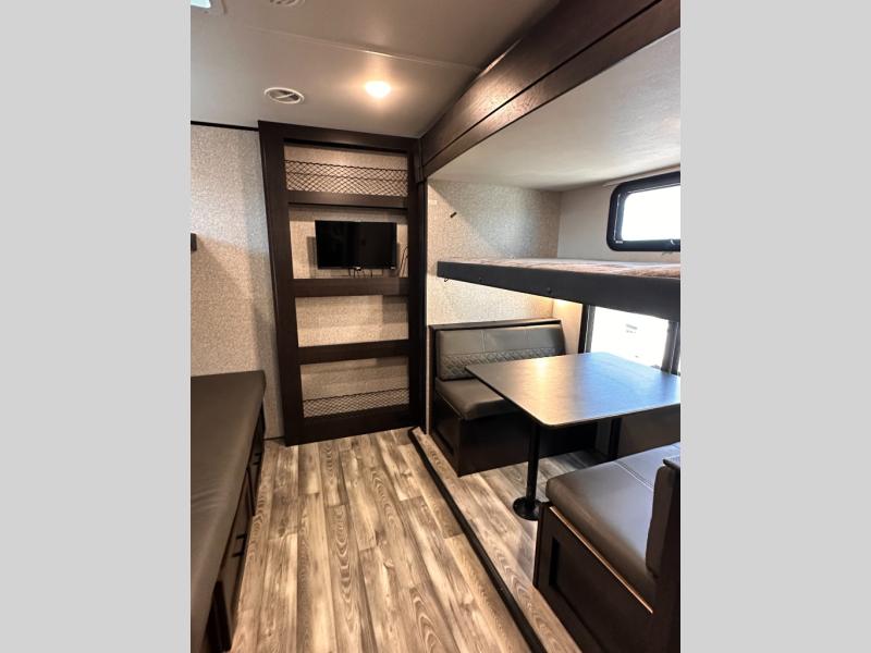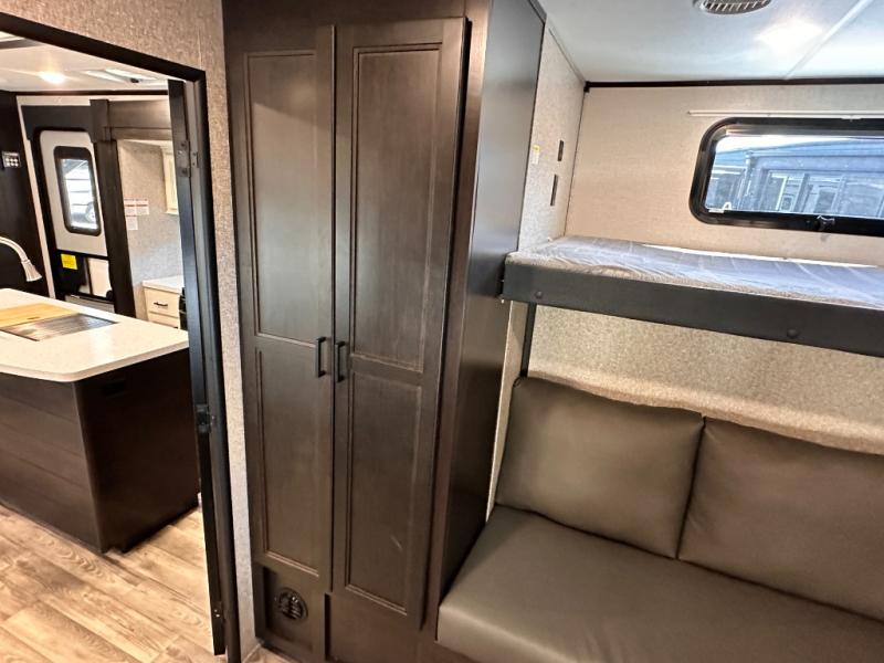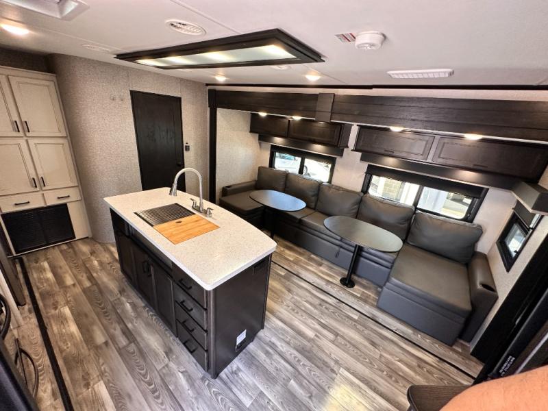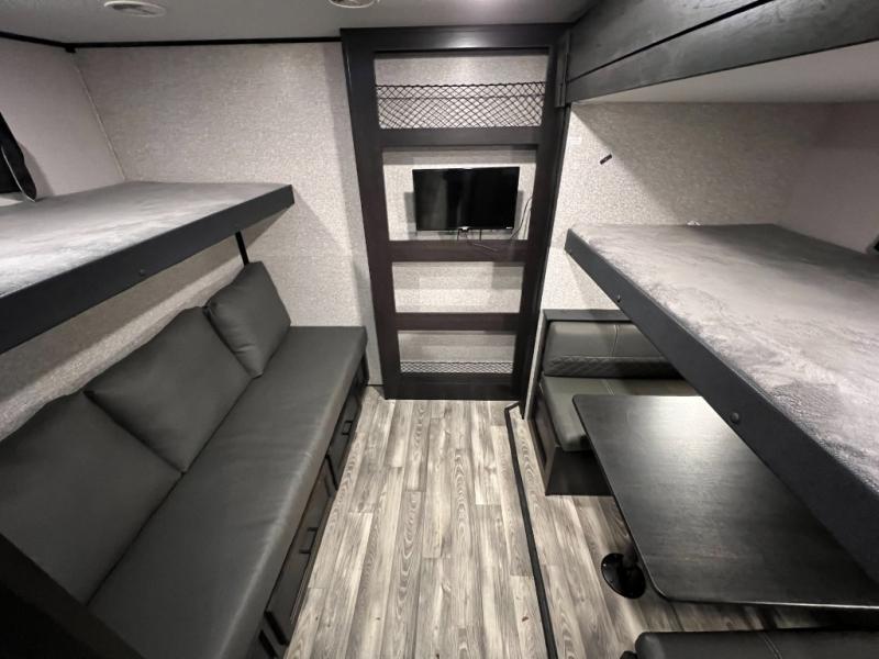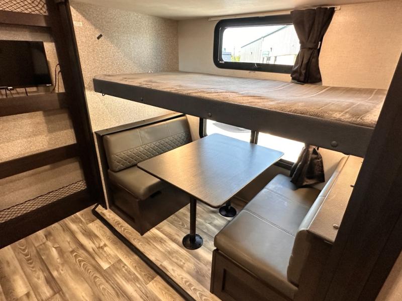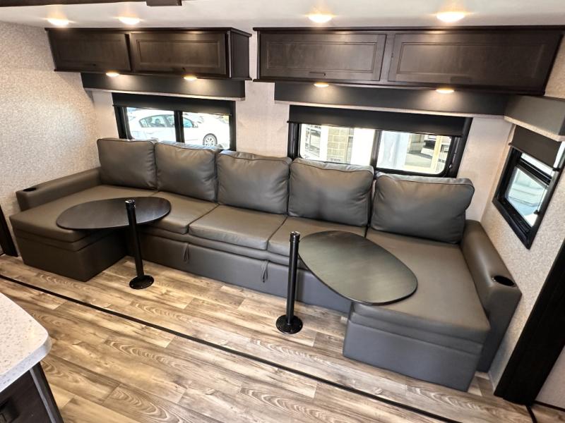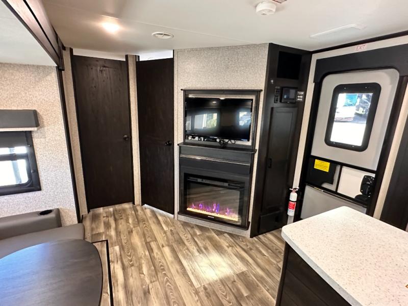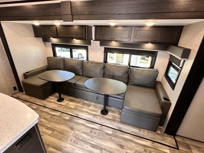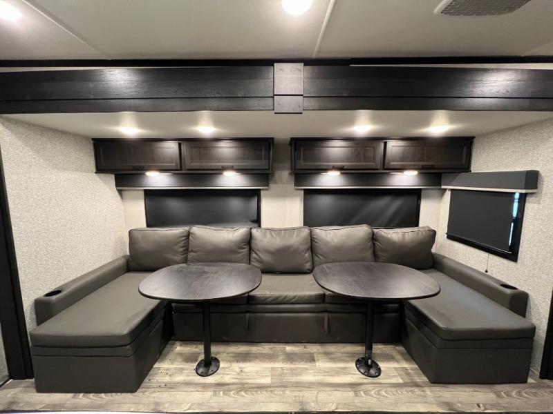 Invite your friends to join you on a road trip thanks to the private bunkhouse with two bunks, a dinette and a bench seat as well as a hutch and wardrobe for their things. You will have your own privacy in the front bedroom with a queen bed slide, a dresser with window above, a mirrored wardrobe for your clothes and a wardrobe prepped for a washer/dryer option. You will also appreciate easy access to the double entry bath which includes a radius shower and linen storage. The cook can make meals with full amenities including a kitchen island and pantry, and everyone can eat at the U-Lounge with two tables or choose the theater seats and table with chairs option in its place while eating and watching a show on the 39" LED HDTV with fireplace below. And the outside kitchen, shower and storage will all come in handy as well.