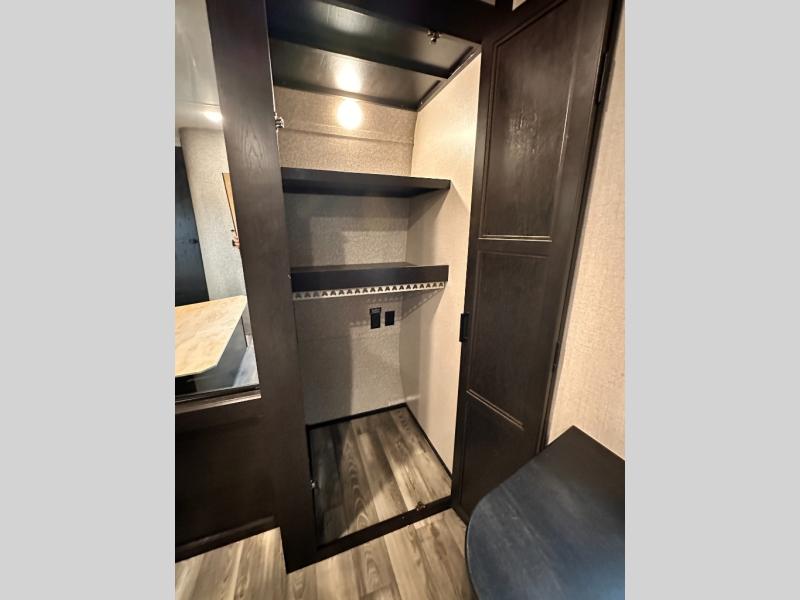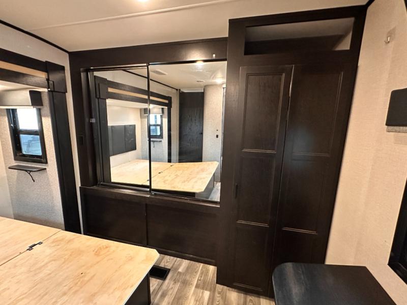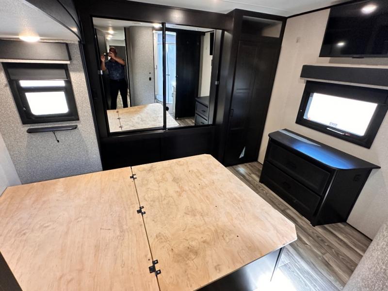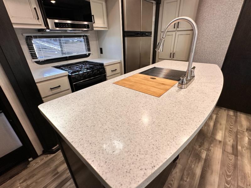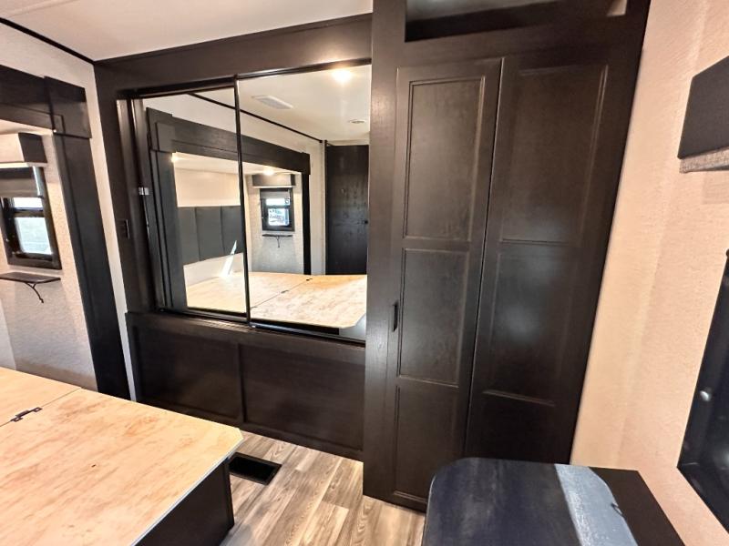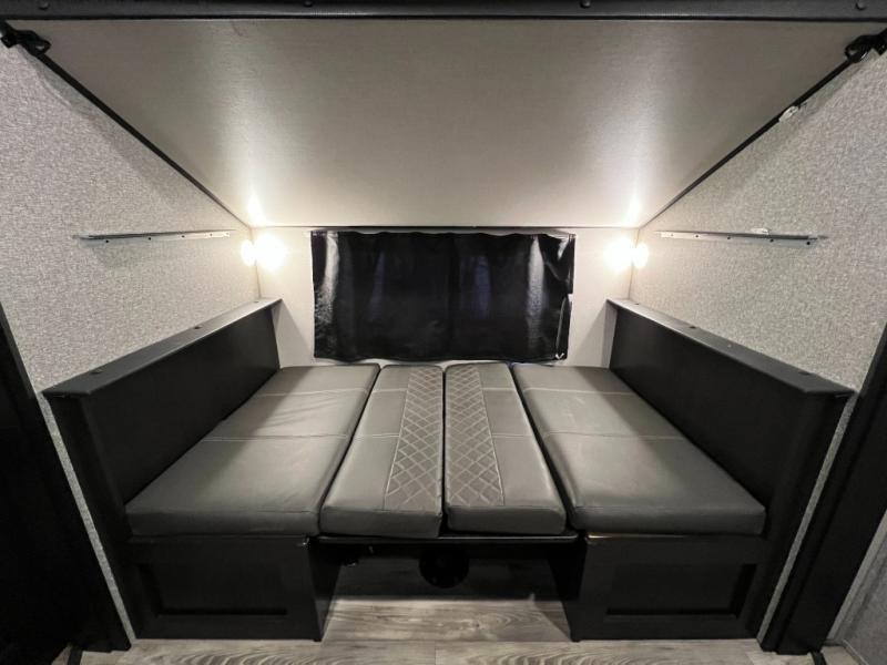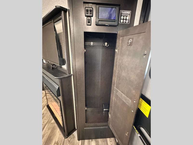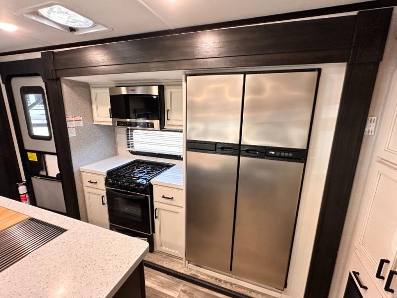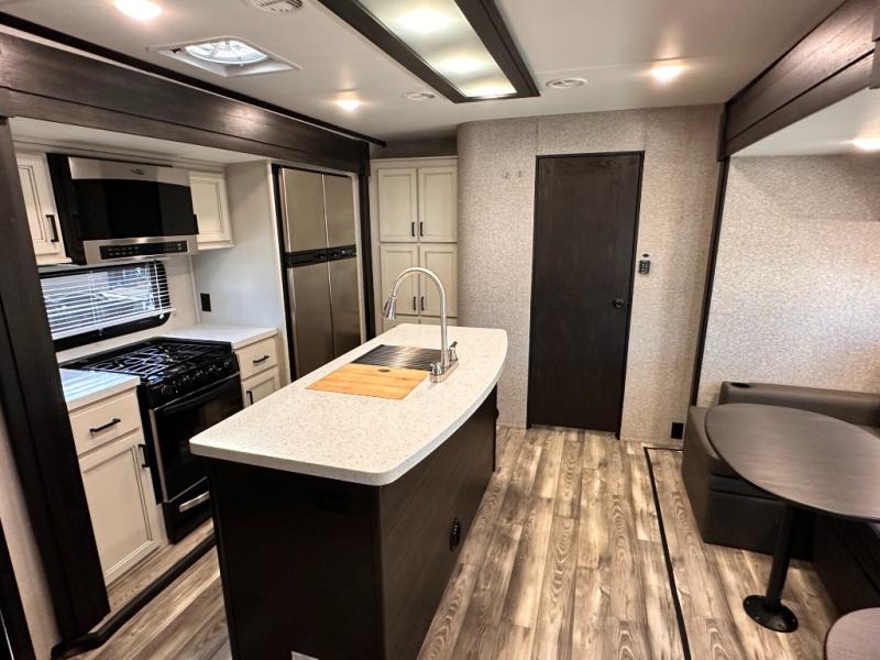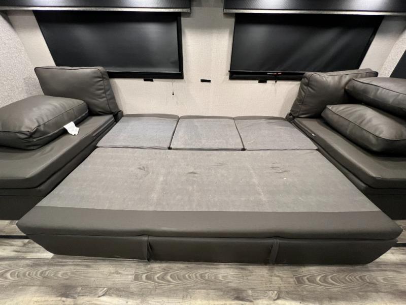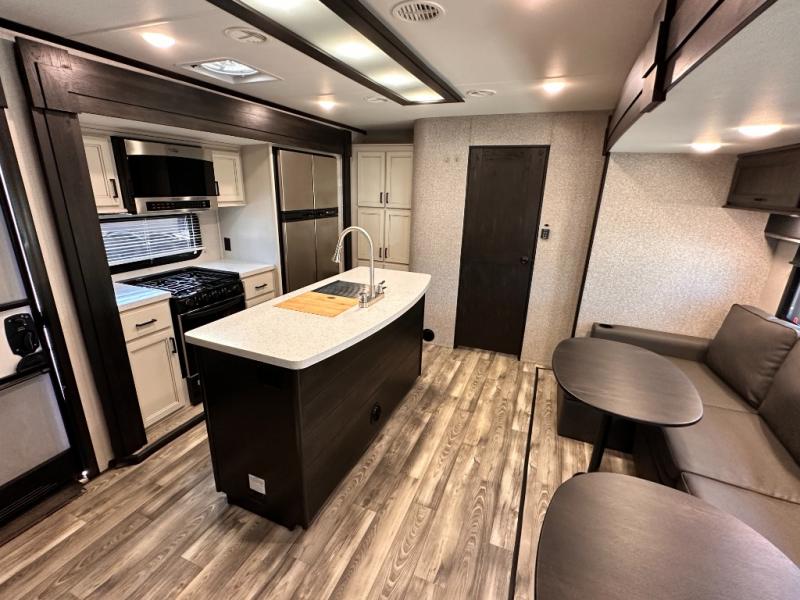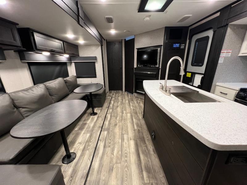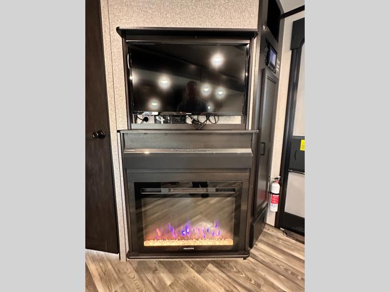 Invite your friends to join you on a road trip thanks to the private bunkhouse with two bunks, a dinette and a bench seat as well as a hutch and wardrobe for their things. You will have your own privacy in the front bedroom with a queen bed slide, a dresser with window above, a mirrored wardrobe for your clothes and a wardrobe prepped for a washer/dryer option. You will also appreciate easy access to the double entry bath which includes a radius shower and linen storage. The cook can make meals with full amenities including a kitchen island and pantry, and everyone can eat at the U-Lounge with two tables or choose the theater seats and table with chairs option in its place while eating and watching a show on the 39" LED HDTV with fireplace below. And the outside kitchen, shower and storage will all come in handy as well.