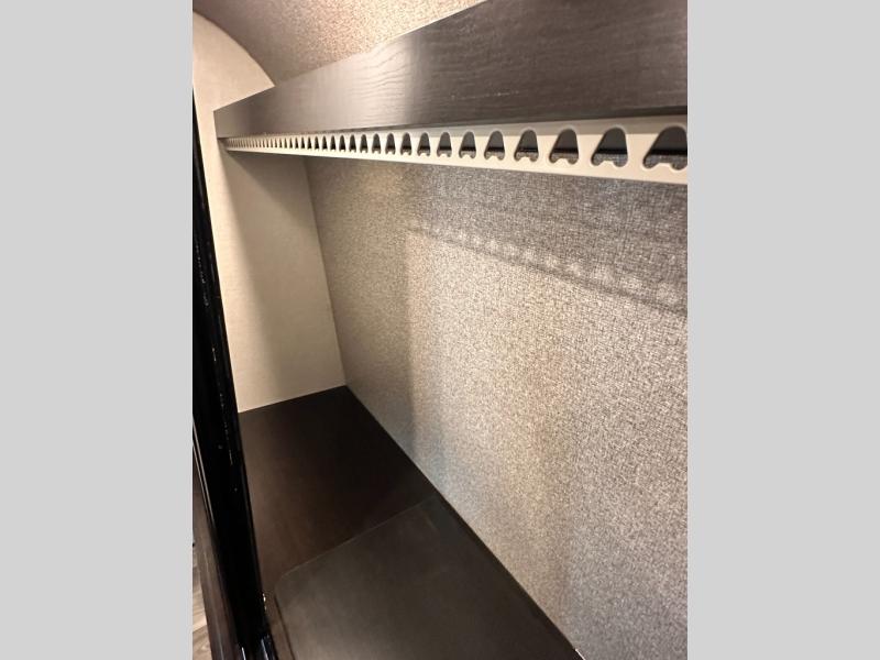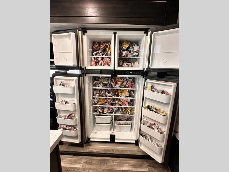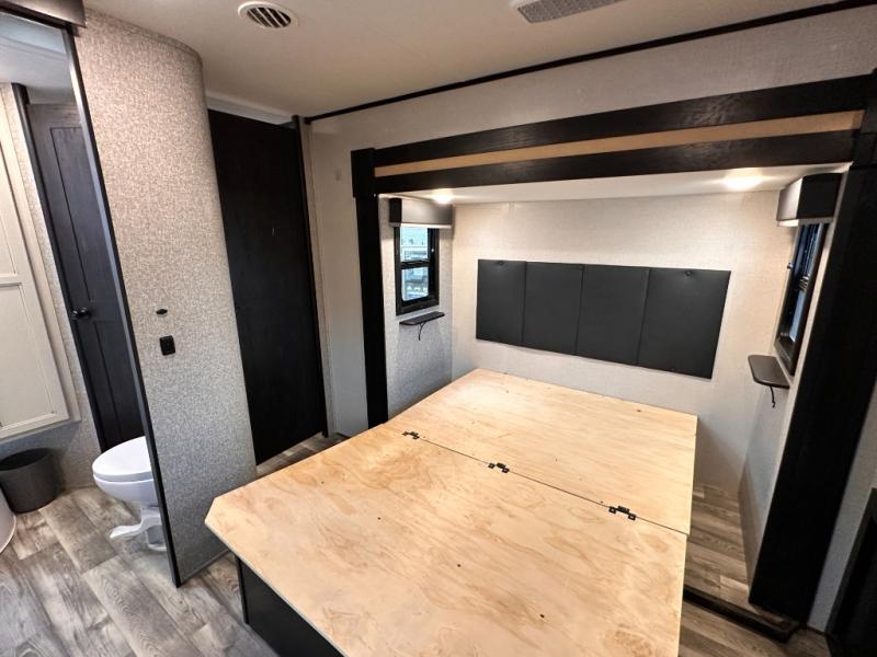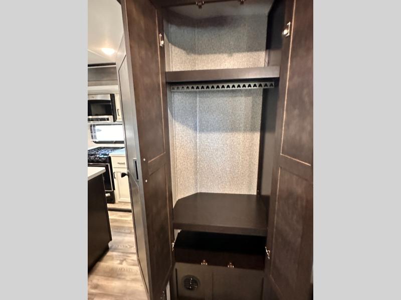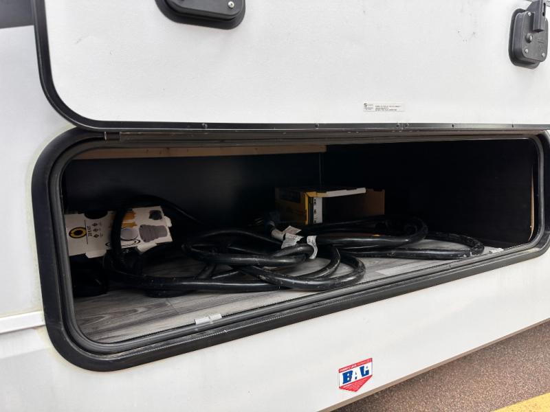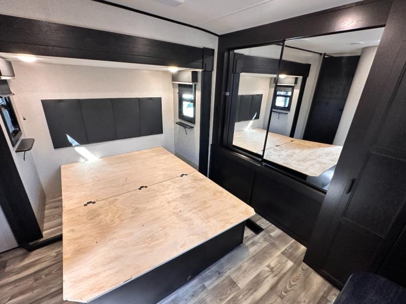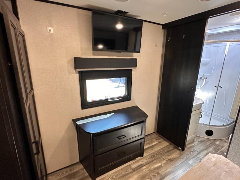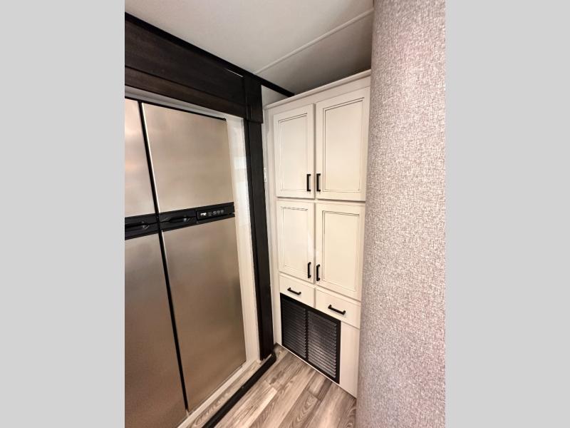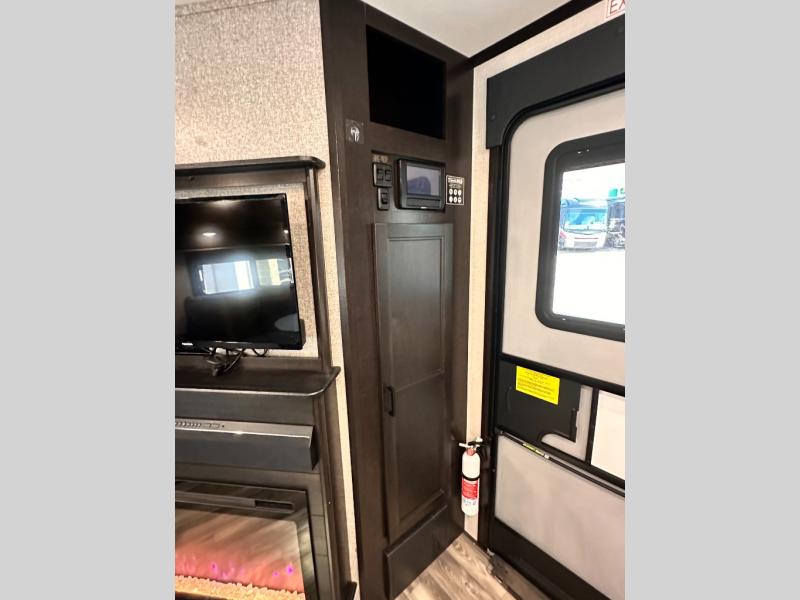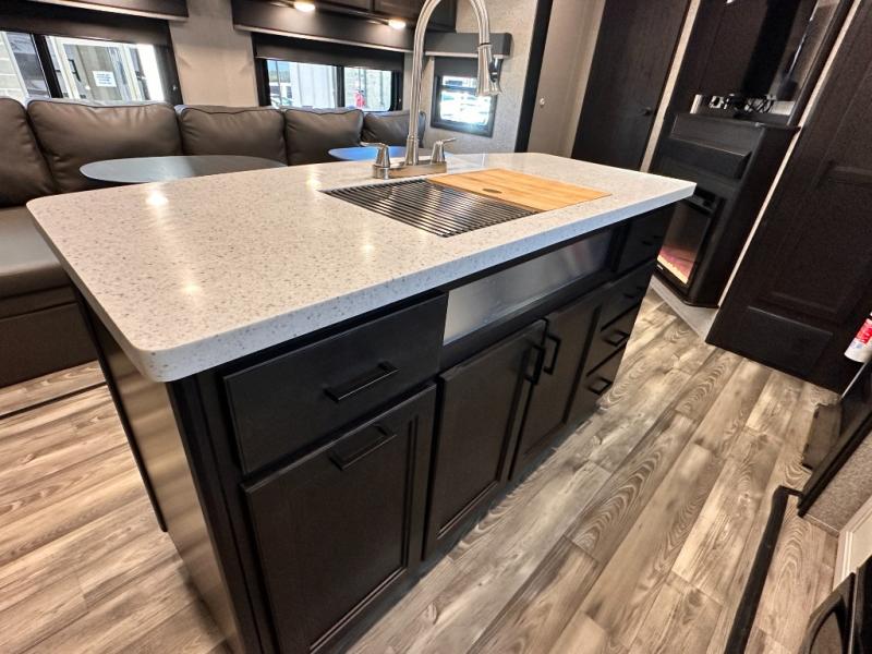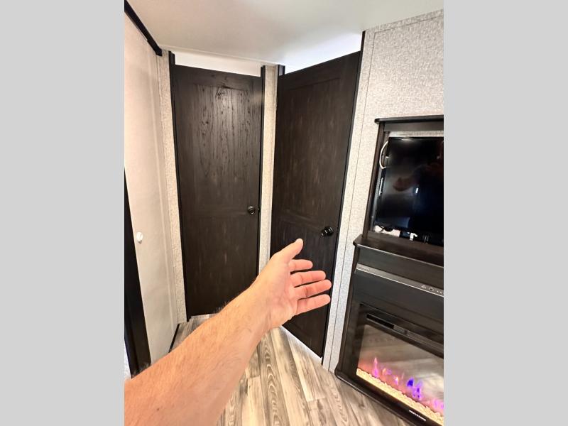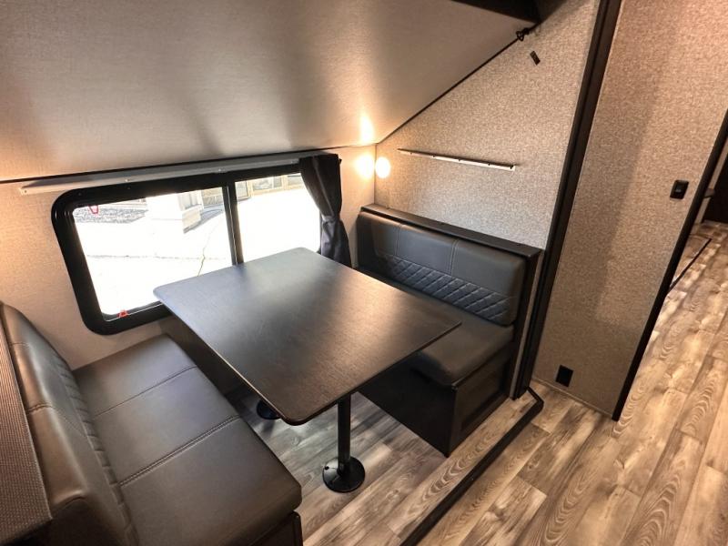 Invite your friends to join you on a road trip thanks to the private bunkhouse with two bunks, a dinette and a bench seat as well as a hutch and wardrobe for their things. You will have your own privacy in the front bedroom with a queen bed slide, a dresser with window above, a mirrored wardrobe for your clothes and a wardrobe prepped for a washer/dryer option. You will also appreciate easy access to the double entry bath which includes a radius shower and linen storage. The cook can make meals with full amenities including a kitchen island and pantry, and everyone can eat at the U-Lounge with two tables or choose the theater seats and table with chairs option in its place while eating and watching a show on the 39" LED HDTV with fireplace below. And the outside kitchen, shower and storage will all come in handy as well.