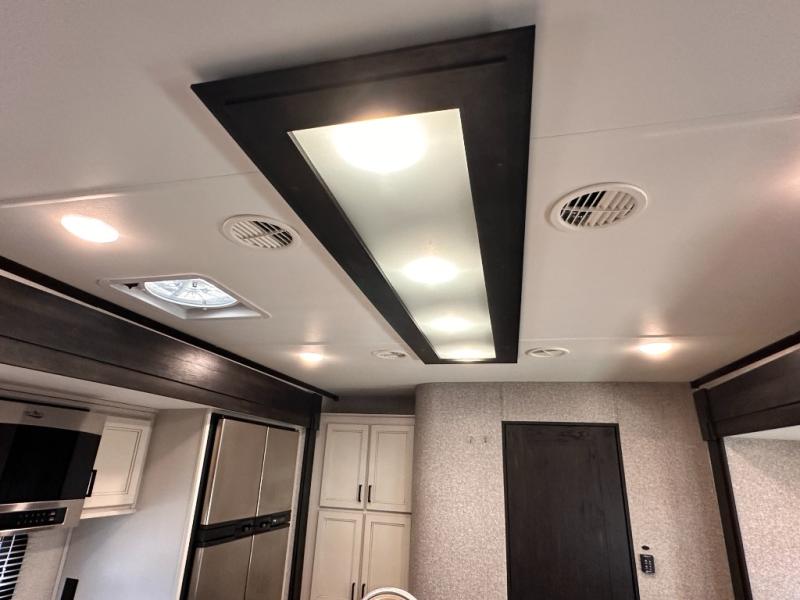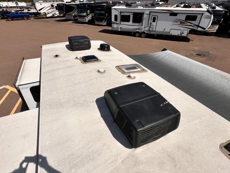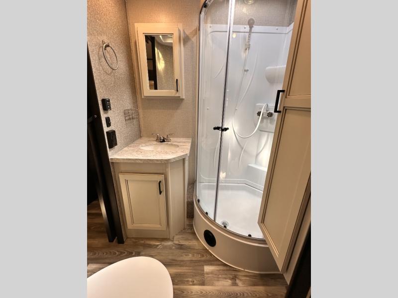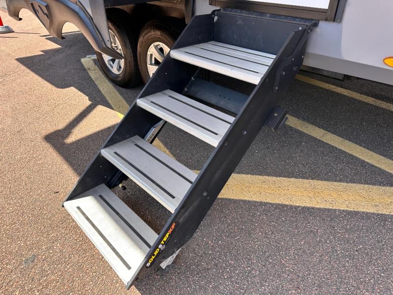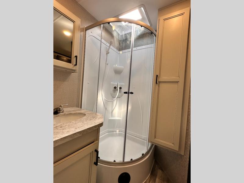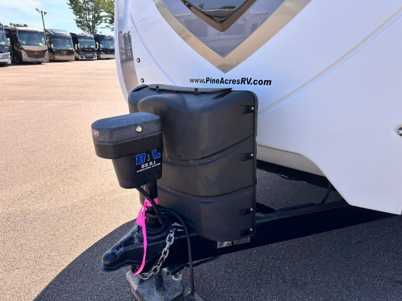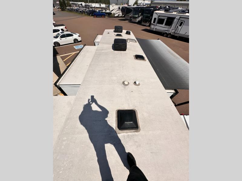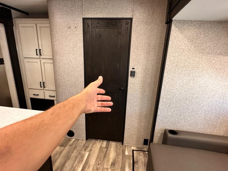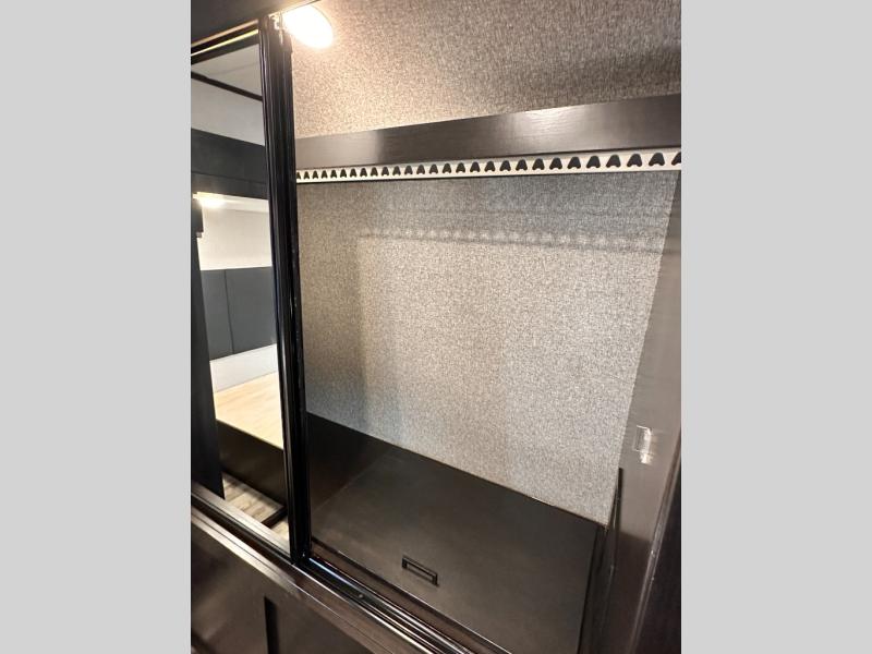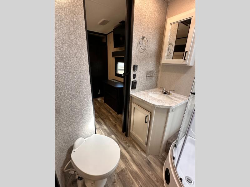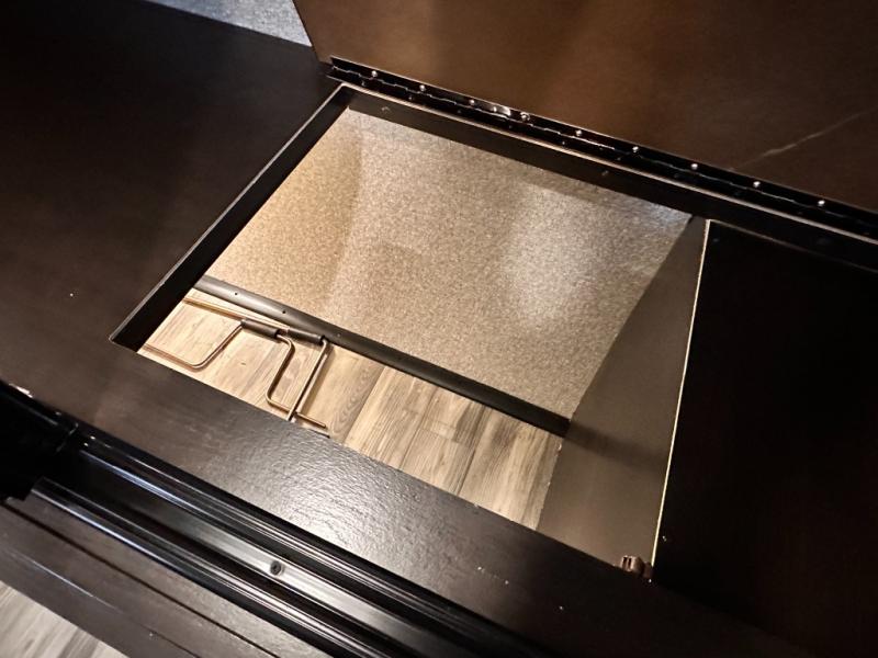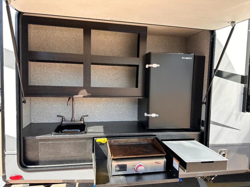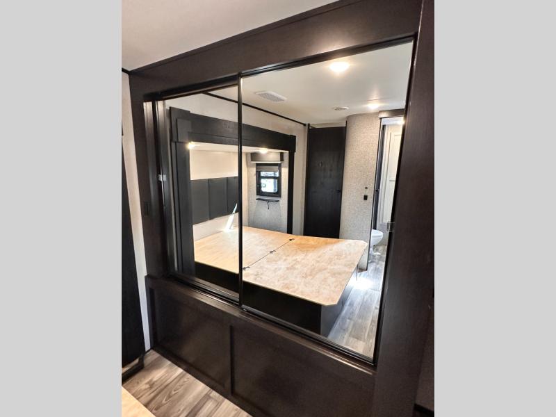Invite your friends to join you on a road trip thanks to the private bunkhouse with two bunks, a dinette and a bench seat as well as a hutch and wardrobe for their things. You will have your own privacy in the front bedroom with a queen bed slide, a dresser with window above, a mirrored wardrobe for your clothes and a wardrobe prepped for a washer/dryer option. You will also appreciate easy access to the double entry bath which includes a radius shower and linen storage. The cook can make meals with full amenities including a kitchen island and pantry, and everyone can eat at the U-Lounge with two tables or choose the theater seats and table with chairs option in its place while eating and watching a show on the 39" LED HDTV with fireplace below. And the outside kitchen, shower and storage will all come in handy as well.