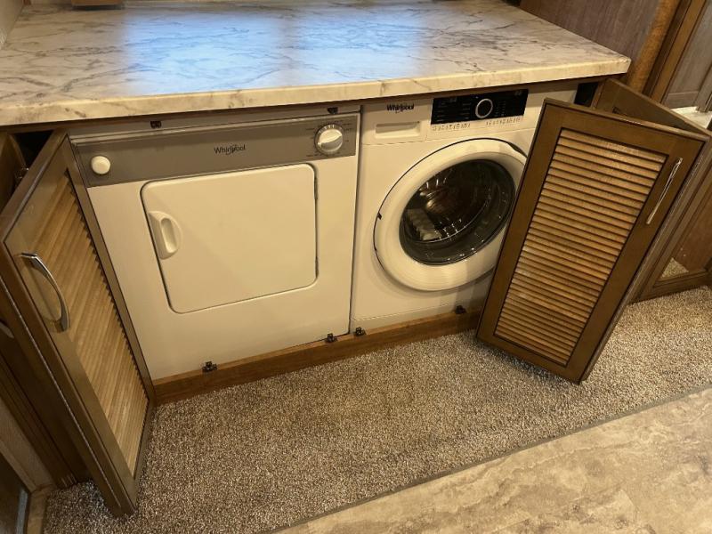 Traveling with a larger group is now easier than ever in this coach with bunk beds, two full baths, and triple slides. The side-by-side washer and dryer will make wash days a breeze, and the large bedroom wardrobe will keep your clothes tidy. Head to the kitchen to prepare a meal on the two burner induction cooktop, or use the convection microwave. There is a residential refrigerator with ice and water in the door, plus a pantry for snacks. After dinner is cleaned up, relax on the sofa sleeper by the fireplace and 43" LED TV, or play a game at the facing dinette!