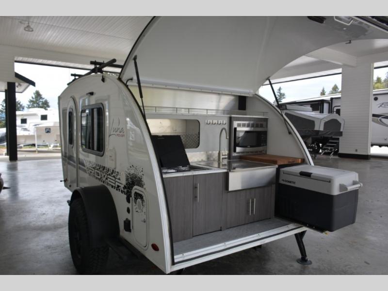 Each Luna teardrop trailer by inTech RV is constructed with an all-aluminum, all-tube, cage frame, a one piece fiberglass roof, plus bubble foil R7 insulation to provide a durable unit made to last. You will always stay cool with the 8,000 BTU A/C and the MaxxAir vent fan. Each model includes an outside kitchen with a 40qt. 12V cooler to store your cold food, a stainless steel cooktop, plus plenty of storage space for all your necessities. Inside, you'll enjoy the Infinity Woven flooring, two tinted windows with shades and screens, a Bluetooth stereo with four speakers and a 32" TV, plus USB ports and outlets to keep your phone and tablet charged. You'll appreciate the 1,775 lbs. to 1,850 lbs. dry weights for easy towing and there are many optional features to choose from, like the Sunseeker awning, the windshield covering, a fireplace, plus more! Choose your favorite layout today