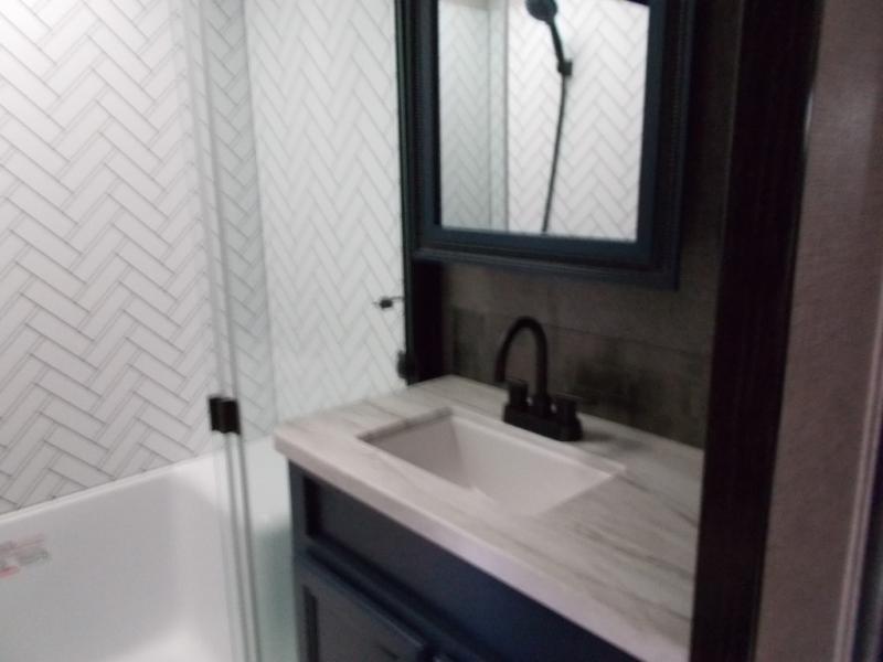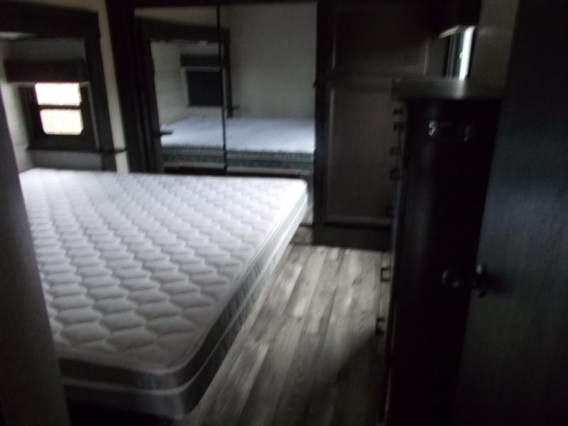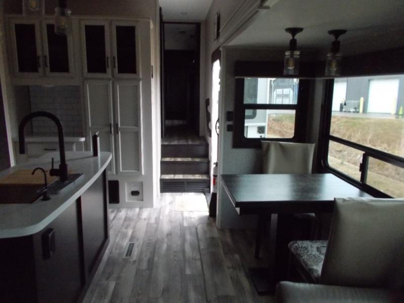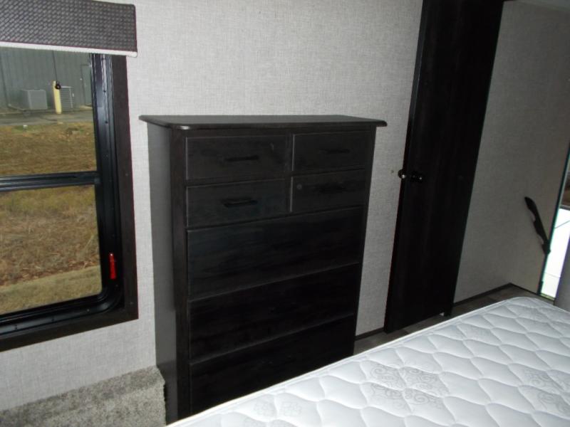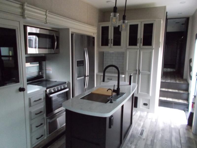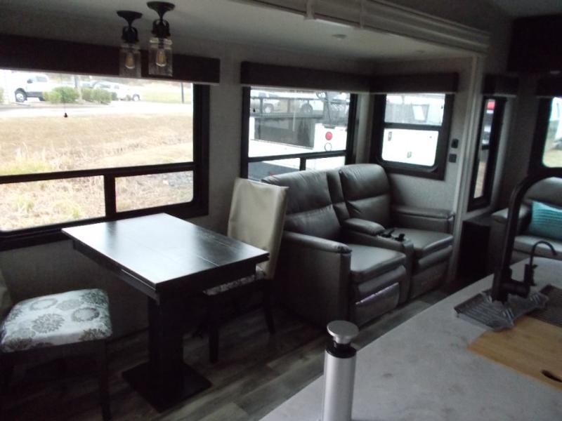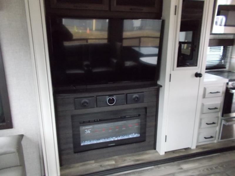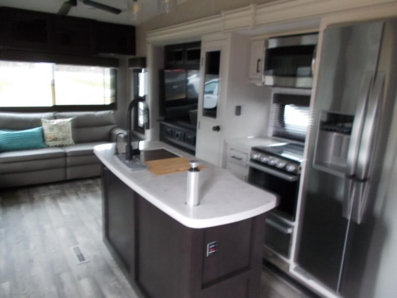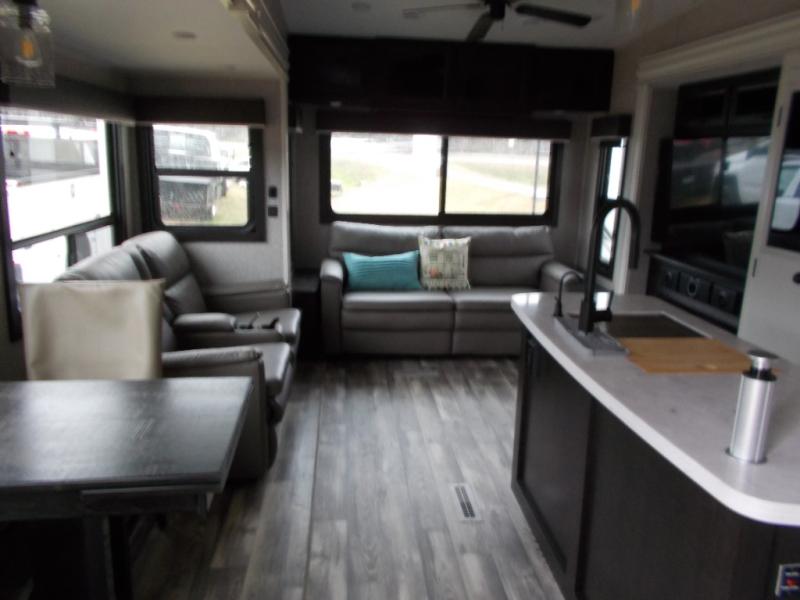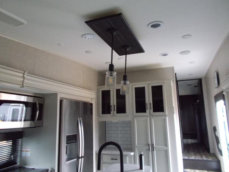 Triple slides for space, plenty of seating spaces, plus a spacious private bedroom make this fifth wheel one you won't want to pass up! You can freshen up each day in the full bath that includes a shower with a seat, a bathroom skylight, plus blue LED nightlights the little ones are sure to love. Once you've cut up some fresh fruit at the kitchen island, whip up some eggs and bacon for breakfast, or just grab the cereal from the walk-in pantry. There is a spacious 21 cu. ft. residential refrigerator, plus a hutch where you can store your own coffee machine. Relax on the tri-fold sofa, theater seat, or free-standing table before heading out for the day. The queen bed slide out in the front private bedroom will be waiting for you when you return, or you can choose the optional king bed for more space to stretch out!