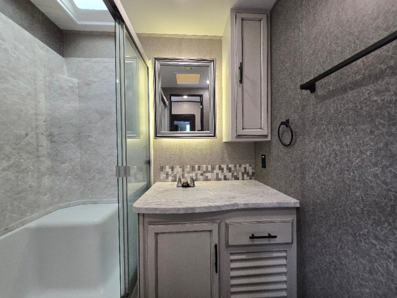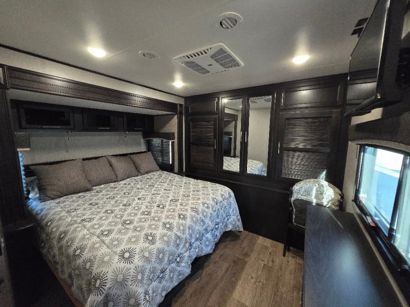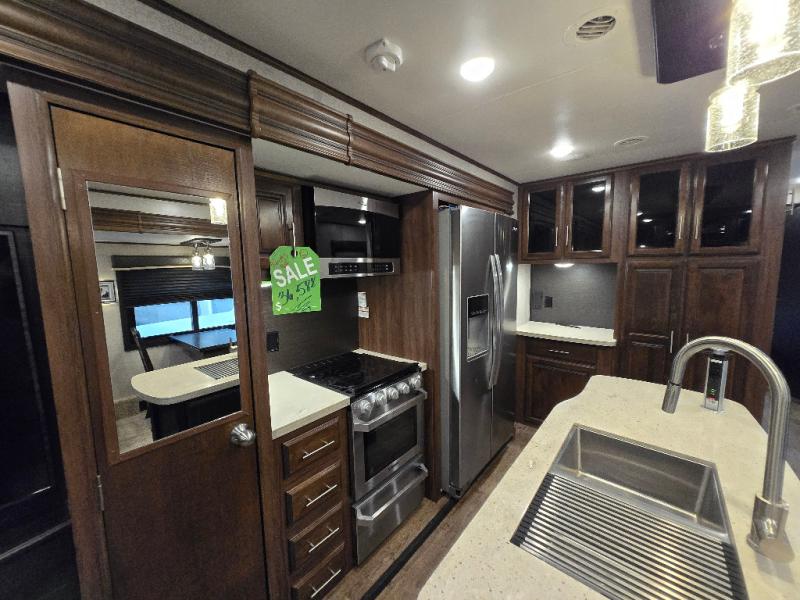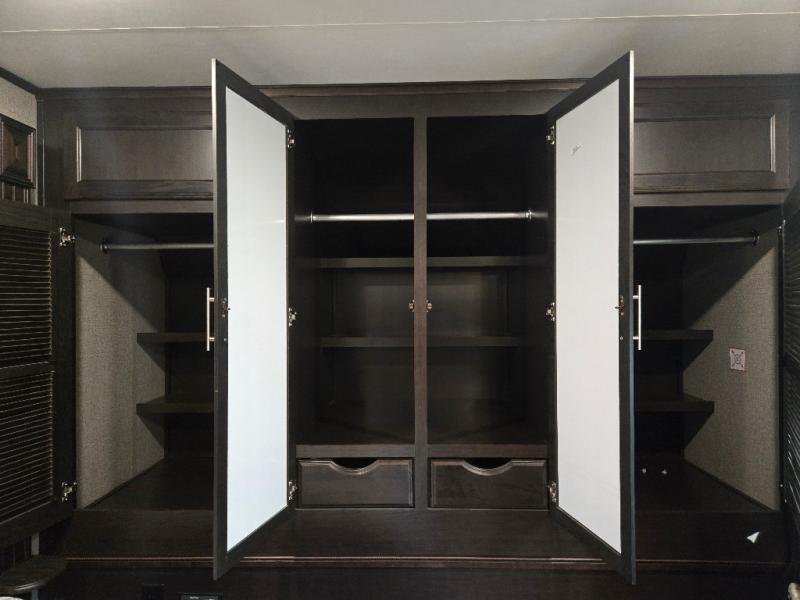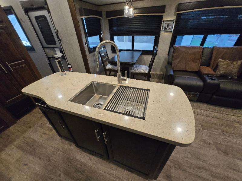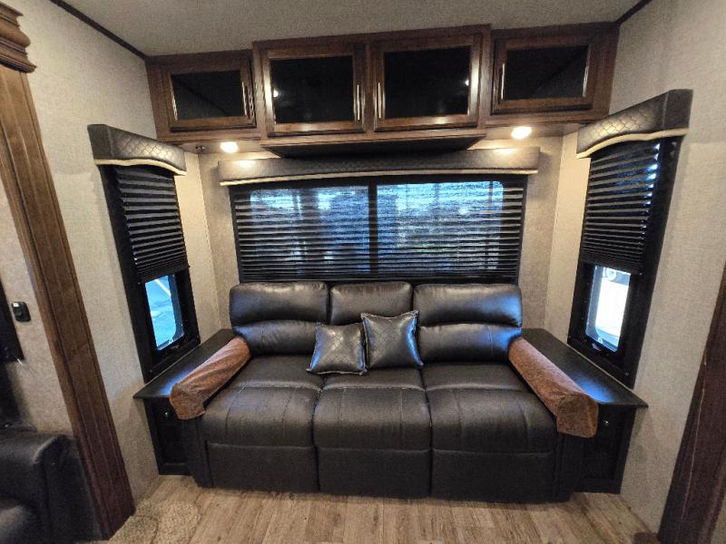 With any Eagle fifth wheel or travel trailer by Jayco you will appreciate durable construction materials, like the Magnum Tuff Roof and the Stonghold VBL laminated walls. The JAYCOMMAND Smart RV system puts you in control of your RV's function, and the 4 Star Handling Package will provide smooth towing from home to camp. Each model features Climate Shield zero-degree tested weather protection and the industry-exclusive HELIX cooling system that features two 15,000 BTU Whisper Quiet A/C's to keep you comfortable year around. Some of the exterior conveniences you are sure to love are the fully enclosed, LED-lit universal docking station, the pass-through storage with Slam-Latch baggage doors, and the painted fiberglass front cap with built-in specialty LED lighting. The Eagle fifth wheels and travel trailers are designed to make you feel at home with solid hardwood slide fascia, residential vinyl flooring, bathroom tile backsplash, and plenty of storage for all your belongings.