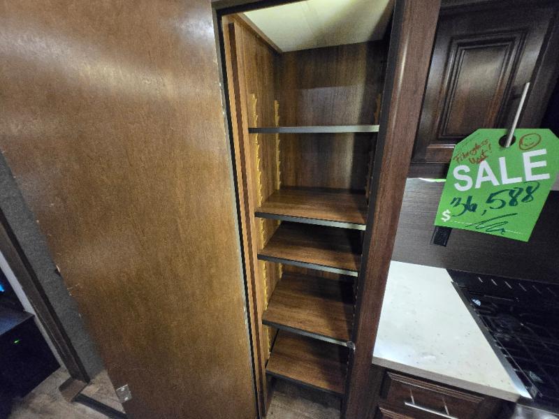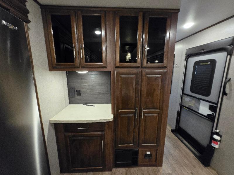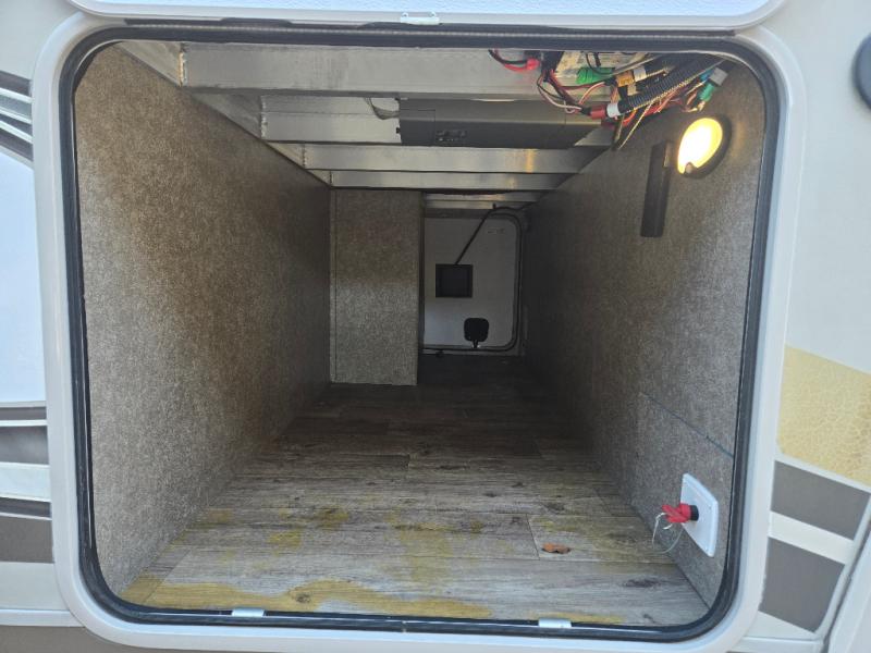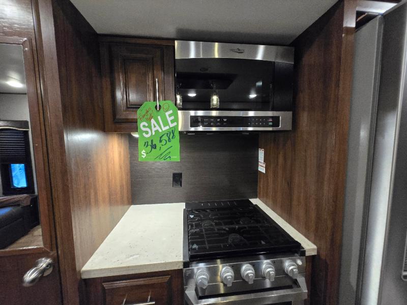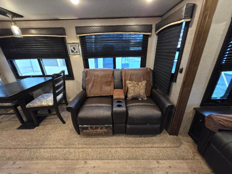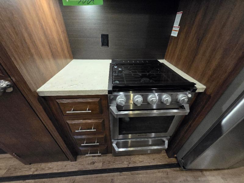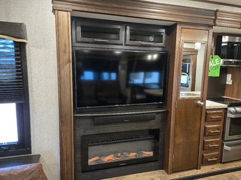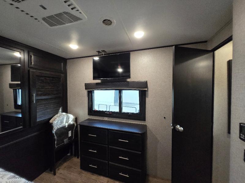 Plan to stay awhile in this cozy travel trailer than can sleep four each night. Once you arrive at your destination you can set up the two power awnings and unload your gear from the pass-through storage. You'll find comfortable seating spaces in the rear living area on the tri-fold sofa and the theatre seat, and the fireplace will make it feel more like home. You may want to set up a snack bar at the kitchen island and watch a movie on the 4K Ultra HD Smart TV, or you can play a game at the free-standing table with chairs. This model features a spacious bathroom with a large shower with a seat, plus a linen closet for your towels, and you'll feel right at home in the front bedroom with a queen bed and plenty of storage space for your clothes.