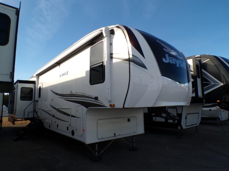 With any Eagle fifth wheel or travel trailer by Jayco you will appreciate durable construction materials, like the Magnum Tuff Roof and the Stonghold VBL laminated walls. The JAYCOMMAND Smart RV system puts you in control of your RV's function, and the 4 Star Handling Package will provide smooth towing from home to camp. Each model features Climate Shield zero-degree tested weather protection and the industry-exclusive HELIX cooling system that features two 15,000 BTU Whisper Quiet A/C's to keep you comfortable year around. Some of the exterior conveniences you are sure to love are the fully enclosed, LED-lit universal docking station, the pass-through storage with Slam-Latch baggage doors, and the painted fiberglass front cap with built-in specialty LED lighting. The Eagle fifth wheels and travel trailers are designed to make you feel at home with solid hardwood slide fascia, residential vinyl flooring, bathroom tile backsplash, and plenty of storage for all your belongings.