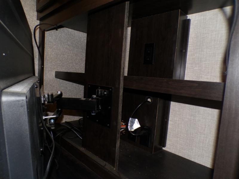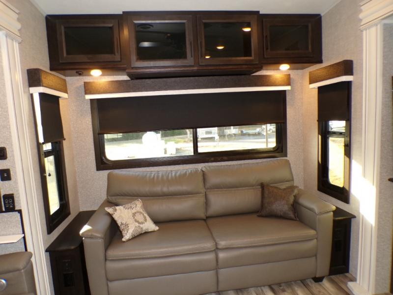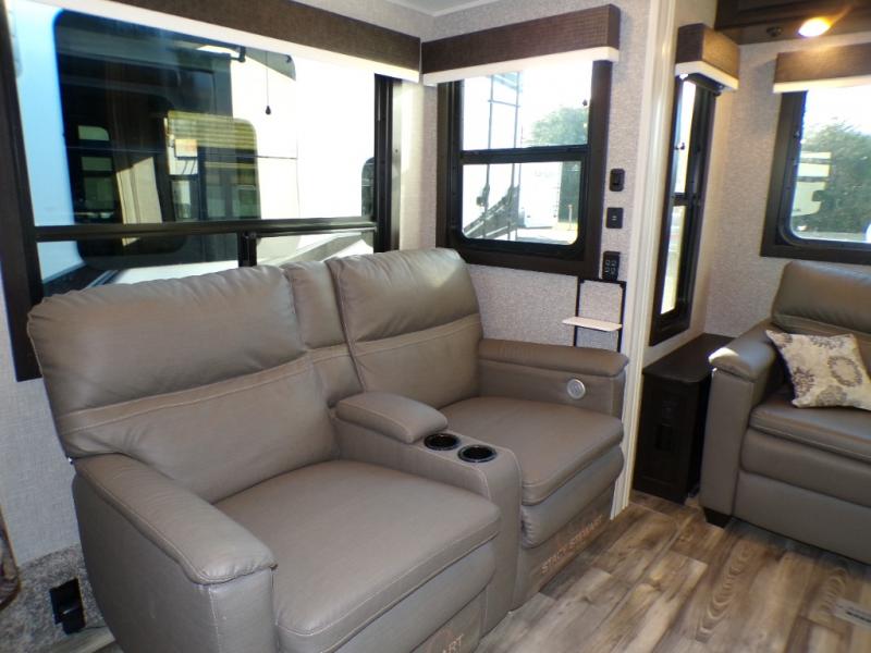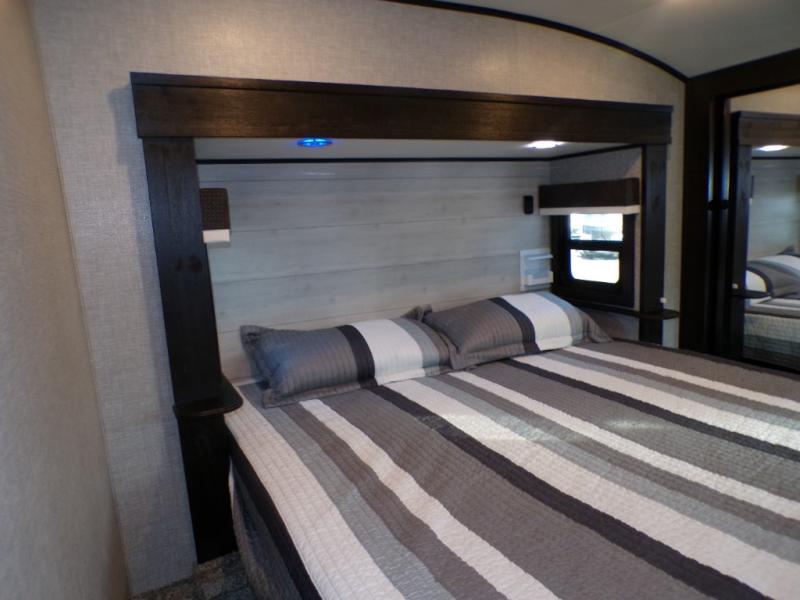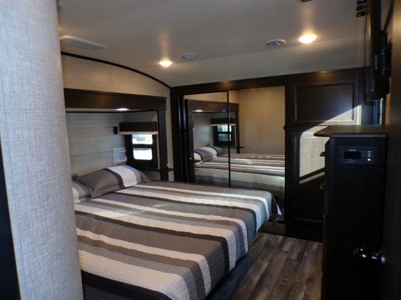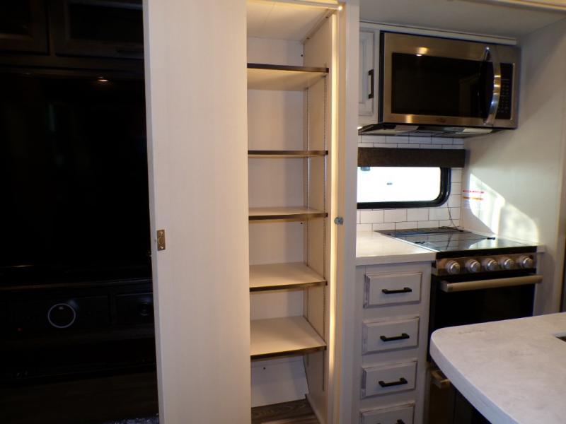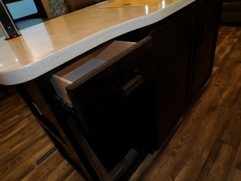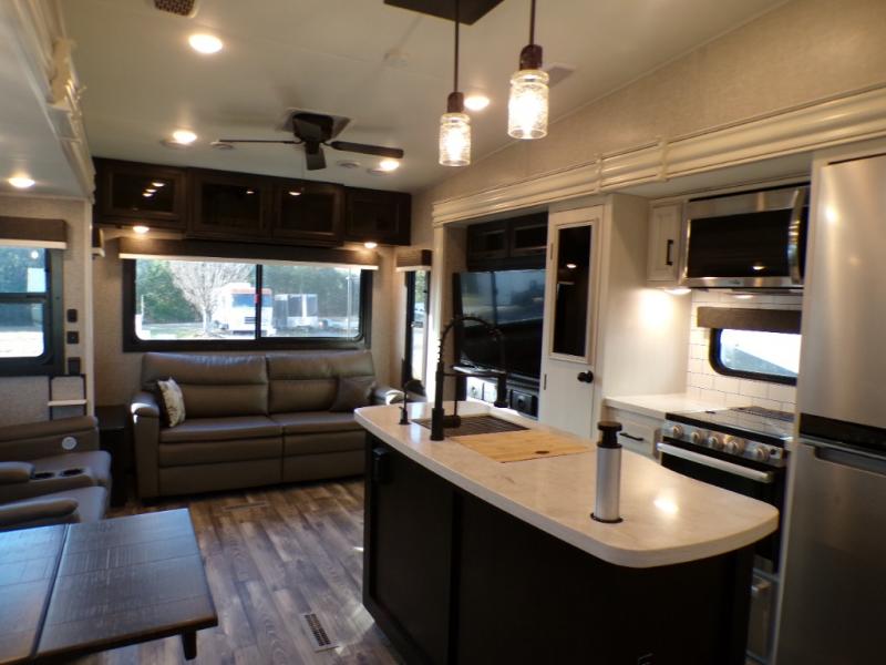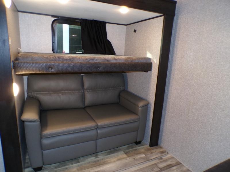 This fifth wheel with four slides is one your whole crew will love! There is a middle bunkhouse with a tri-fold sofa, a top bunk, and a desk, allowing this room to become an office if you need it. The loft above the bunkhouse will be a big hit with the little ones, and the full bath is centrally located so everyone can use it easily. You will have the front private bedroom all to yourselves with a queen bed slide out, a chest with an TV option, plus washer and dryer prep in the walk-in closet. The main living area includes everything you need to relax in comfort, like the theater seat, tri-fold sofa, and entertainment center with a fireplace. The chef will enjoy the extra counter space provided by the kitchen island, and there is plenty of storage with the walk-in pantry, the hutch, and the 21 cu. ft. residential refrigerator. This model even has an outside kitchen, two power awnings, and outside storage for all your gear!