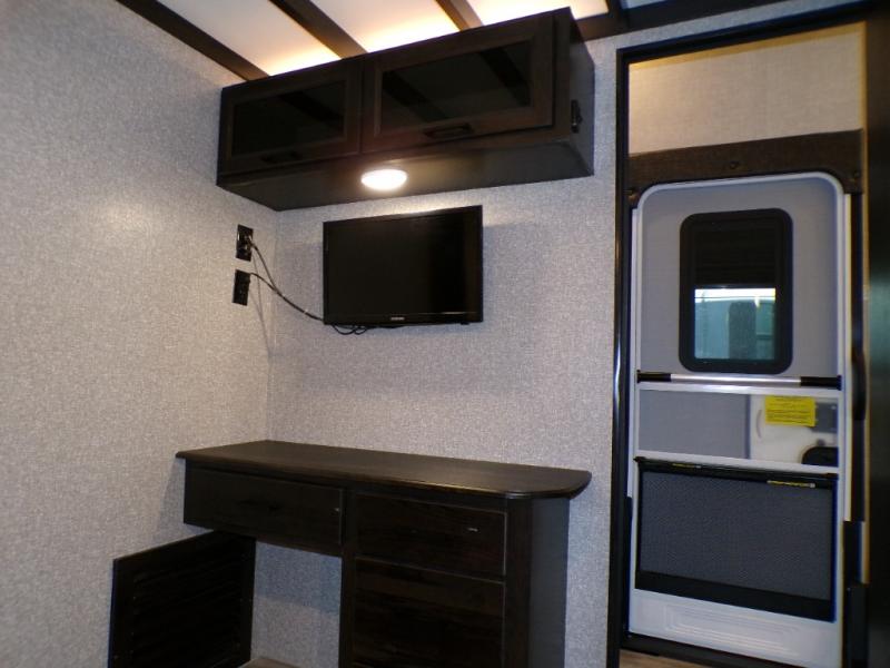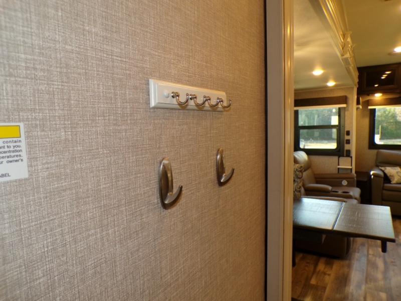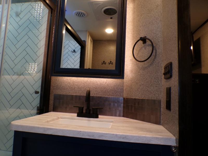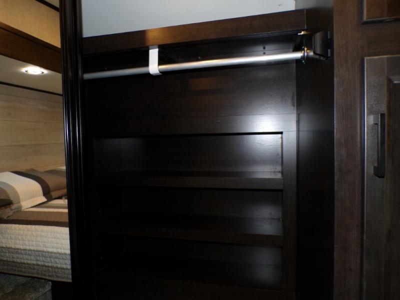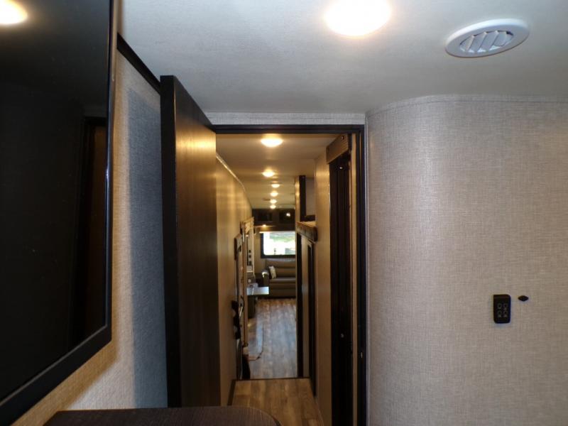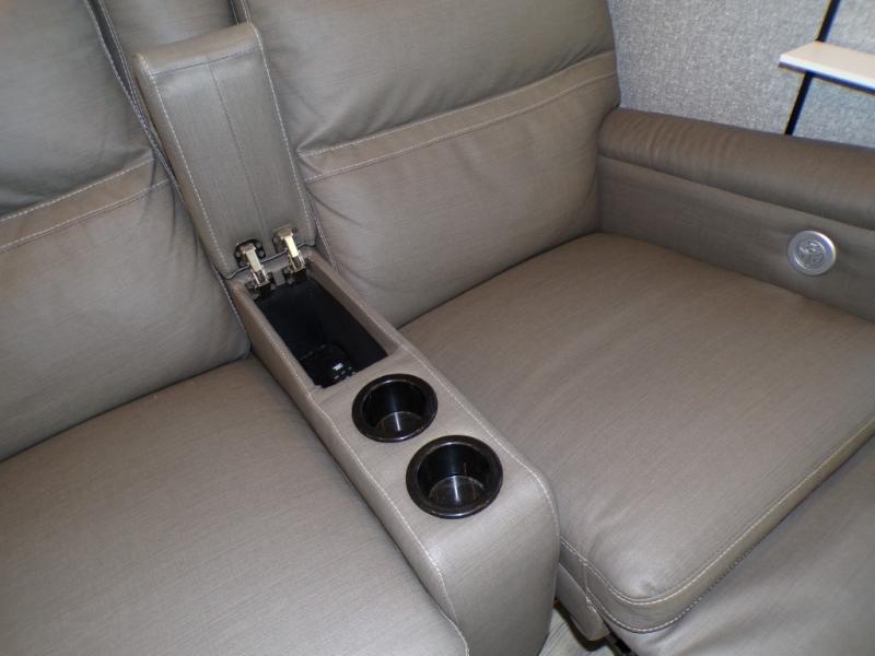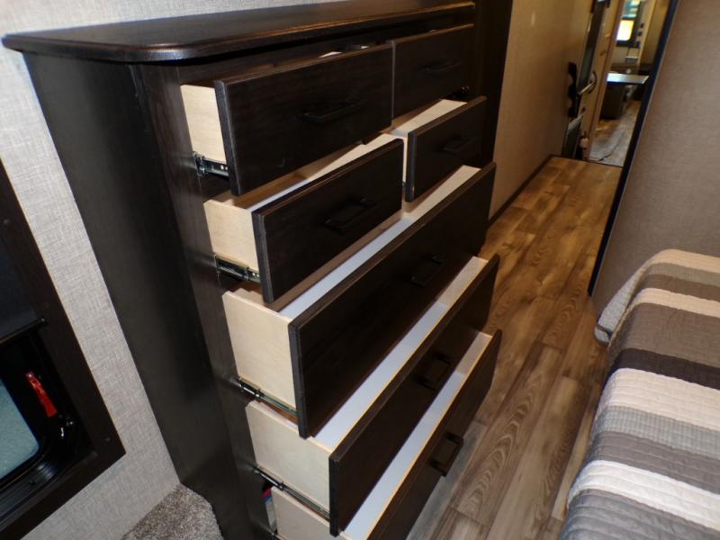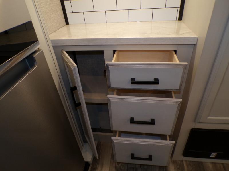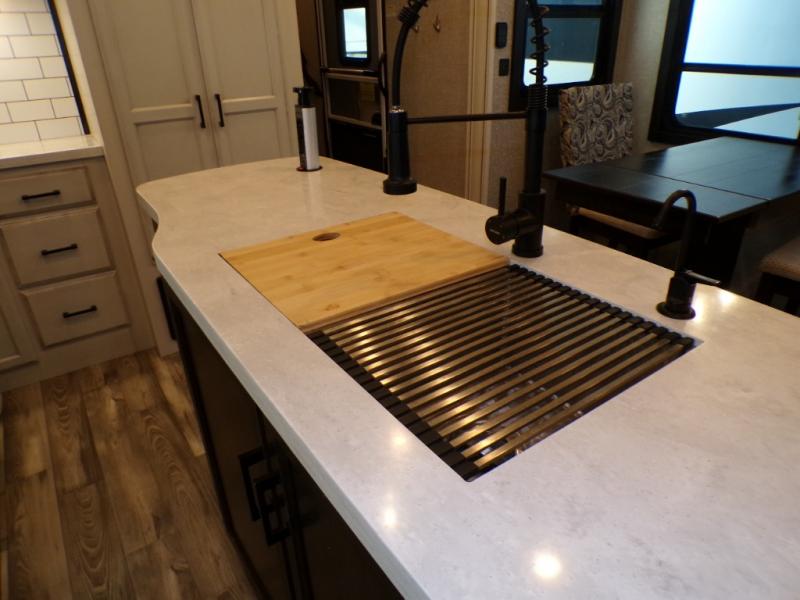 This fifth wheel with four slides is one your whole crew will love! There is a middle bunkhouse with a tri-fold sofa, a top bunk, and a desk, allowing this room to become an office if you need it. The loft above the bunkhouse will be a big hit with the little ones, and the full bath is centrally located so everyone can use it easily. You will have the front private bedroom all to yourselves with a queen bed slide out, a chest with an TV option, plus washer and dryer prep in the walk-in closet. The main living area includes everything you need to relax in comfort, like the theater seat, tri-fold sofa, and entertainment center with a fireplace. The chef will enjoy the extra counter space provided by the kitchen island, and there is plenty of storage with the walk-in pantry, the hutch, and the 21 cu. ft. residential refrigerator. This model even has an outside kitchen, two power awnings, and outside storage for all your gear!