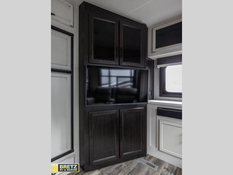 This travel trailer is perfect for two people with a passion for camping! Start each morning feeling well rested after sleeping on the queen bed in the front private bedroom and it has wardrobes on either side of it, plus a wardrobe/linen closet for more clothes and towels to be stored. Grab some eggs from the refrigerator and fry them up on the three burner stainless steel range then enjoy them at the free standing table and chairs. Behind the entertainment center is a walk-in pantry to store your favorite snacks and enjoy them while you relax on the tri-fold sofa. You can even add the optional fireplace to make your evenings cozier!