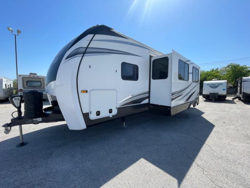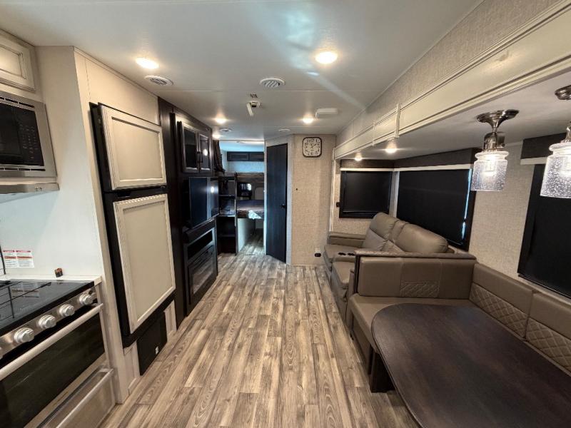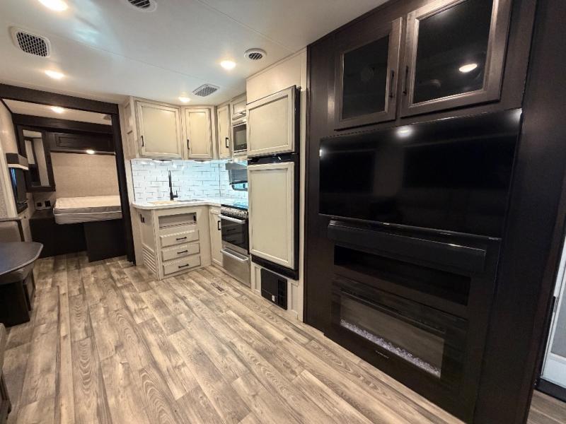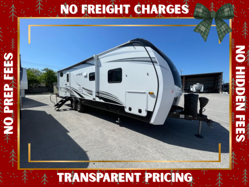 Experience a comfortable tow with every one of these Jayco Eagle HT fifth wheels and travel trailers! They are built with a Stronghold VBL aluminum frame, vacuum bond laminated gel-coated fiberglass exterior walls, and a Magnum Truss roof system with a one piece, seamless DiFlex II material that has been tested as the strongest roof in the industry. The HELIX cooling system comes with an exterior mounted 15,000 BTU "Whisper Quiet" A/C unit, Jayco exclusive insulated dual duct design, directional and closeable A/C vents, and larger air vents with user accessible filters so you can stay cool even on the hottest summer day. With a mandatory Luxury package, you will get handy features like the JAYCOMMAND smart RV system to control your unit at the touch of a finger, an electric auto-leveling so you can set up quick and easy, and blackout roller shades for added privacy. Come find the right one for you today!
