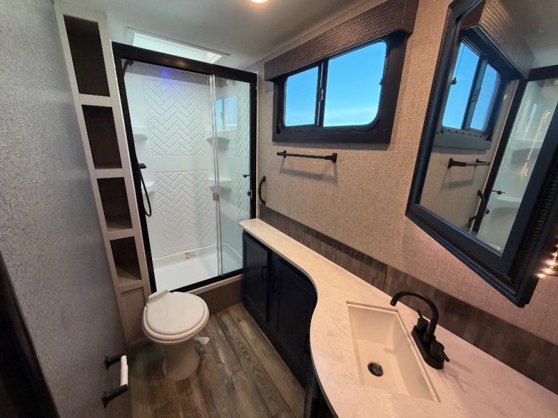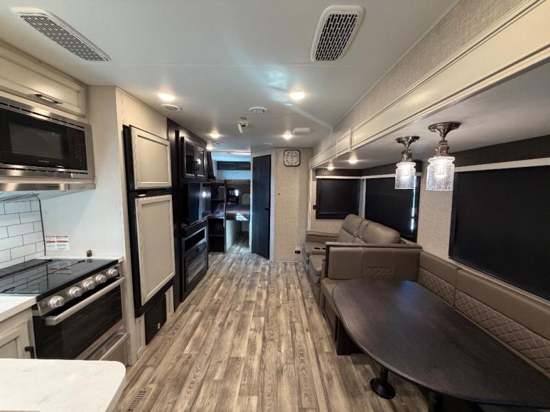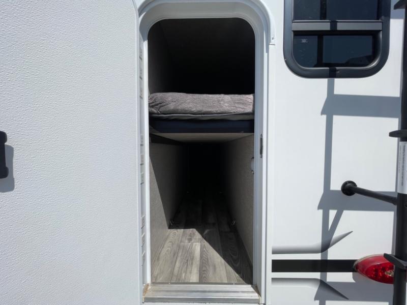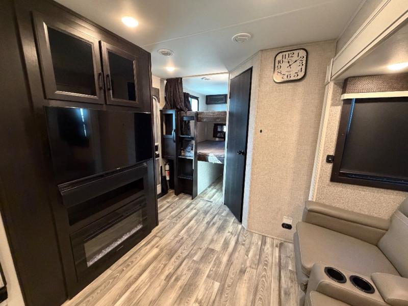 There's a lot to love about this travel trailer! From the set of 48" x 80" bunk beds with storage in the steps to the walk-in pantry behind the swing-out entertainment center with a fireplace for a cozy evening indoors. Everyone can freshen up in the rear corner bathroom with the shower, keep their towel close by with the linen closet, and have plenty of countertop space to get ready in the mornings. The tri-fold sofa and U-shaped dinette slide offer comfortable places to sit, dine, and play games, as well as transform into extra sleeping spaces. The front private bedroom has a queen bed with wardrobes on either side and another wardrobe to keep your clothes looking their best. You even have an outside kitchen to cook your meals at while watching others play a game of cornhole!