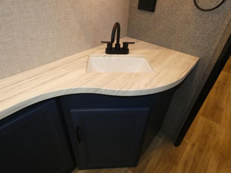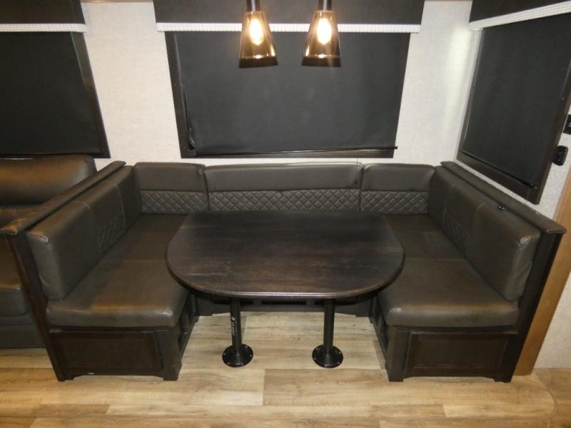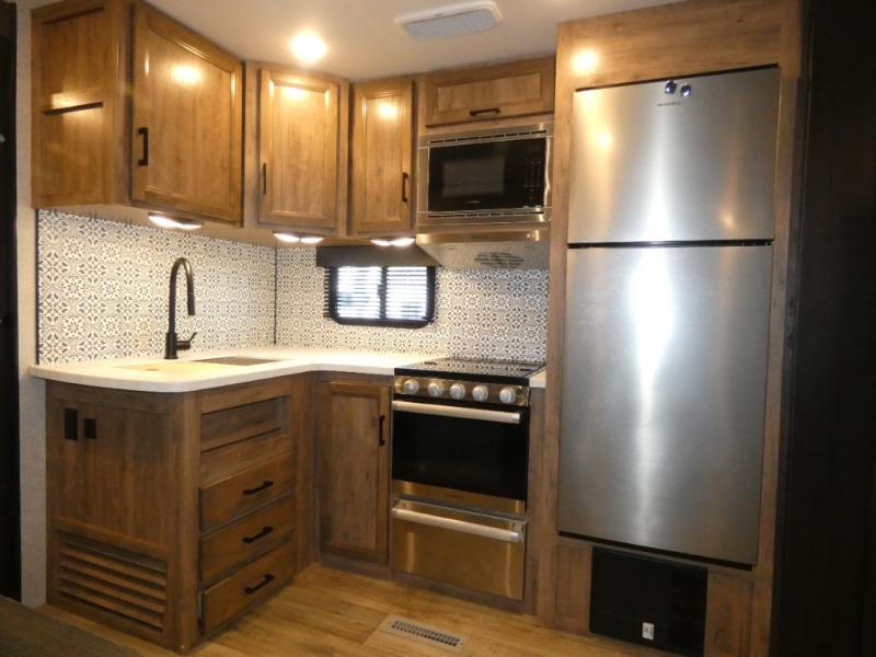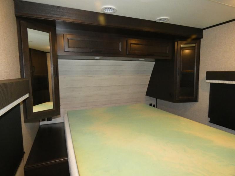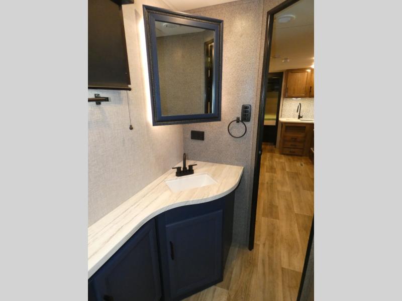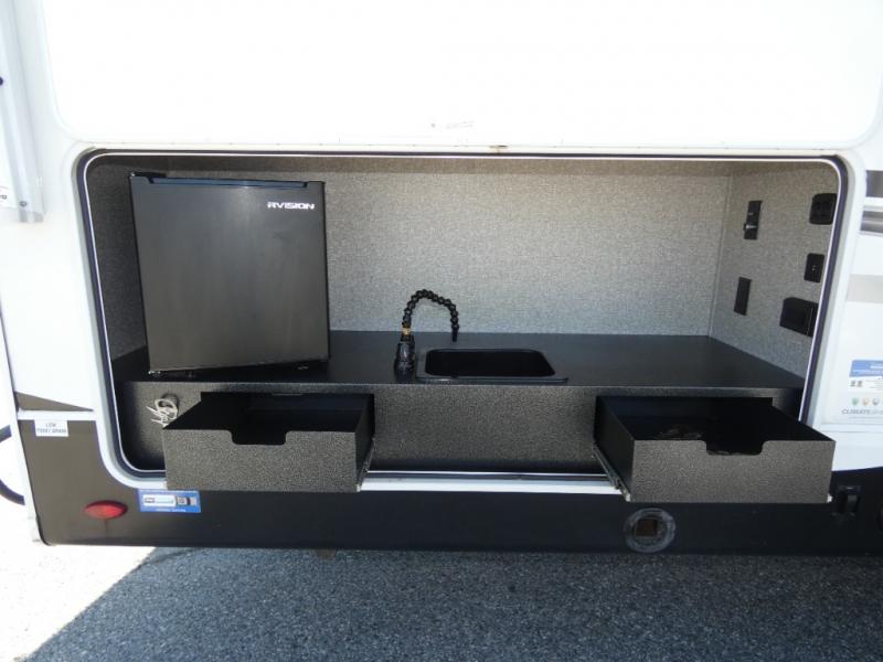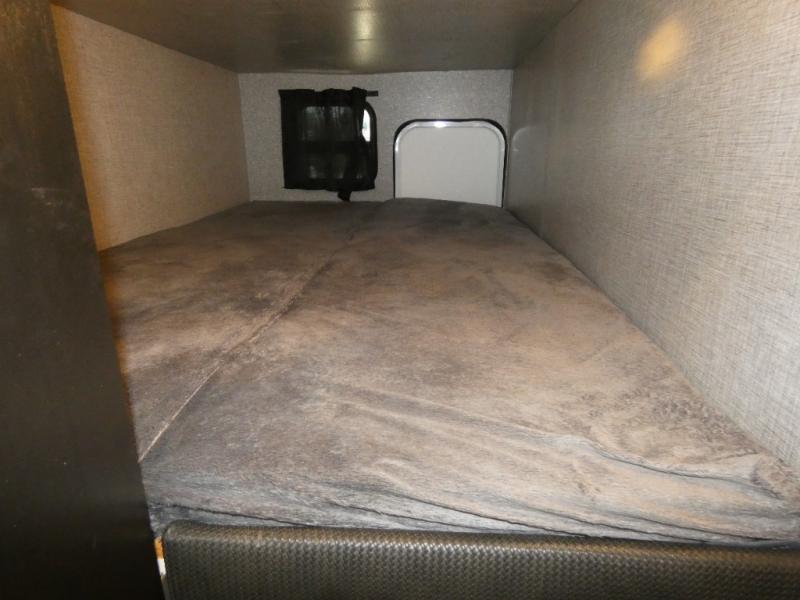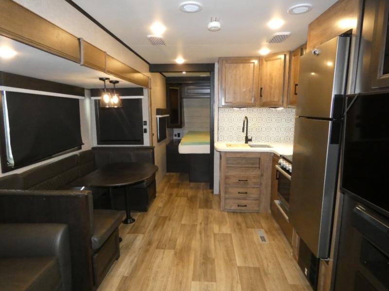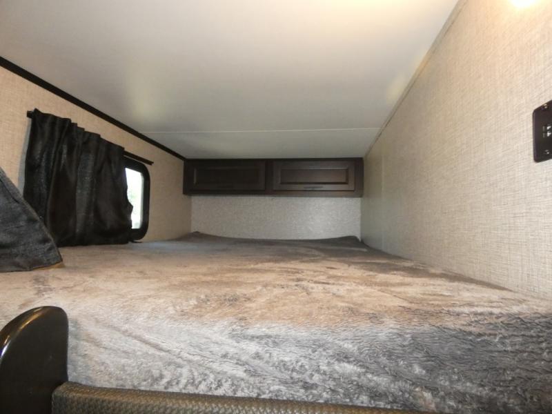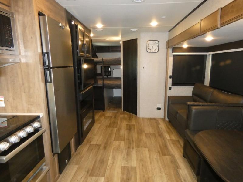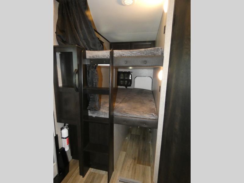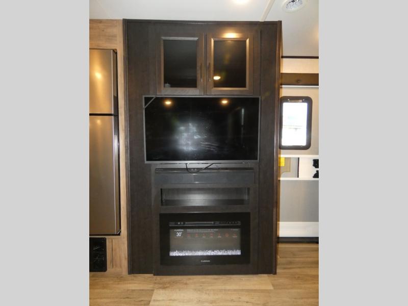 There's a lot to love about this travel trailer! From the set of 48" x 80" bunk beds with storage in the steps to the walk-in pantry behind the swing-out entertainment center with a fireplace for a cozy evening indoors. Everyone can freshen up in the rear corner bathroom with the shower, keep their towel close by with the linen closet, and have plenty of countertop space to get ready in the mornings. The tri-fold sofa and U-shaped dinette slide offer comfortable places to sit, dine, and play games, as well as transform into extra sleeping spaces. The front private bedroom has a queen bed with wardrobes on either side and another wardrobe to keep your clothes looking their best. You even have an outside kitchen to cook your meals at while watching others play a game of cornhole!