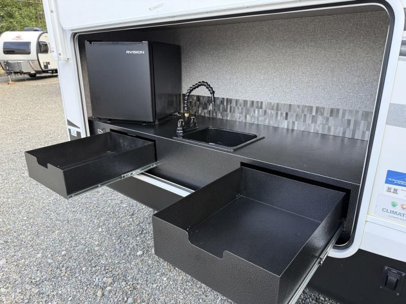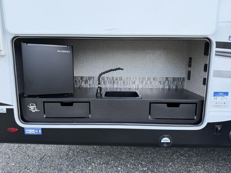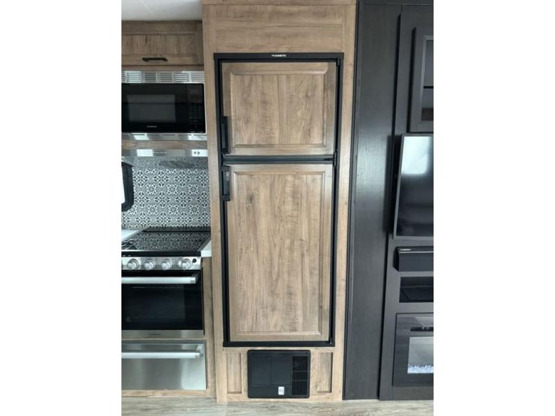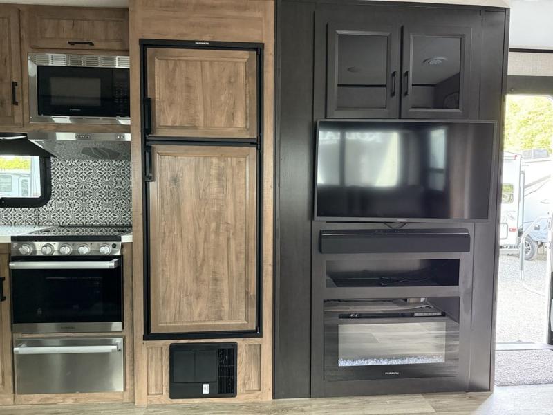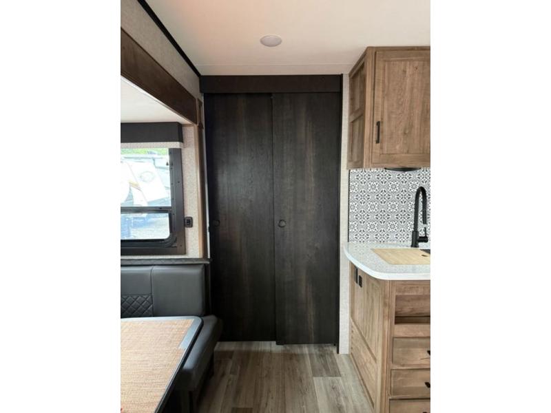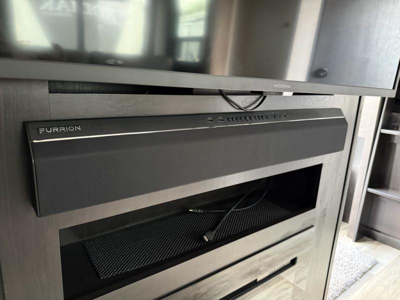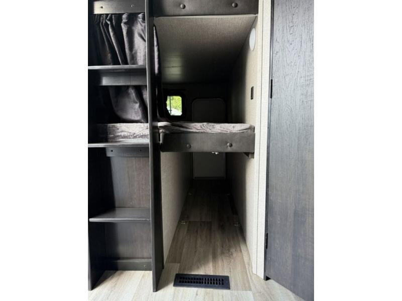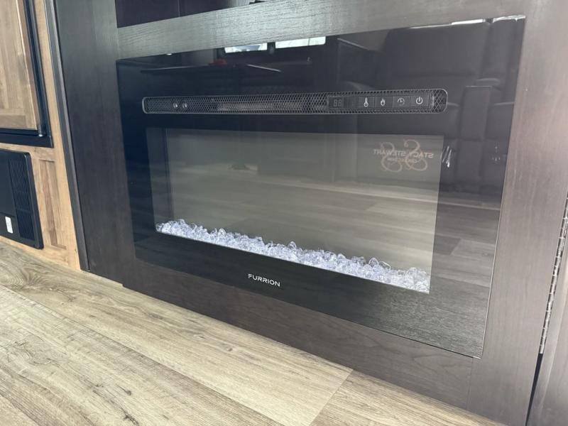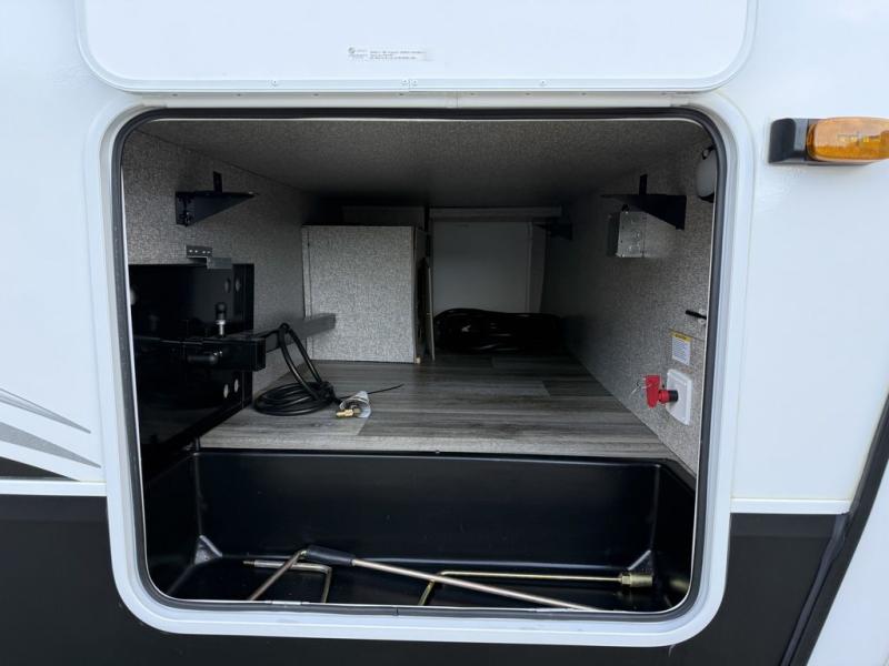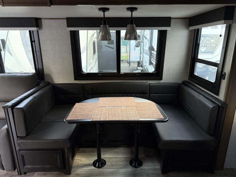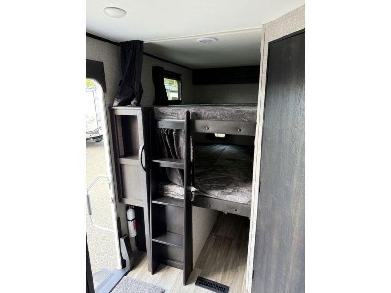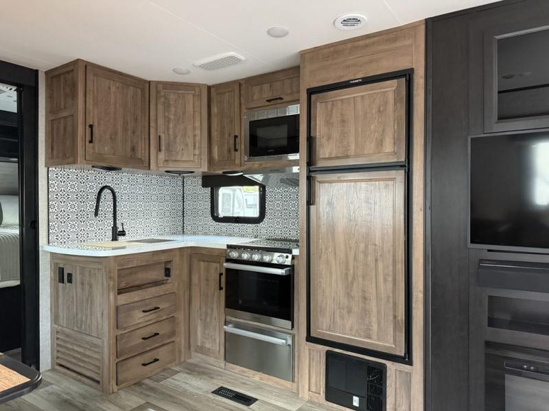 There's a lot to love about this travel trailer! From the set of 48" x 80" bunk beds with storage in the steps to the walk-in pantry behind the swing-out entertainment center with a fireplace for a cozy evening indoors. Everyone can freshen up in the rear corner bathroom with the shower, keep their towel close by with the linen closet, and have plenty of countertop space to get ready in the mornings. The tri-fold sofa and U-shaped dinette slide offer comfortable places to sit, dine, and play games, as well as transform into extra sleeping spaces. The front private bedroom has a queen bed with wardrobes on either side and another wardrobe to keep your clothes looking their best. You even have an outside kitchen to cook your meals at while watching others play a game of cornhole!