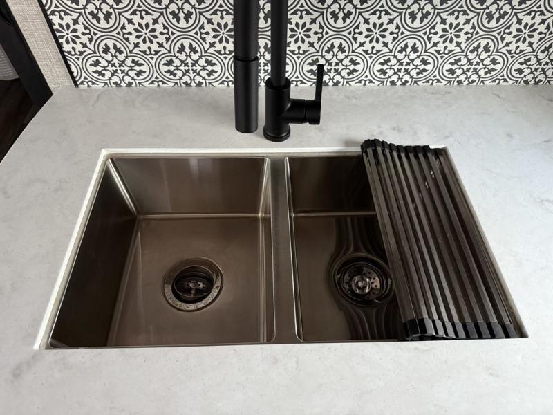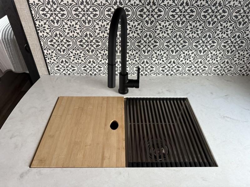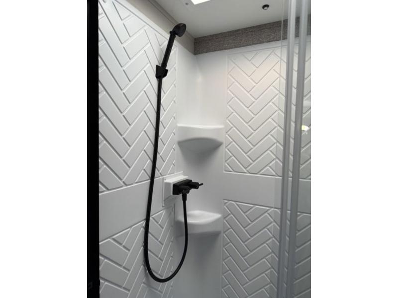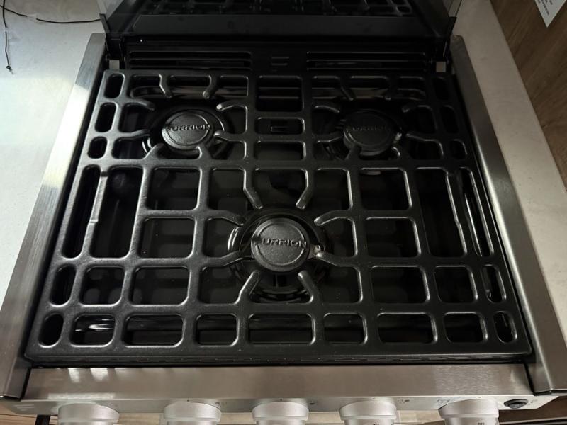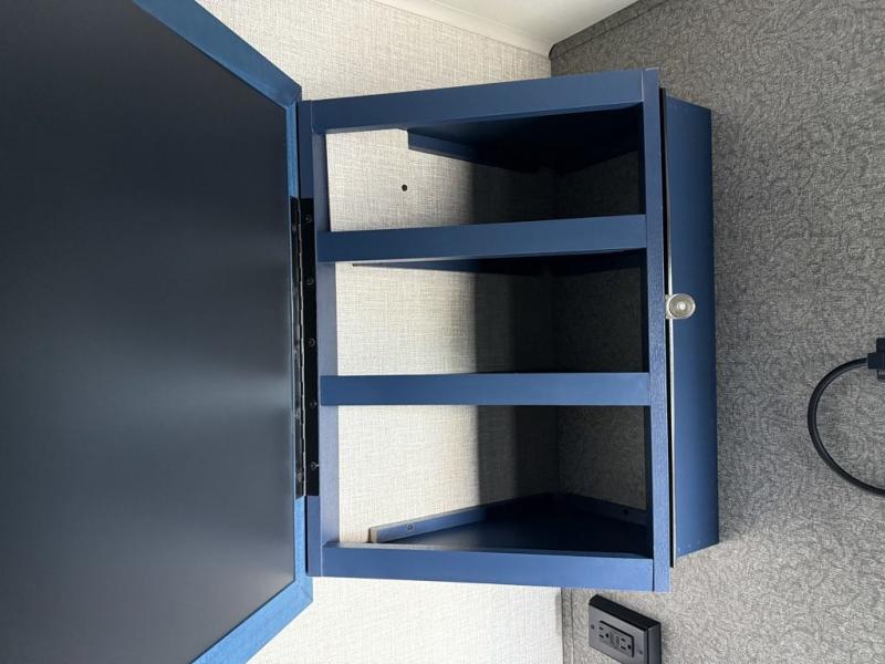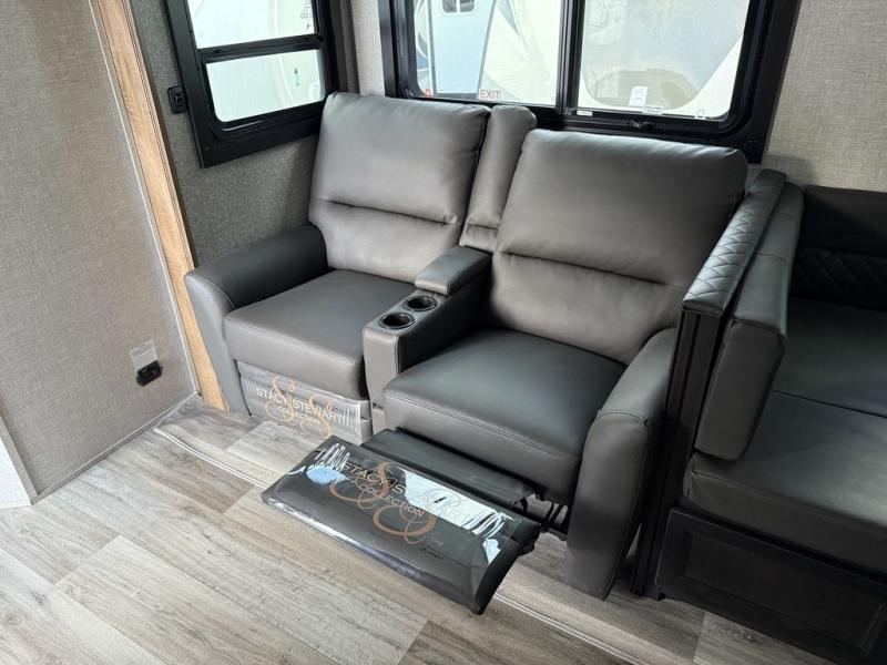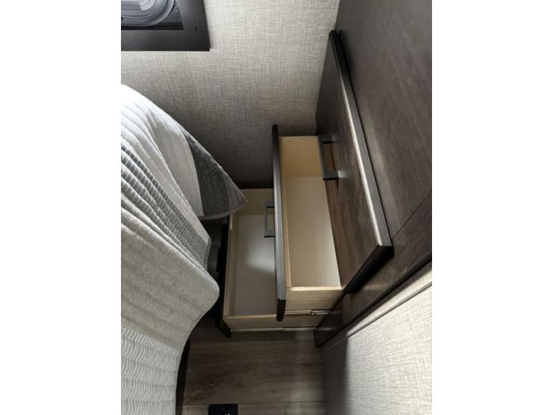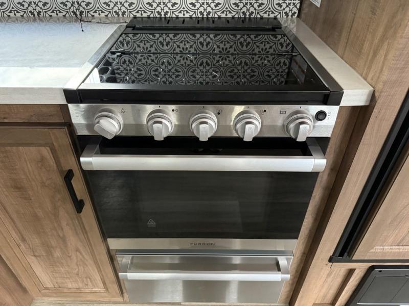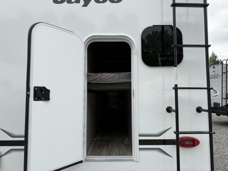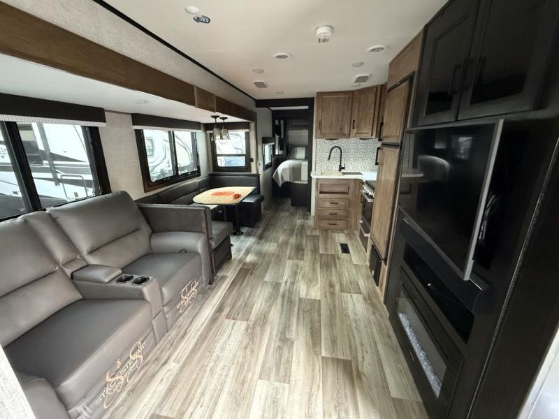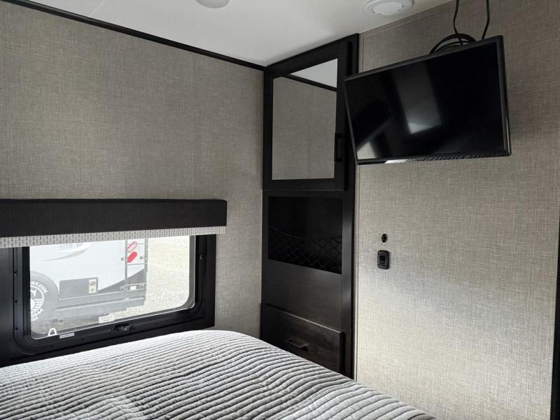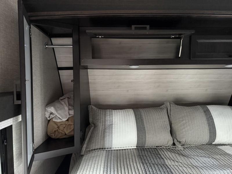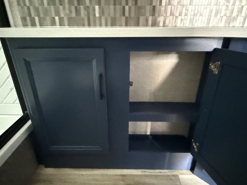 There's a lot to love about this travel trailer! From the set of 48" x 80" bunk beds with storage in the steps to the walk-in pantry behind the swing-out entertainment center with a fireplace for a cozy evening indoors. Everyone can freshen up in the rear corner bathroom with the shower, keep their towel close by with the linen closet, and have plenty of countertop space to get ready in the mornings. The tri-fold sofa and U-shaped dinette slide offer comfortable places to sit, dine, and play games, as well as transform into extra sleeping spaces. The front private bedroom has a queen bed with wardrobes on either side and another wardrobe to keep your clothes looking their best. You even have an outside kitchen to cook your meals at while watching others play a game of cornhole!