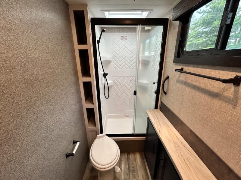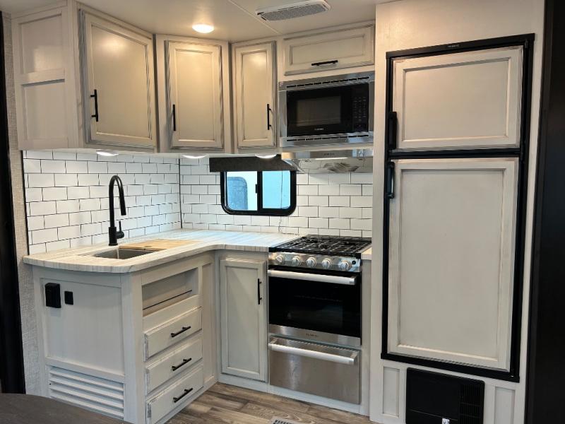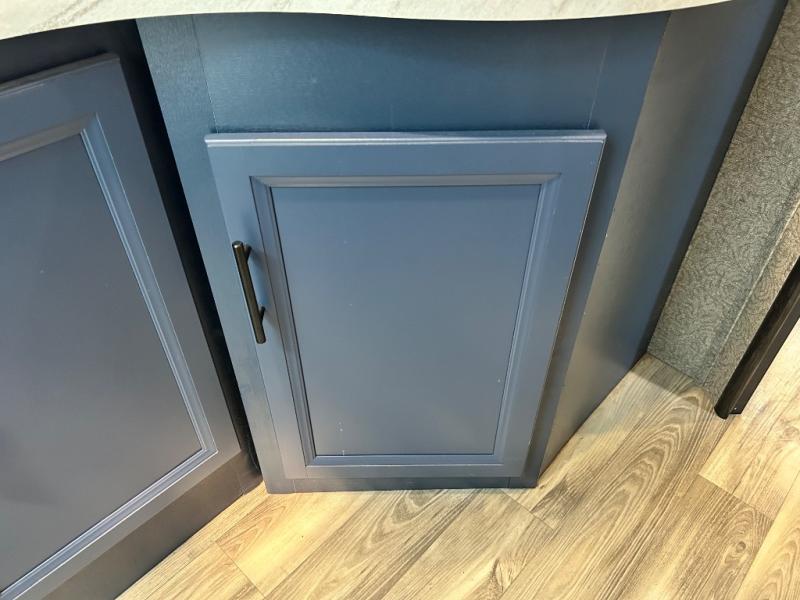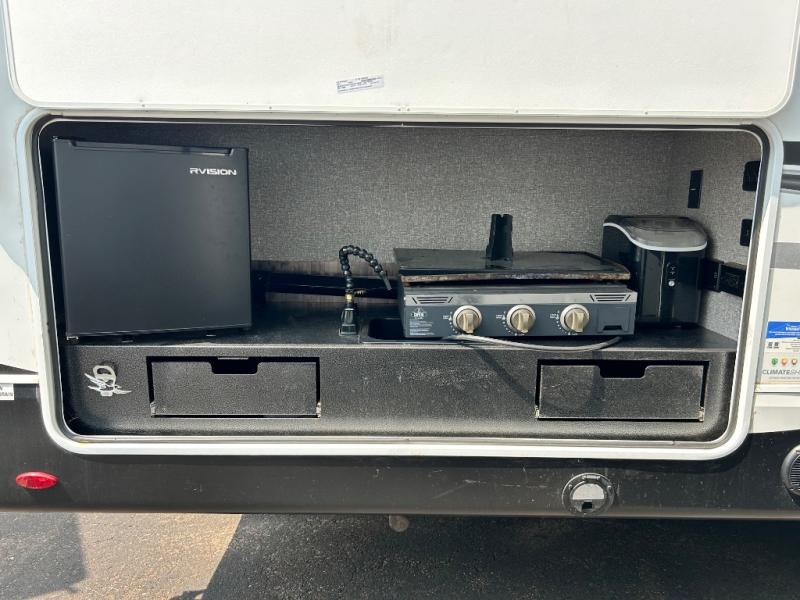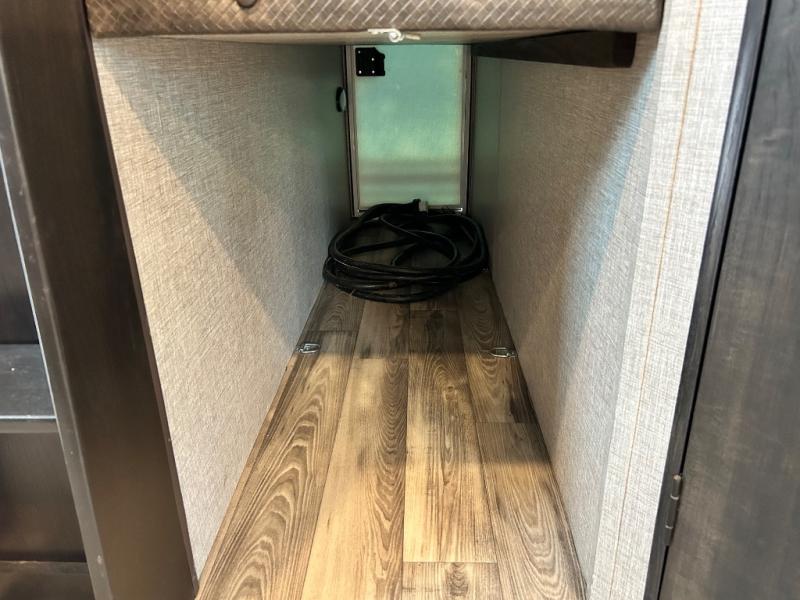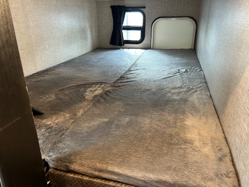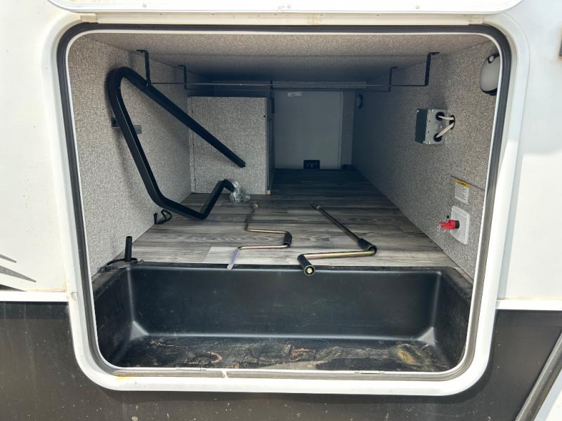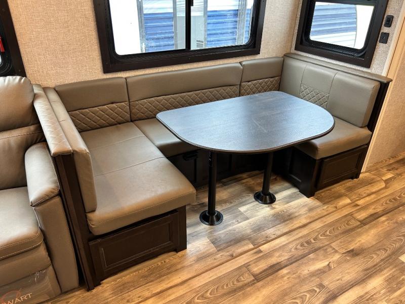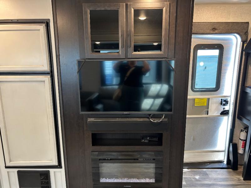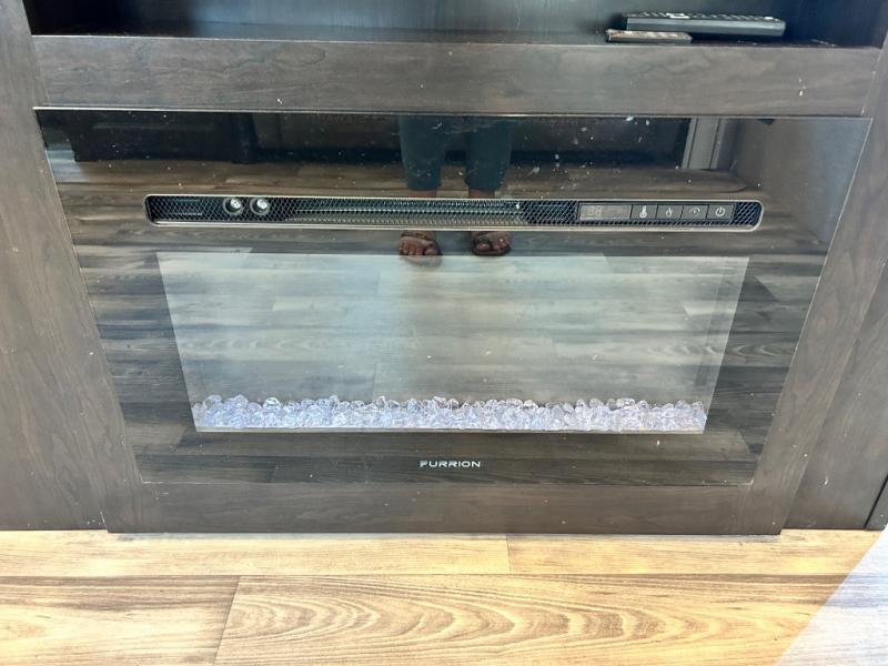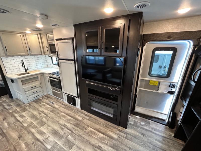 There's a lot to love about this travel trailer! From the set of 48" x 80" bunk beds with storage in the steps to the walk-in pantry behind the swing-out entertainment center with a fireplace for a cozy evening indoors. Everyone can freshen up in the rear corner bathroom with the shower, keep their towel close by with the linen closet, and have plenty of countertop space to get ready in the mornings. The tri-fold sofa and U-shaped dinette slide offer comfortable places to sit, dine, and play games, as well as transform into extra sleeping spaces. The front private bedroom has a queen bed with wardrobes on either side and another wardrobe to keep your clothes looking their best. You even have an outside kitchen to cook your meals at while watching others play a game of cornhole!