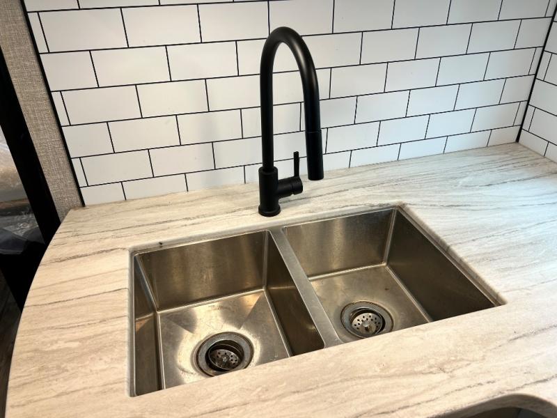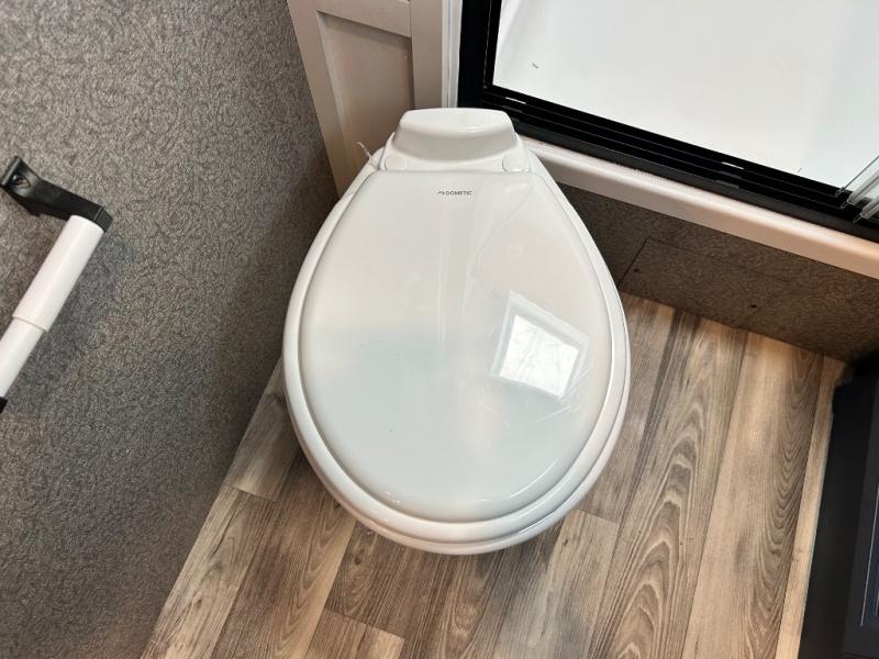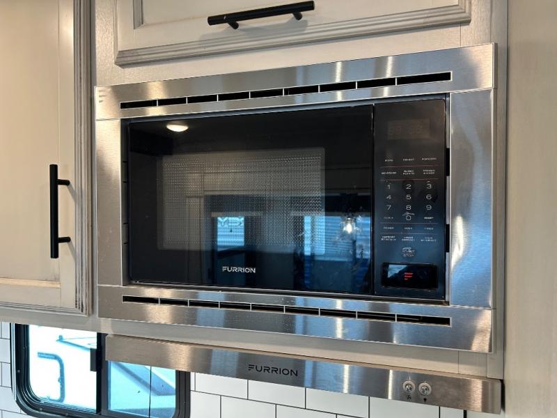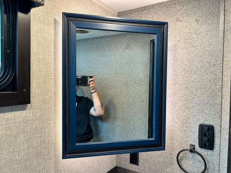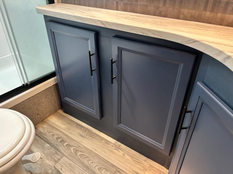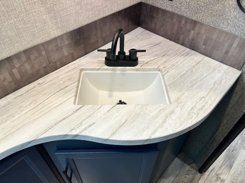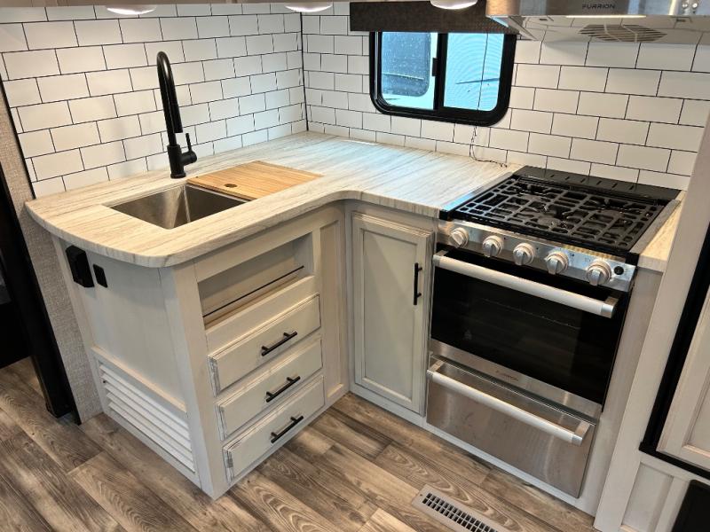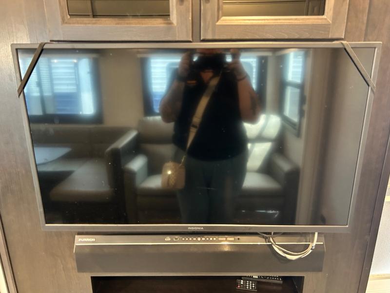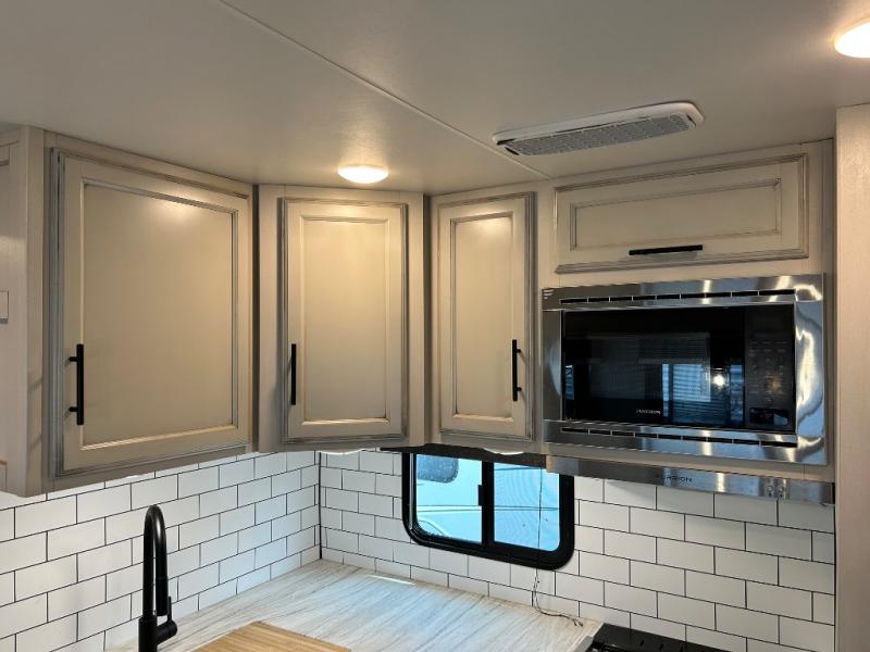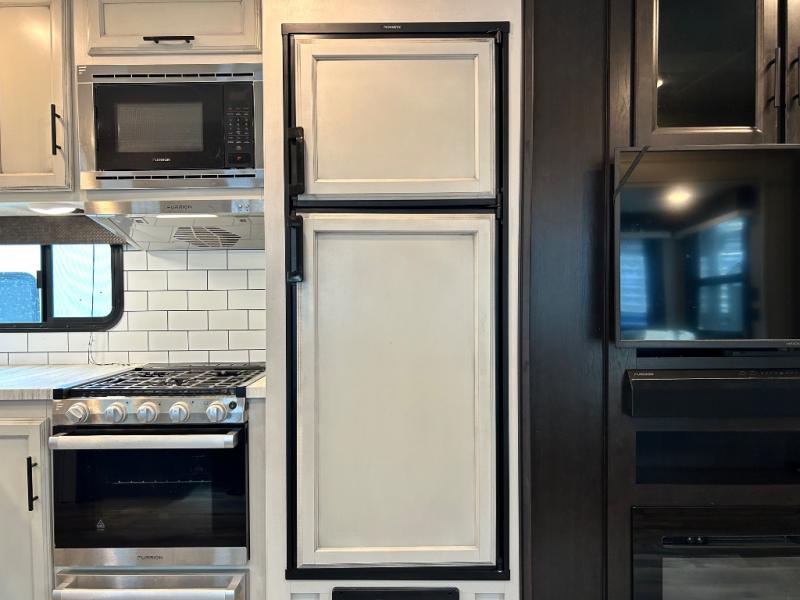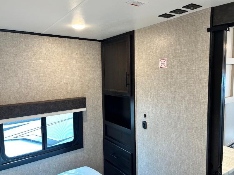 There's a lot to love about this travel trailer! From the set of 48" x 80" bunk beds with storage in the steps to the walk-in pantry behind the swing-out entertainment center with a fireplace for a cozy evening indoors. Everyone can freshen up in the rear corner bathroom with the shower, keep their towel close by with the linen closet, and have plenty of countertop space to get ready in the mornings. The tri-fold sofa and U-shaped dinette slide offer comfortable places to sit, dine, and play games, as well as transform into extra sleeping spaces. The front private bedroom has a queen bed with wardrobes on either side and another wardrobe to keep your clothes looking their best. You even have an outside kitchen to cook your meals at while watching others play a game of cornhole!