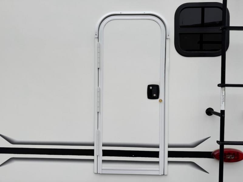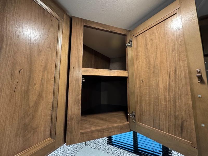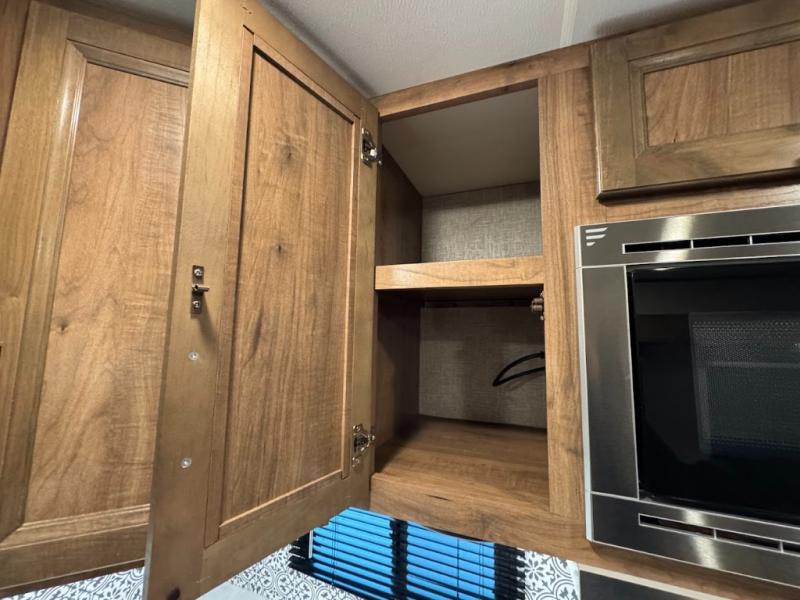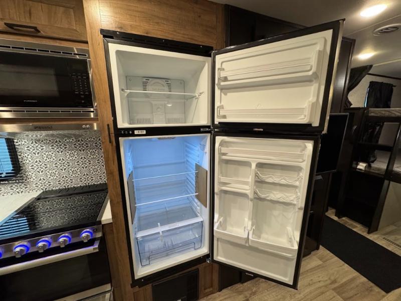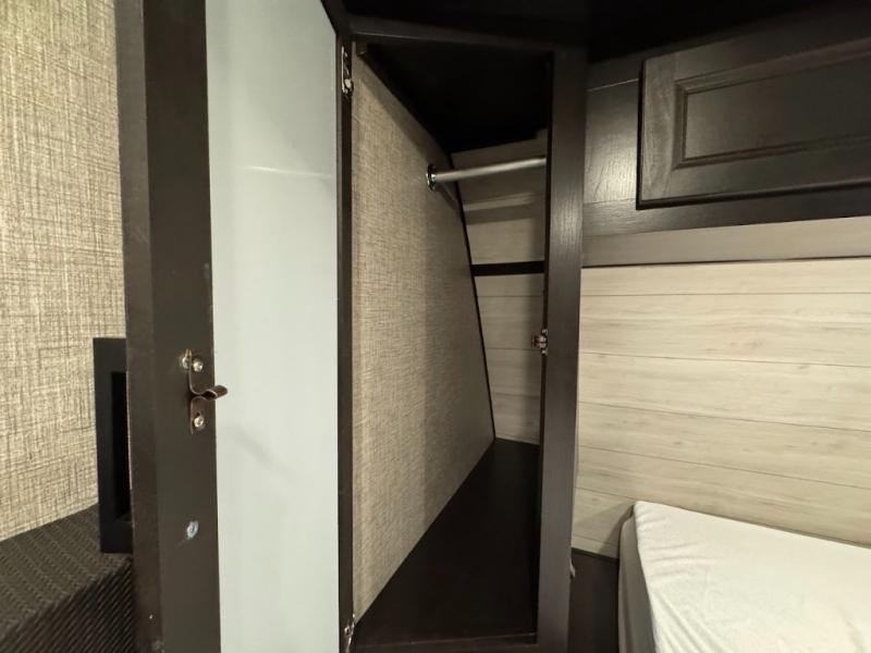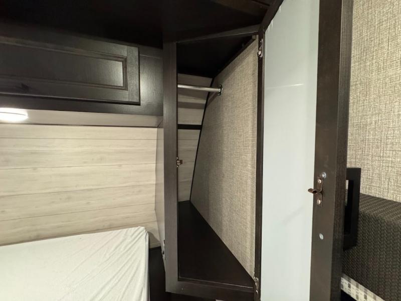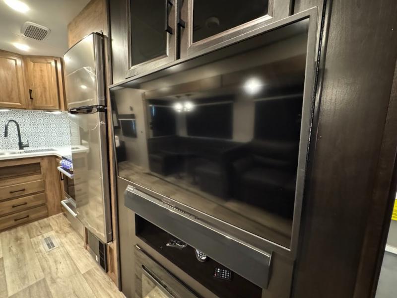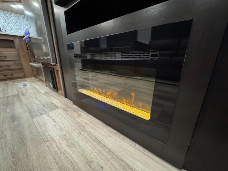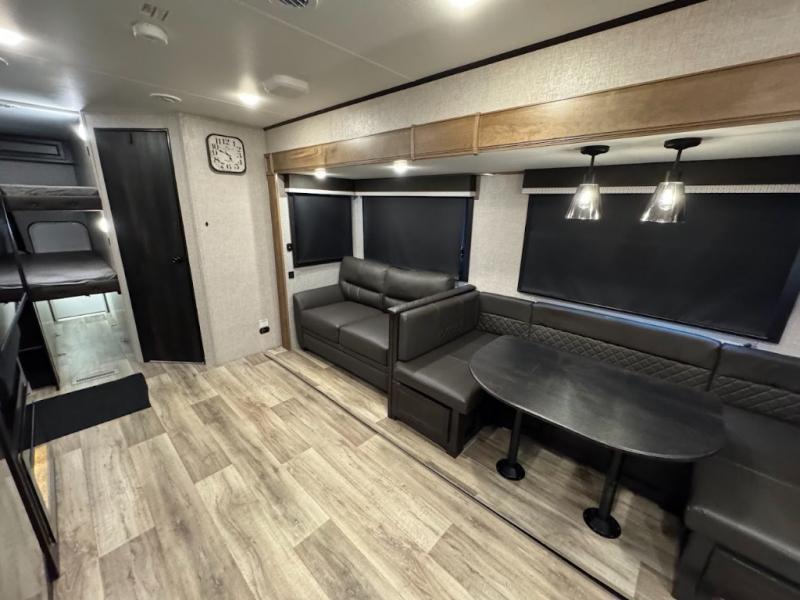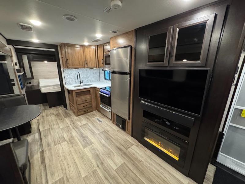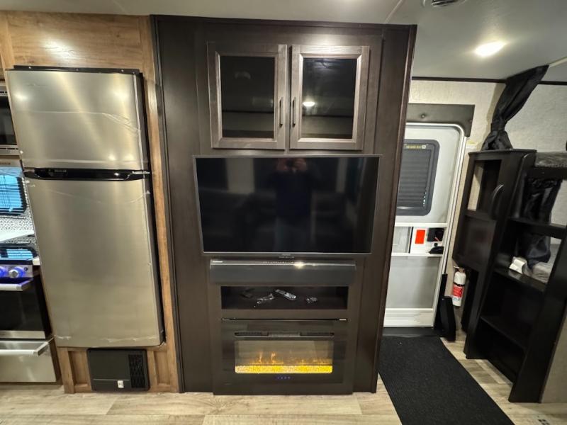 There's a lot to love about this travel trailer! From the set of 48" x 80" bunk beds with storage in the steps to the walk-in pantry behind the swing-out entertainment center with a fireplace for a cozy evening indoors. Everyone can freshen up in the rear corner bathroom with the shower, keep their towel close by with the linen closet, and have plenty of countertop space to get ready in the mornings. The tri-fold sofa and U-shaped dinette slide offer comfortable places to sit, dine, and play games, as well as transform into extra sleeping spaces. The front private bedroom has a queen bed with wardrobes on either side and another wardrobe to keep your clothes looking their best. You even have an outside kitchen to cook your meals at while watching others play a game of cornhole!