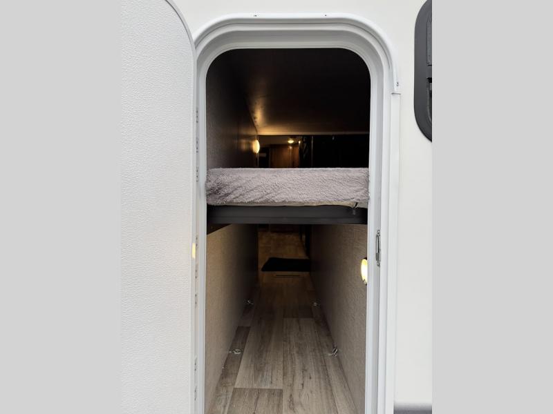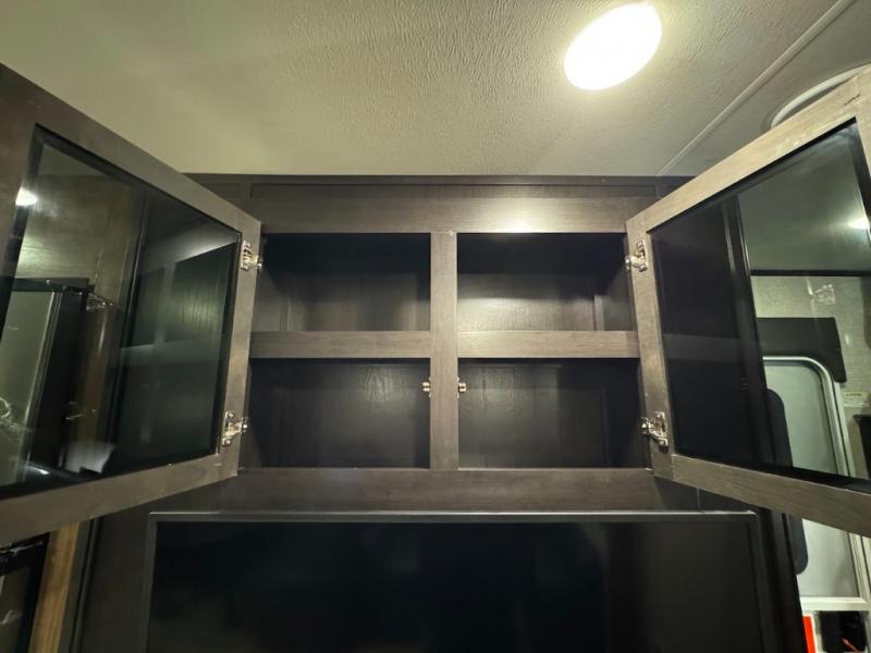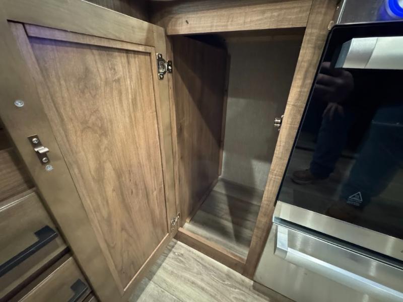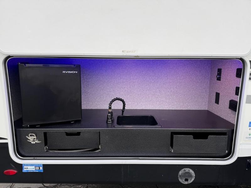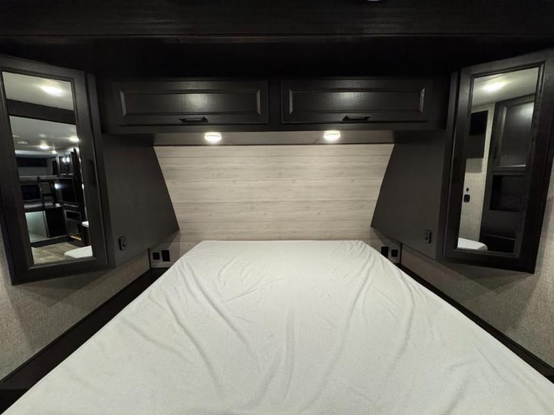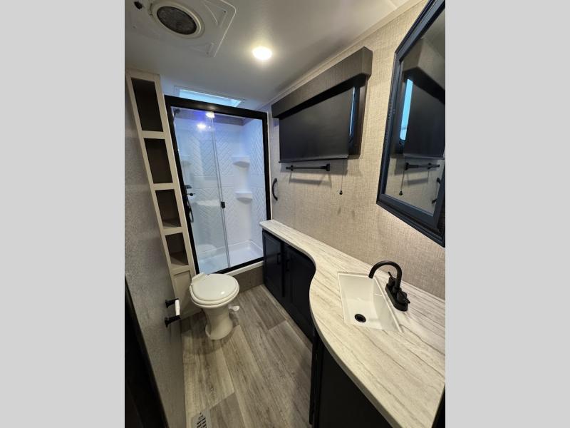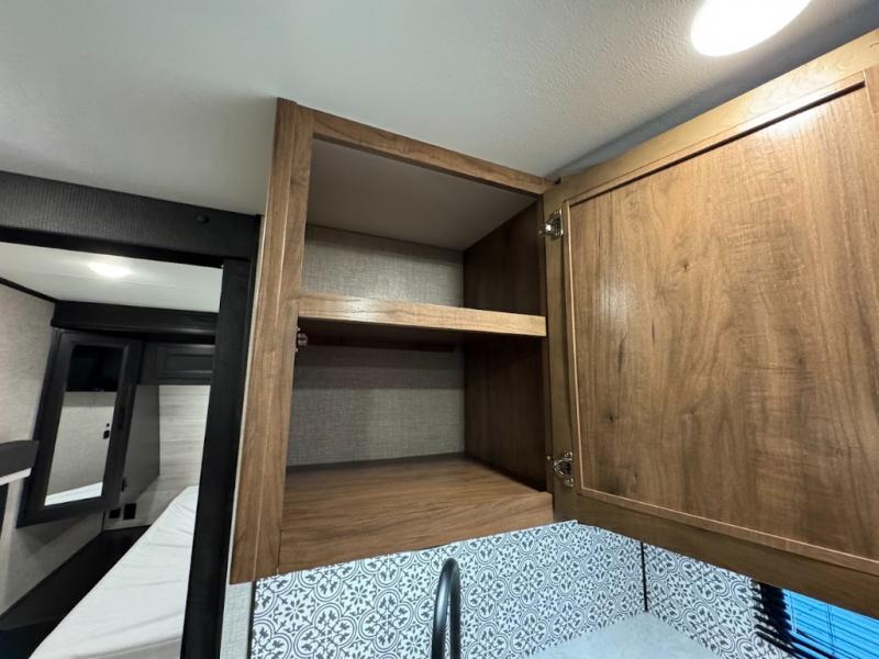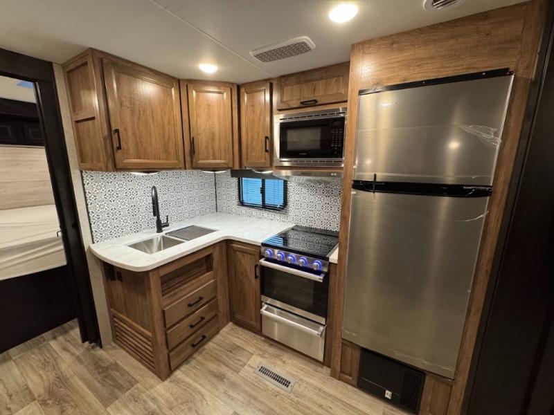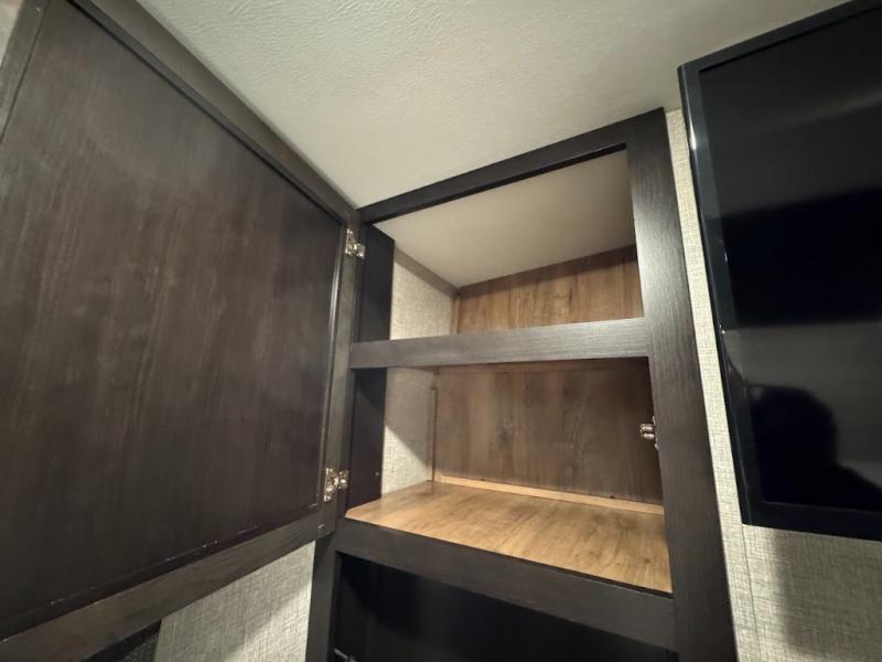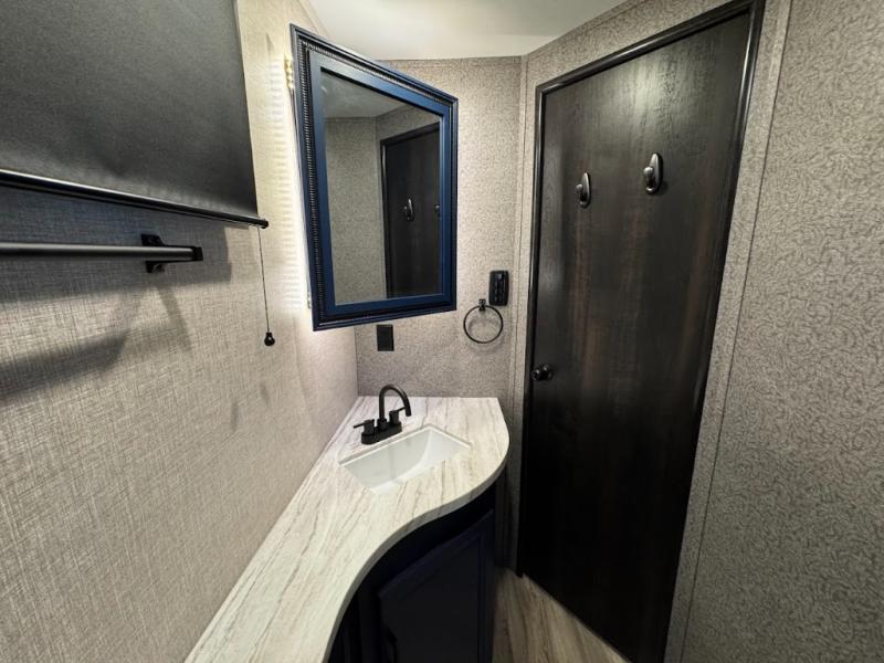 There's a lot to love about this travel trailer! From the set of 48" x 80" bunk beds with storage in the steps to the walk-in pantry behind the swing-out entertainment center with a fireplace for a cozy evening indoors. Everyone can freshen up in the rear corner bathroom with the shower, keep their towel close by with the linen closet, and have plenty of countertop space to get ready in the mornings. The tri-fold sofa and U-shaped dinette slide offer comfortable places to sit, dine, and play games, as well as transform into extra sleeping spaces. The front private bedroom has a queen bed with wardrobes on either side and another wardrobe to keep your clothes looking their best. You even have an outside kitchen to cook your meals at while watching others play a game of cornhole!