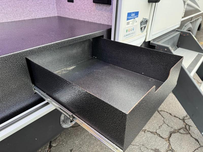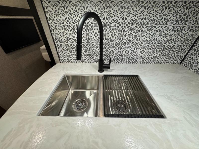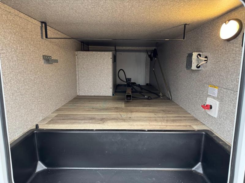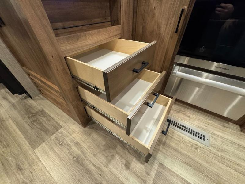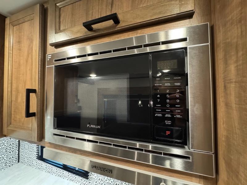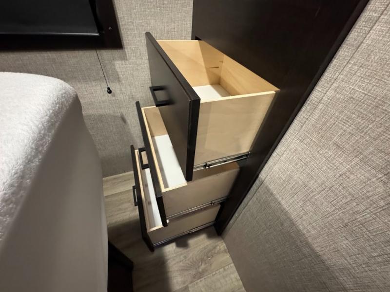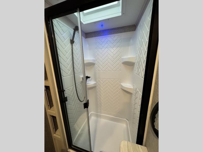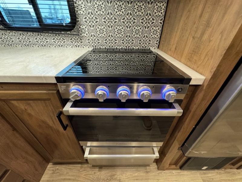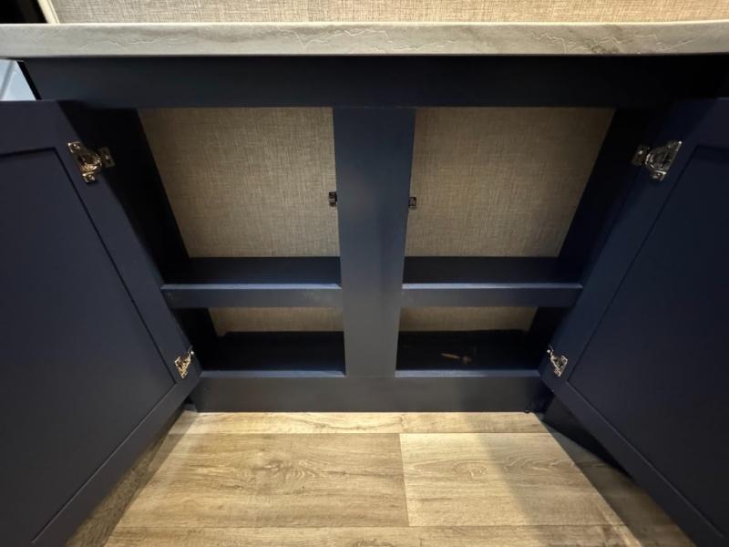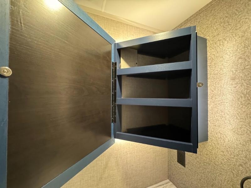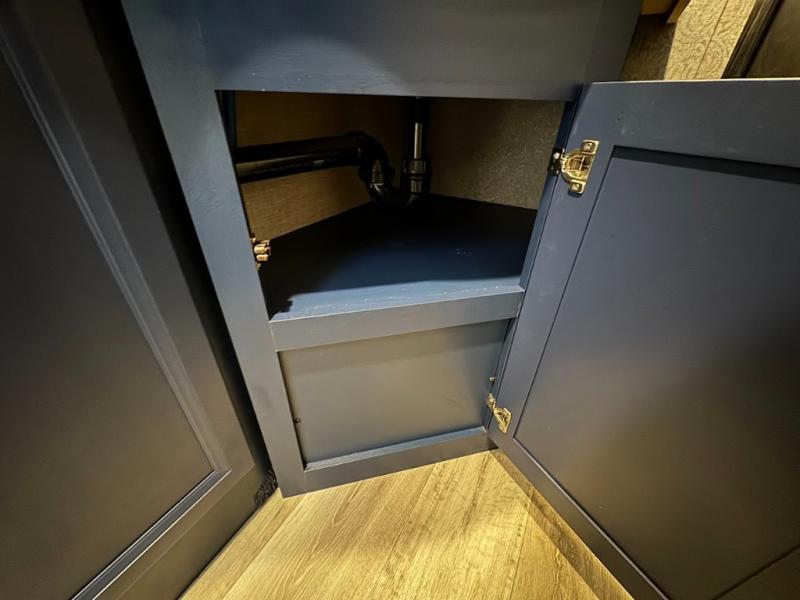There's a lot to love about this travel trailer! From the set of 48" x 80" bunk beds with storage in the steps to the walk-in pantry behind the swing-out entertainment center with a fireplace for a cozy evening indoors. Everyone can freshen up in the rear corner bathroom with the shower, keep their towel close by with the linen closet, and have plenty of countertop space to get ready in the mornings. The tri-fold sofa and U-shaped dinette slide offer comfortable places to sit, dine, and play games, as well as transform into extra sleeping spaces. The front private bedroom has a queen bed with wardrobes on either side and another wardrobe to keep your clothes looking their best. You even have an outside kitchen to cook your meals at while watching others play a game of cornhole!