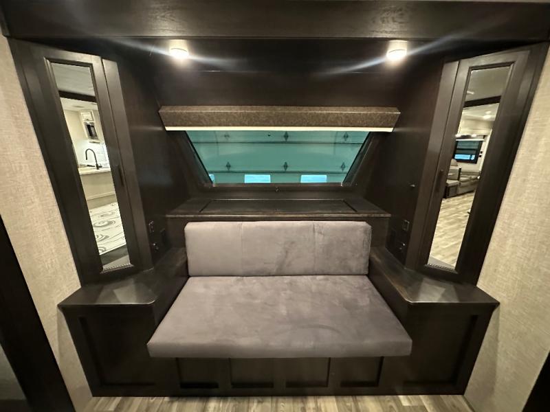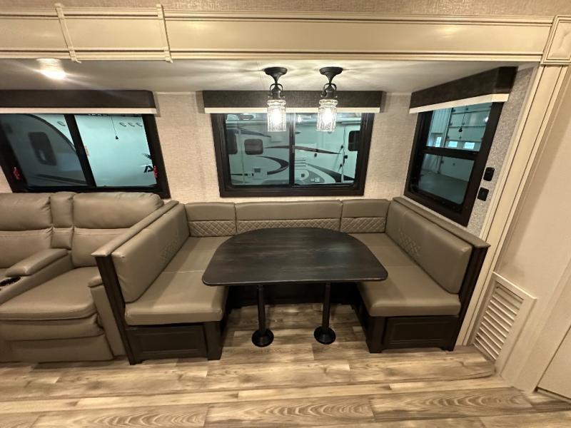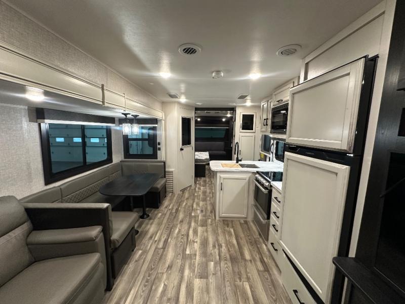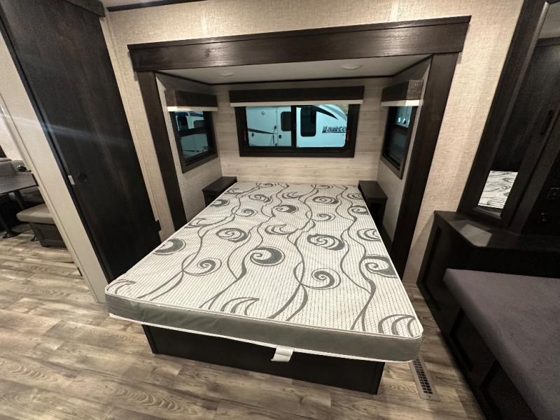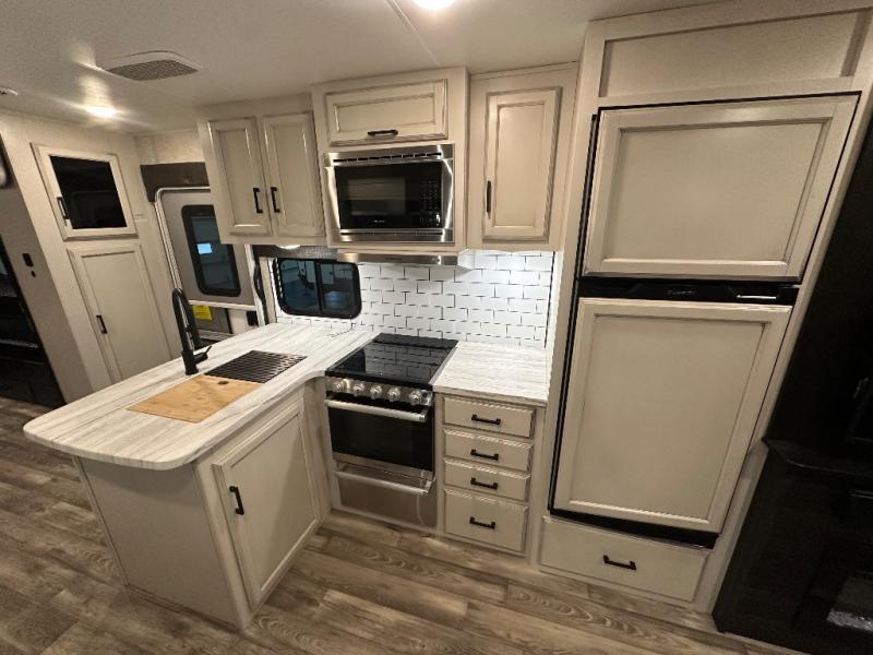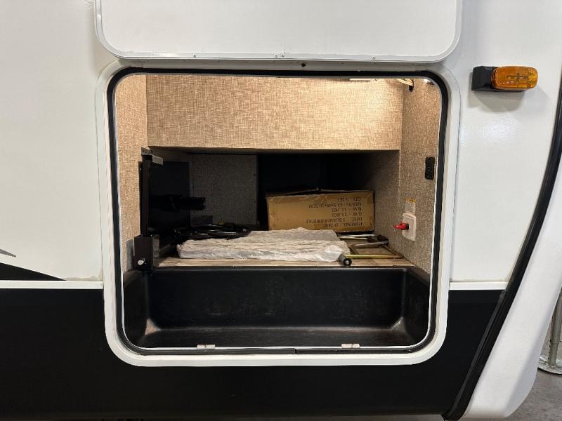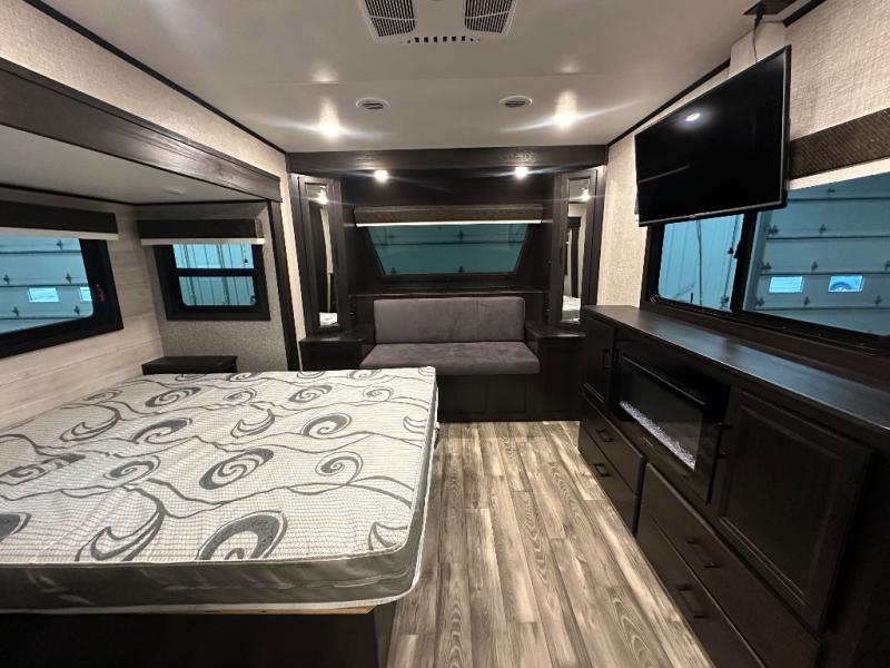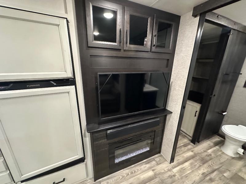 Head to your favorite campsite and camp as long as you want with this travel trailer! The full rear bathroom has a radius shower to freshen up in each morning and a wardrobe that is prepped to add an optional washer and dryer so you can have clean clothes for an extended trip. The tri-fold sofa offers a comfortable place to watch your favorite movie and enjoy the fireplace at the entertainment center. After the chef has prepared their best meal either indoors with the three burner stainless steel range or at the outside kitchen, you can enjoy it at the U-shaped dinette then play a card game. The large corner pantry is big enough to store everyone's favorite snacks and the entry wardrobe helps to keep your coats out of the way. The front private bedroom has a queen bed slide for more walking around space and a dresser with TV prep and the ability to add an optional fireplace, as well as a bench to read a book with wardrobes on either sides for your clothes!