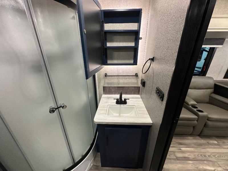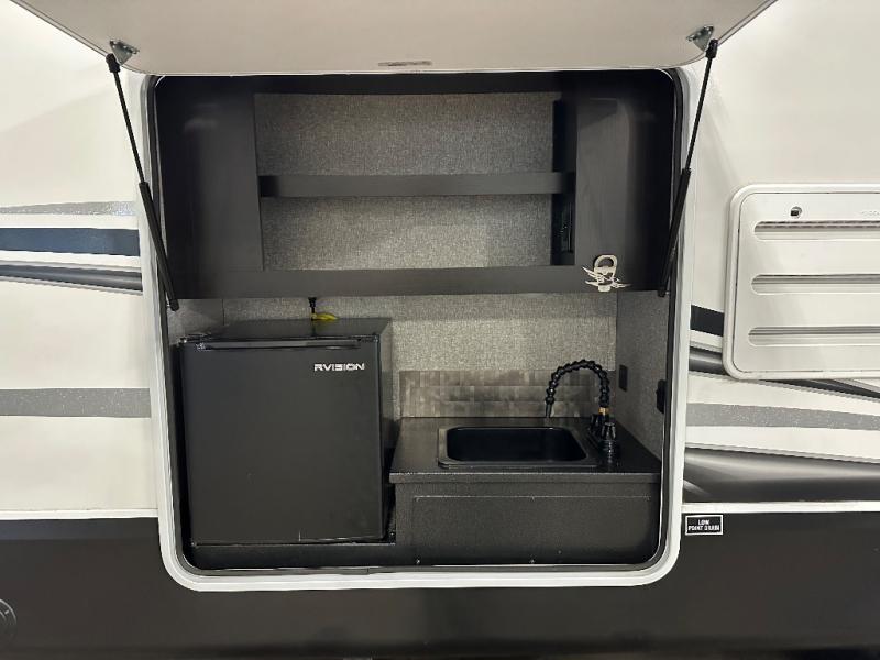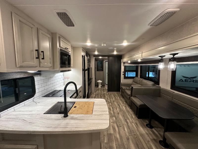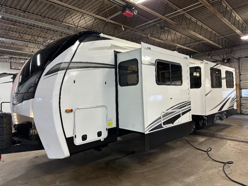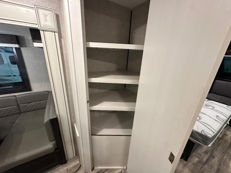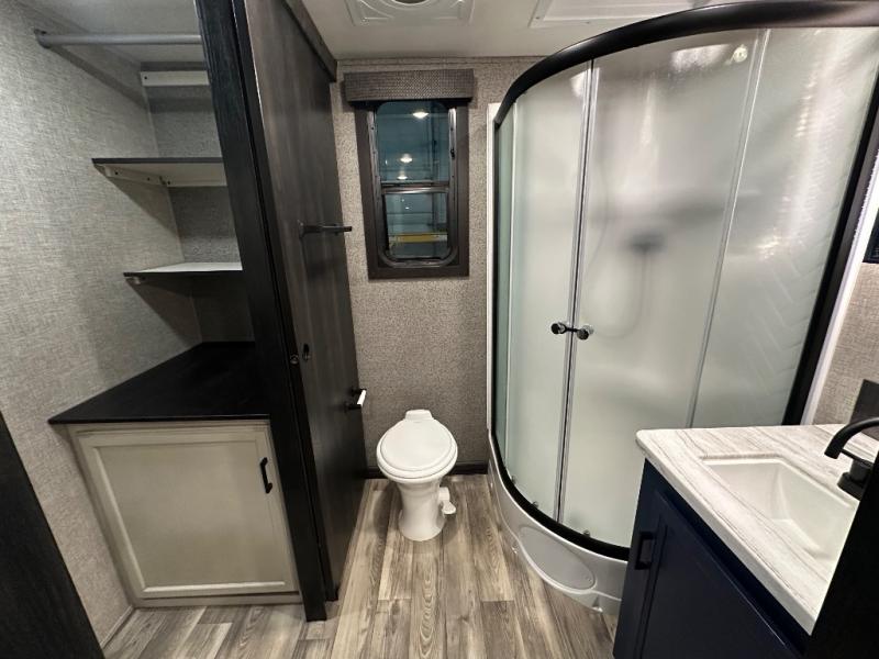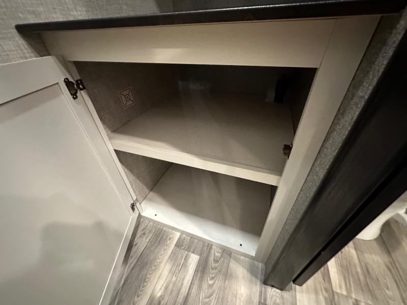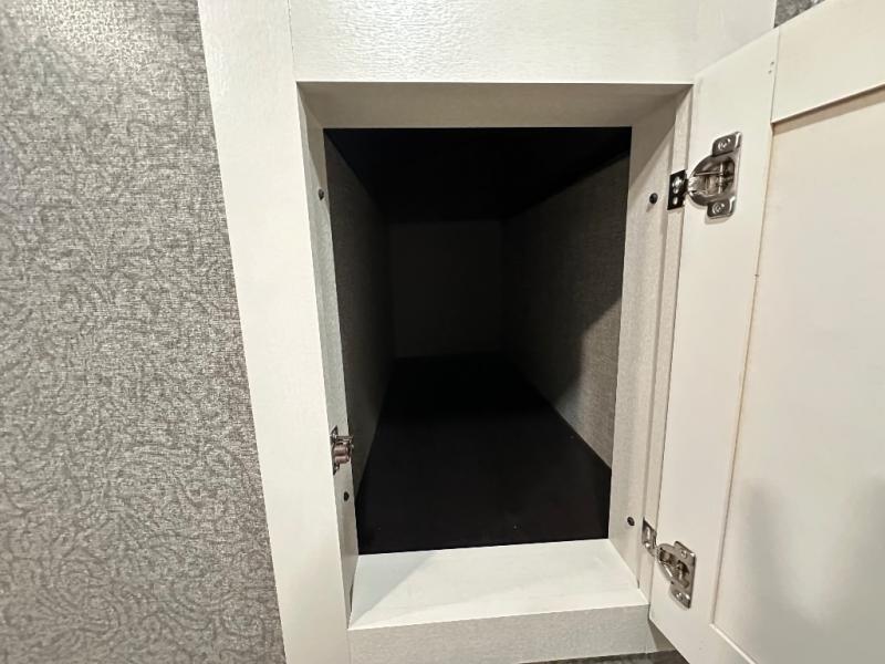 Head to your favorite campsite and camp as long as you want with this travel trailer! The full rear bathroom has a radius shower to freshen up in each morning and a wardrobe that is prepped to add an optional washer and dryer so you can have clean clothes for an extended trip. The tri-fold sofa offers a comfortable place to watch your favorite movie and enjoy the fireplace at the entertainment center. After the chef has prepared their best meal either indoors with the three burner stainless steel range or at the outside kitchen, you can enjoy it at the U-shaped dinette then play a card game. The large corner pantry is big enough to store everyone's favorite snacks and the entry wardrobe helps to keep your coats out of the way. The front private bedroom has a queen bed slide for more walking around space and a dresser with TV prep and the ability to add an optional fireplace, as well as a bench to read a book with wardrobes on either sides for your clothes!