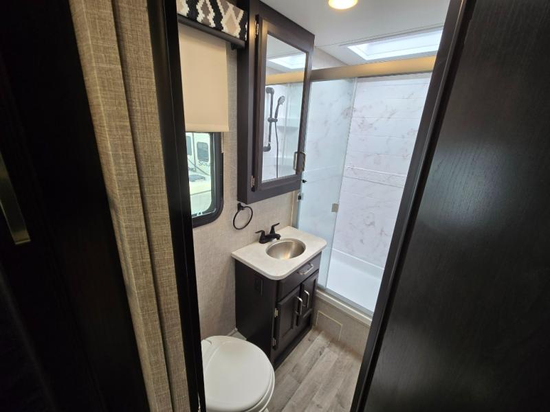 With any Greyhawk Class C gas motorhome by Jayco you will experience smooth sailing thanks to the JRIDE PLUS that comes with Koni shock absorbers, a computer-balanced driveshaft, Hellwig helper springs, and more. The Ford E-450 chassis with a 7.3L V8 350 HP engine will power your excursions, and you'll appreciate the added safety features for your peace of mind. Each model features a Sony infotainment center with Apple CarPlay and Android Auto, backup and side-view cameras, and a tire pressure monitor system the driver is sure to appreciate. Durable construction begins with Stronghold VBL roof, floor and sidewalls, bead-foam insulation, and a one-piece seamless fiberglass front cap. Head inside to find blackout night roller shades, LED-lit pressed countertops, an 84" interior ceiling height, and hardwood cabinet doors and drawers.