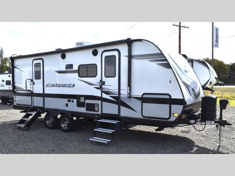 With any Jay Feather travel trailer by Jayco, you will experience an easy-to-tow, lightweight dual axle RV that is built on an American-made frame with an aerodynamic, rounded front profile with a diamond plate to protect against road debris, and includes Azdel composite in the perimeter walls, and Stronghold VBL vacuum-bonded, laminated floor and walls, plus the Magnum Truss roof system. Also included are features in the Customer Value package, and the Sport package which offers aluminum tread entry steps, roof-mount solar prep, an LED TV, and the Glacier package which includes an enclosed underbelly. The interior provides residential-style kitchen countertops with a decorative backsplash, residential plank-style vinyl flooring for easy care, a decorative wallboard for style, and ball-bearing drawer guides with 75 lb. capacity to mention a few of the amenities. Choose your favorite today!