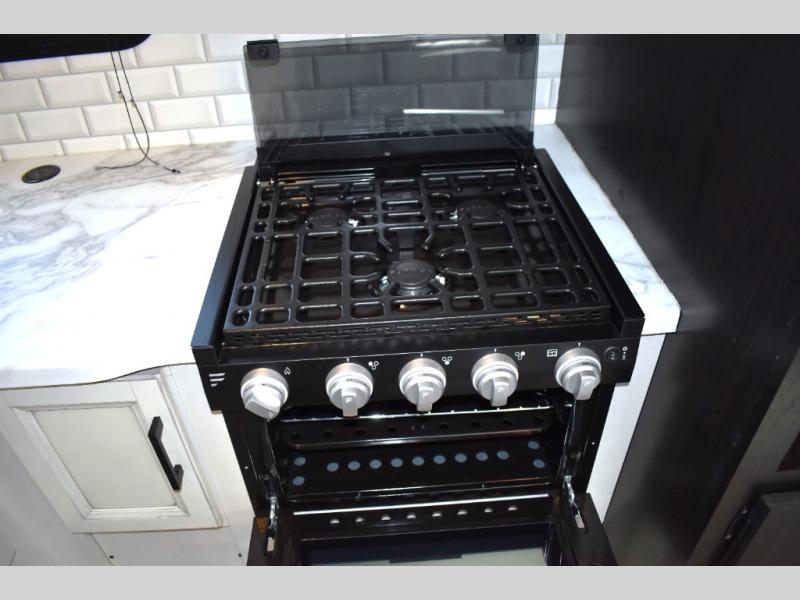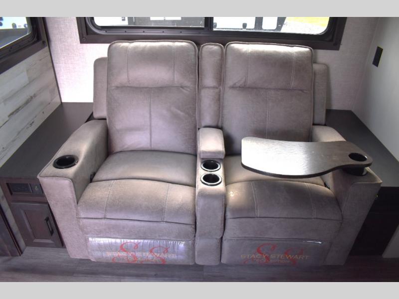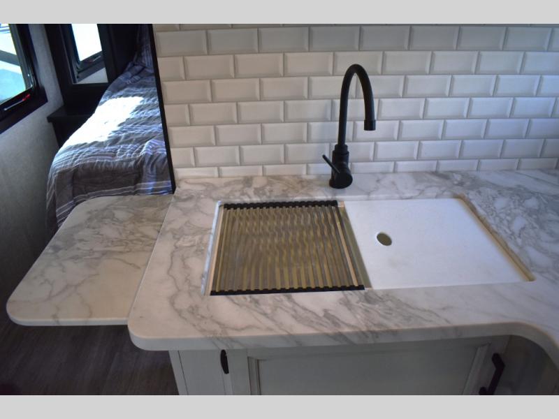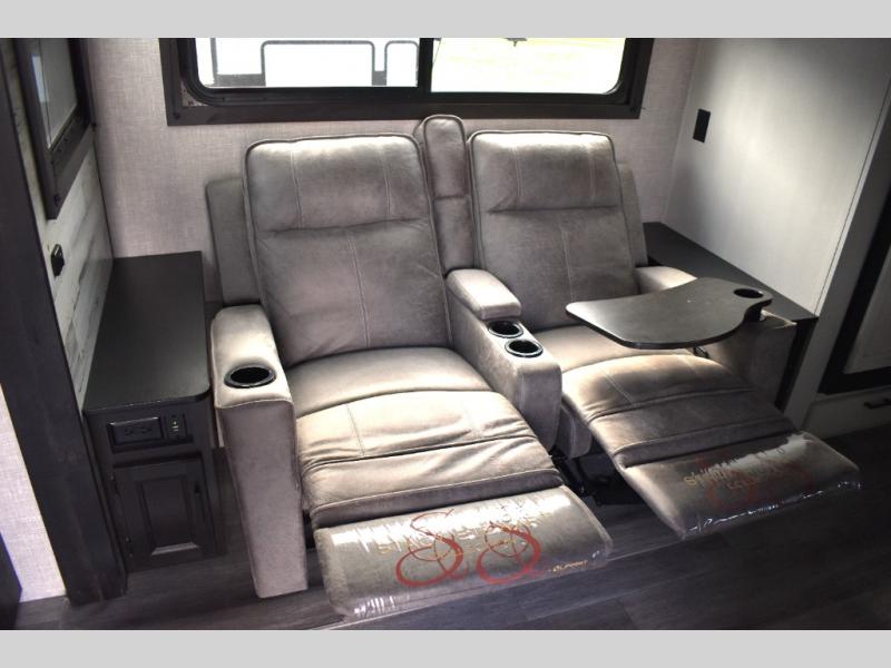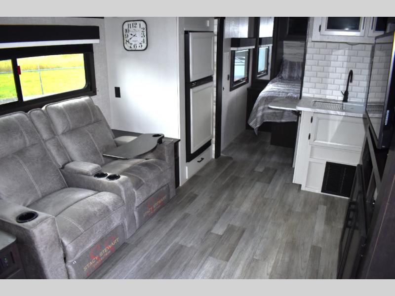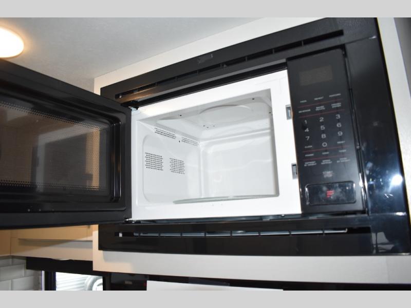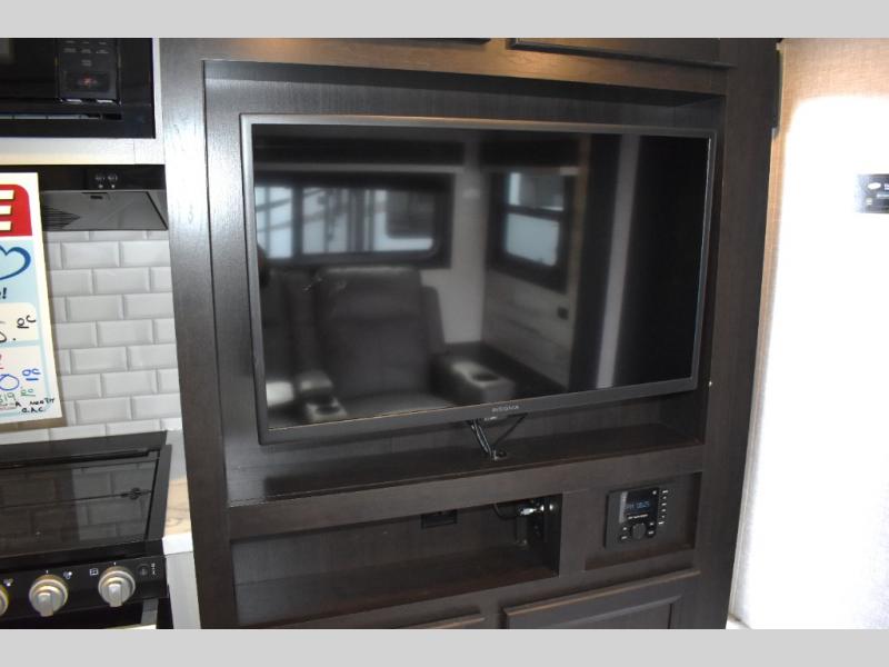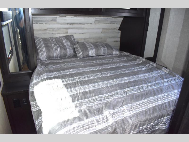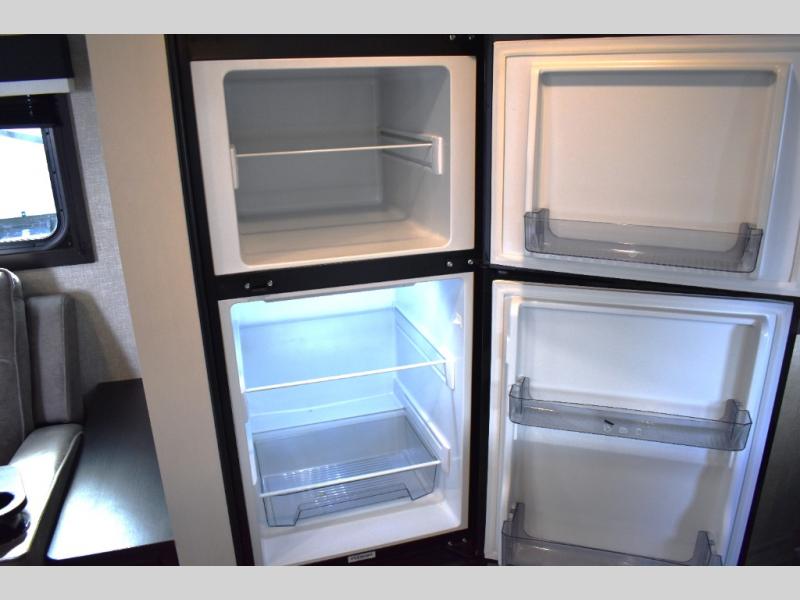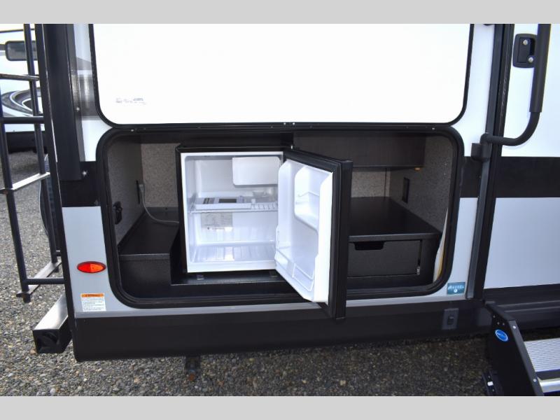 Whether you are a couple or a larger group, this trailer offers a spacious main living and kitchen area as well as rear bathroom for privacy. You will also find linen storage and ample counter space for toiletries. The space savings door even gives you more floor space in both the bathroom and the main area. The single slide holds the U-shaped dinette and refrigerator for even more floor space, the L-shaped kitchen area allows the cook their own space to make meals, and the walk-in pantry is perfect for extra goodies on those longer camping trips. The front bedroom provides privacy as well with its own space savings door, and you can sleep like a queen at night. You can choose a few options if you like such as an L-lounge or theater seats in place of the dinette, the Solar Power package, 120V heated tanks pads, and/or an 8 cu. ft. 12V refrigerator.