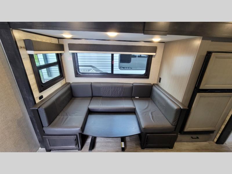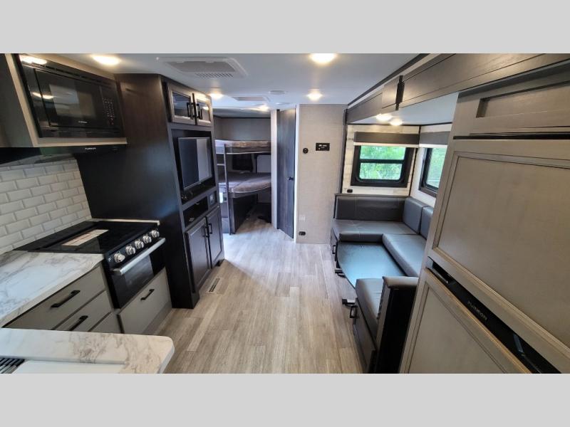There is so much to love about this trailer from the double-size bunks in the rear with a ladder for easy access, plus the cargo door that allows you to stow larger items from the exterior to the interior underneath the bunks. You also have exterior storage compartments for outdoor gear. And the cook can choose to make meals using the outside kitchen including a fridge to store some cold items or the inside kitchen with full amenities including a 6 cu. ft. refrigerator and a flip-up counter for more space to prepare meals and dry the dishes. The walk-in pantry is a nice feature as well especially when you have a big crew. There is a private bedroom up front with the second exterior entry and a queen bed, plus the main area offers a U-shaped dinette and LED TV to watch. And you might like to add a few options such as an L-lounge or theater seats in place of the dinette, 12V heated tank pads if you plan to camp often in the cold weather, and/or the Solar Power package if you like staying off-grid.