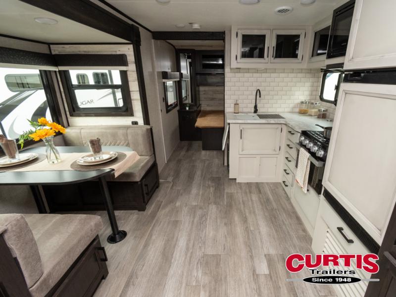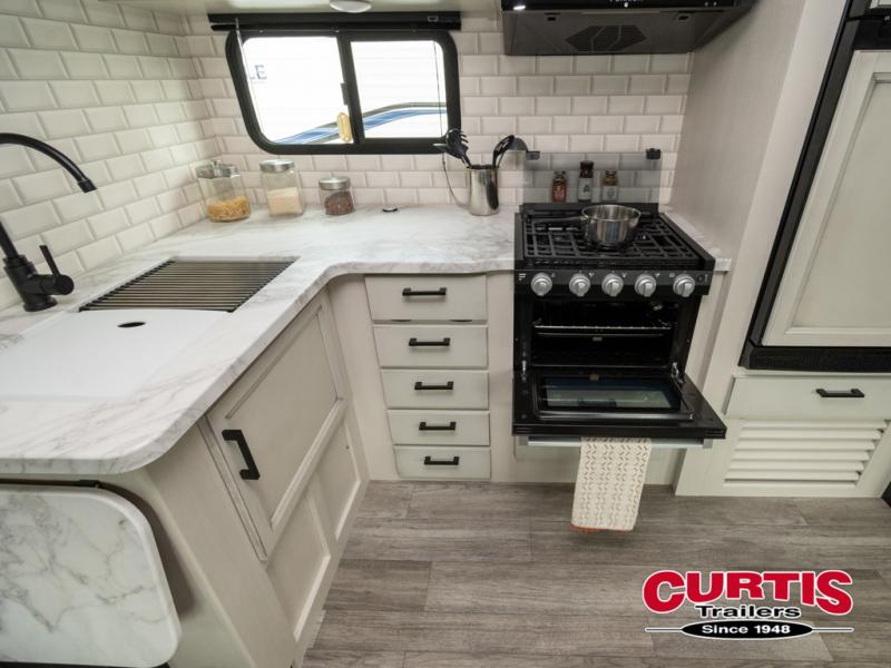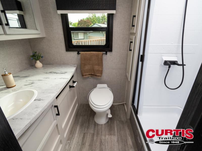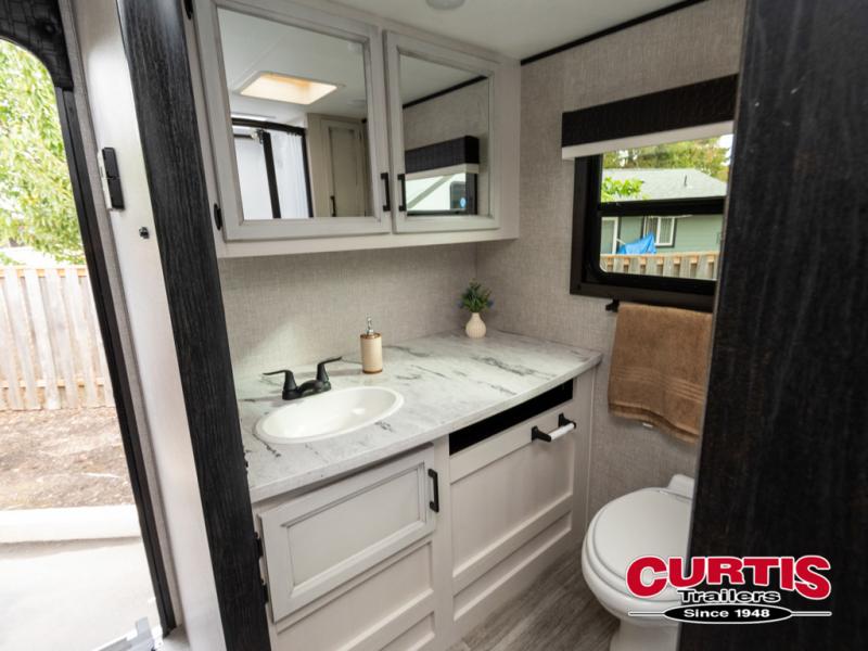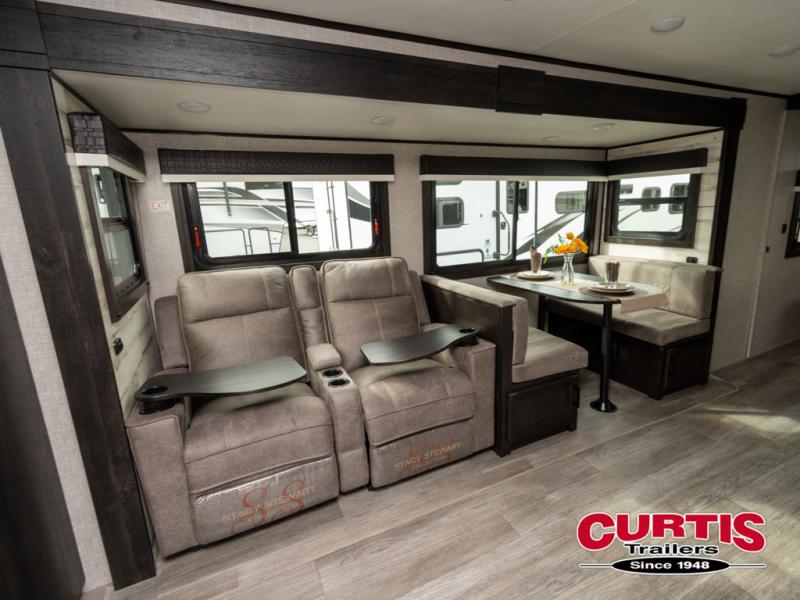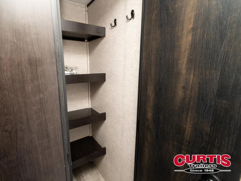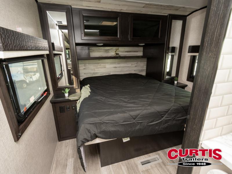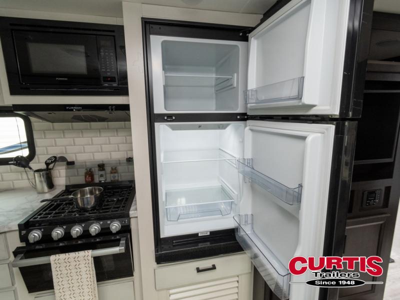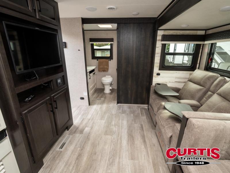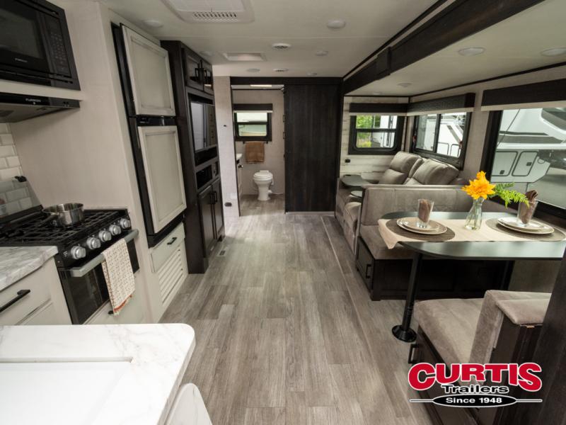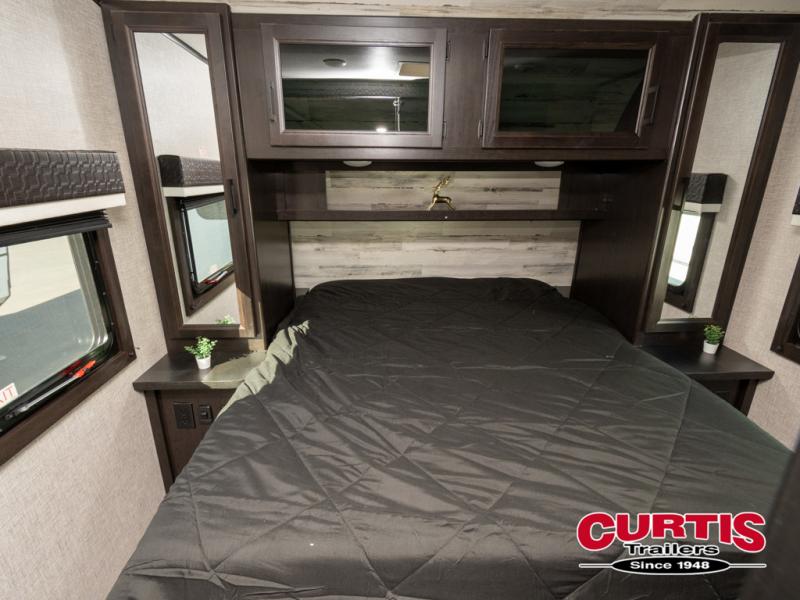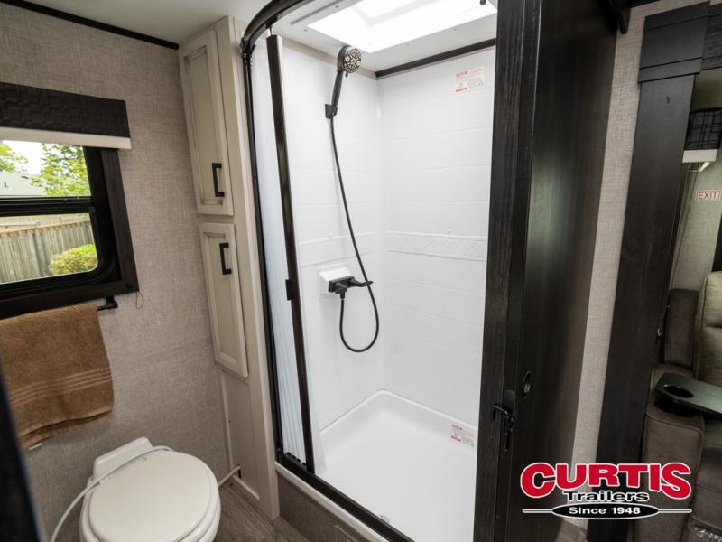 Looking for convenience and privacy in your next RV? Well this full rear bathroom has lots of room for you to move around as you get ready each morning in privacy! The front private bedroom has a walk-around 60" x 75" queen bed with wardrobes on either side to keep your clothes looking their best. You can enjoy home cooked meals while at the campsite thanks to the three burner cooktop and 6 cu. ft. refrigerator, plus there is a walk-in pantry to store all of your favorite snacks. The jackknife sofa and booth dinette within the slide out offer comfortable places to relax, yet you can switch the jackknife sofa out for the optional tri-fold sofa or the optional theater seating. You can even cook breakfast outdoors using the outside kitchen and stay protected from the elements by the 19' power awning!