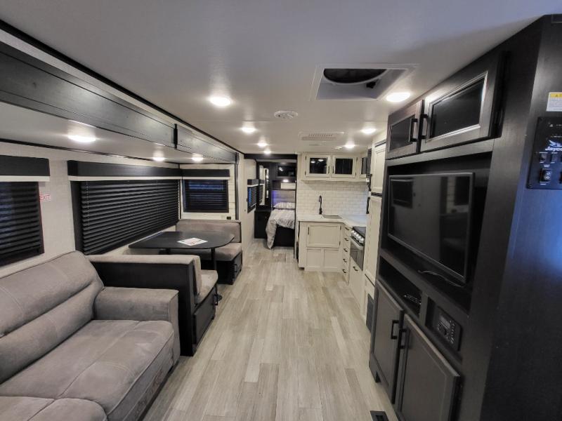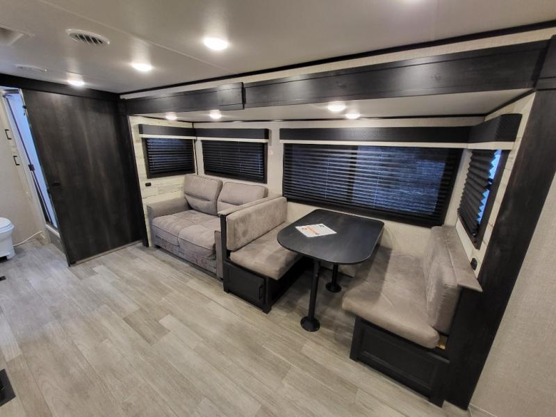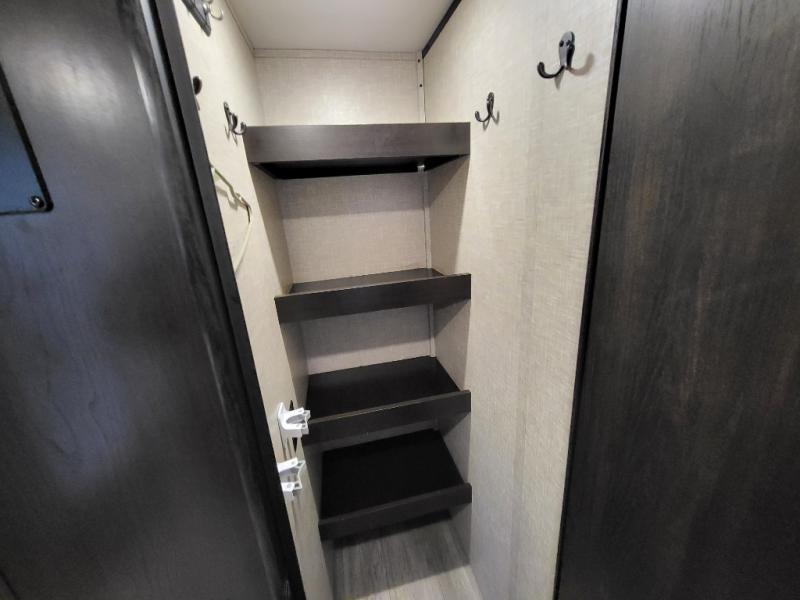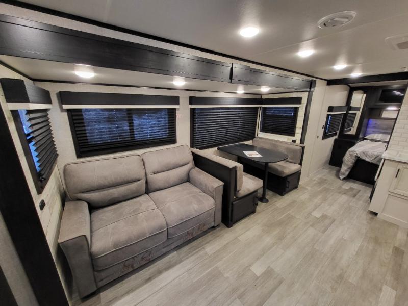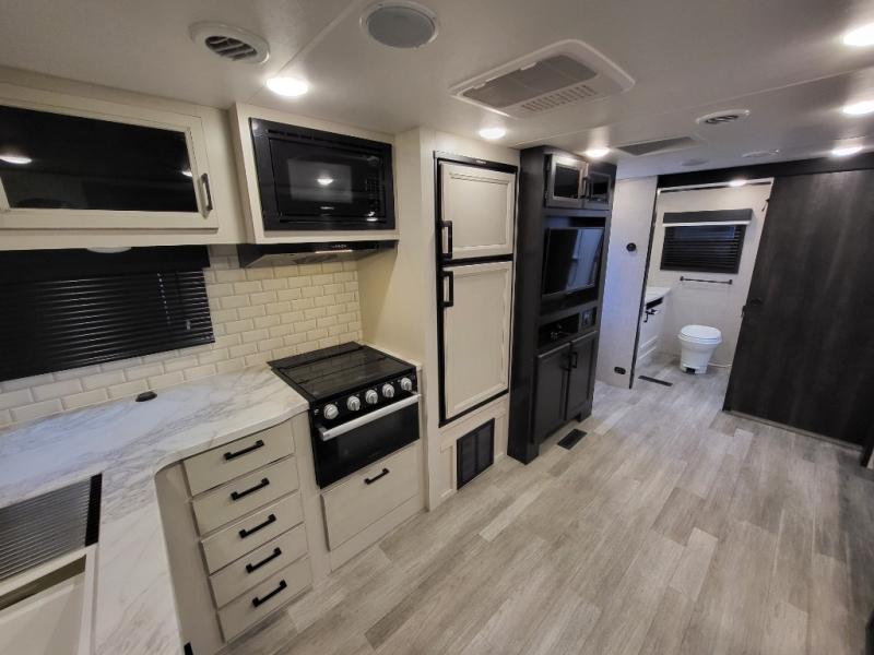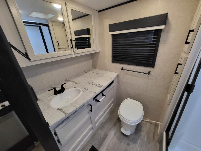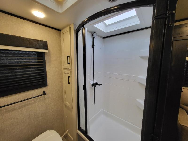 Looking for convenience and privacy in your next RV? Well this full rear bathroom has lots of room for you to move around as you get ready each morning in privacy! The front private bedroom has a walk-around 60" x 75" queen bed with wardrobes on either side to keep your clothes looking their best. You can enjoy home cooked meals while at the campsite thanks to the three burner cooktop and 6 cu. ft. refrigerator, plus there is a walk-in pantry to store all of your favorite snacks. The jackknife sofa and booth dinette within the slide out offer comfortable places to relax, yet you can switch the jackknife sofa out for the optional tri-fold sofa or the optional theater seating. You can even cook breakfast outdoors using the outside kitchen and stay protected from the elements by the 19' power awning!